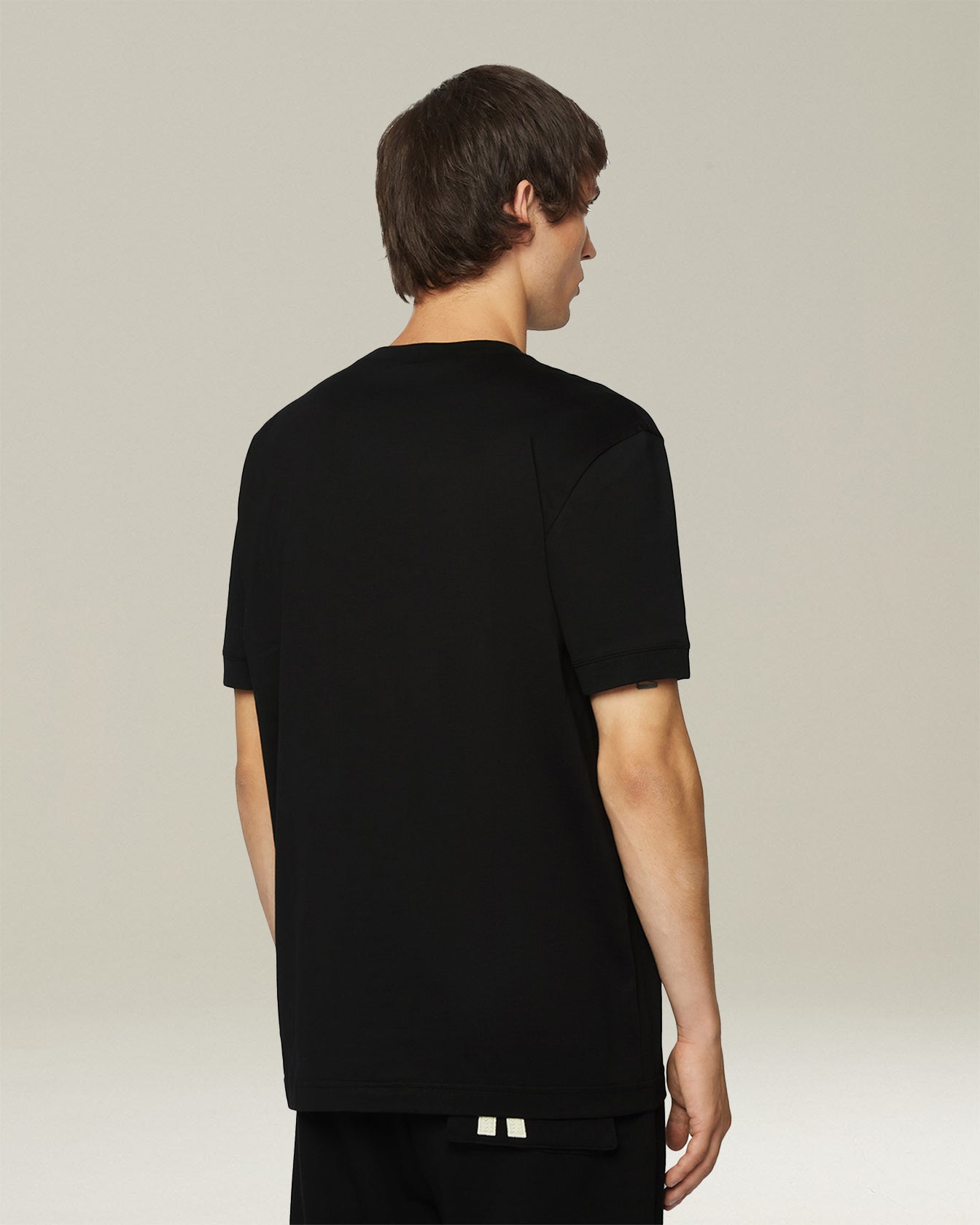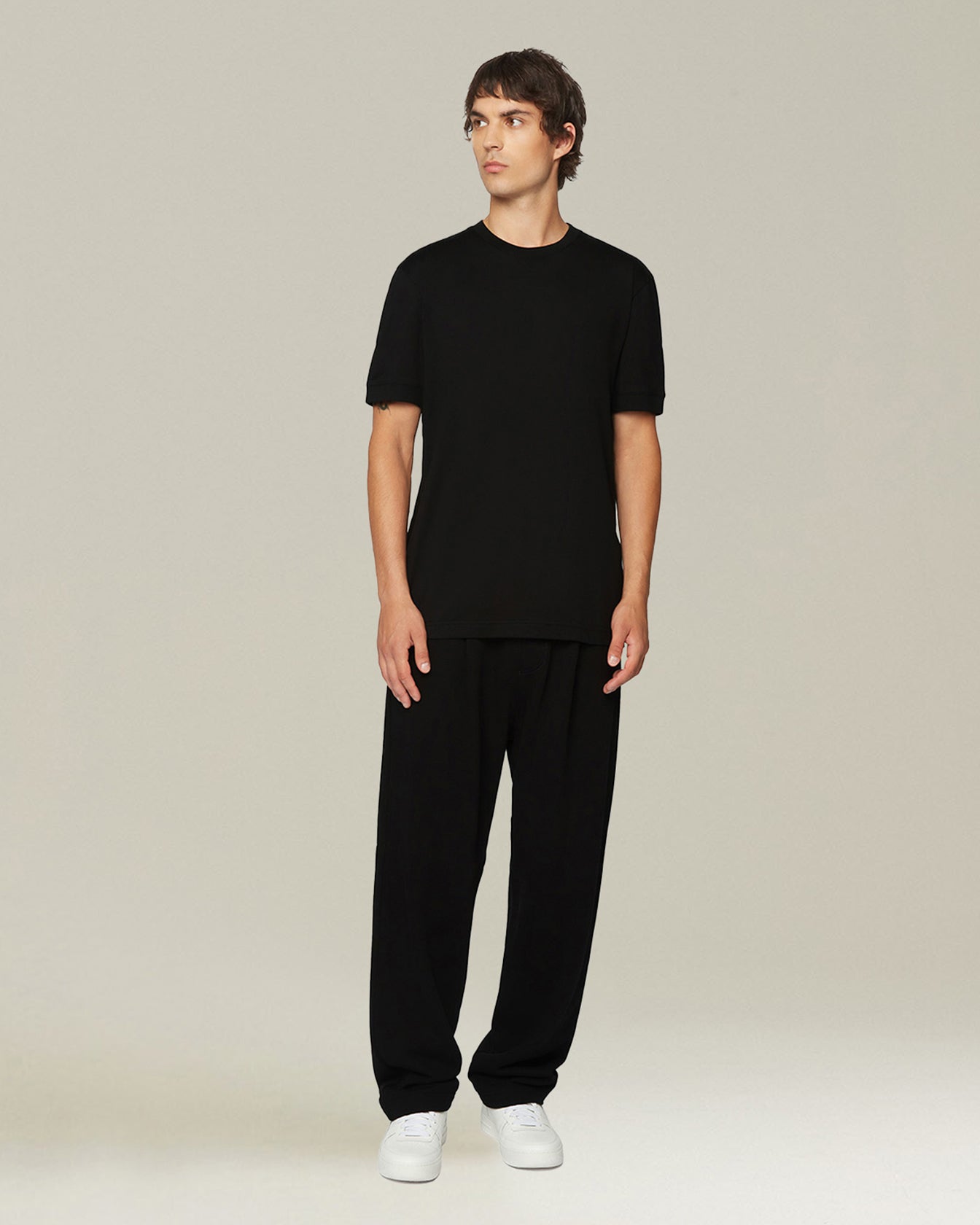 An interpreter of contemporary cultures and styles, these jogging trousers unite everyday comfort and sophisticated aesthetics, embodying a dynamic, modern, urban attitude. Crafted from soft cotton knit, this fabric reveals a free-spirited approach with an enveloping, naturally stretchy character. The design of the trousers is characterised by a large volume that ensures a relaxed, fluid fit, allowing unparalleled freedom of movement. The waist is elasticated and features an adjustable drawstring, which allows the trousers to be easily adapted to the body, ensuring a secure, personalised fit. The tailored dart detail enhances the appearance of the trousers, adding a touch of elegance and improving the fit. The back pocket is decorated on the rear with an embossed graphic of the new KNT logo lettering that becomes a sinuous contrasting graphic sign.