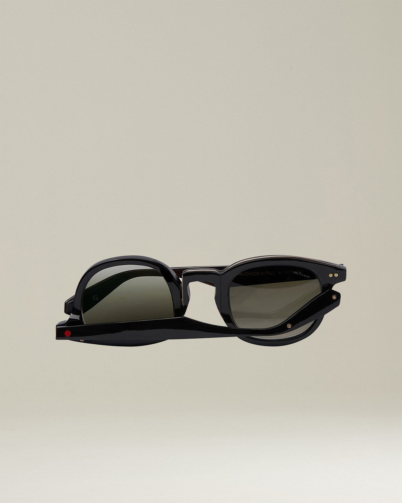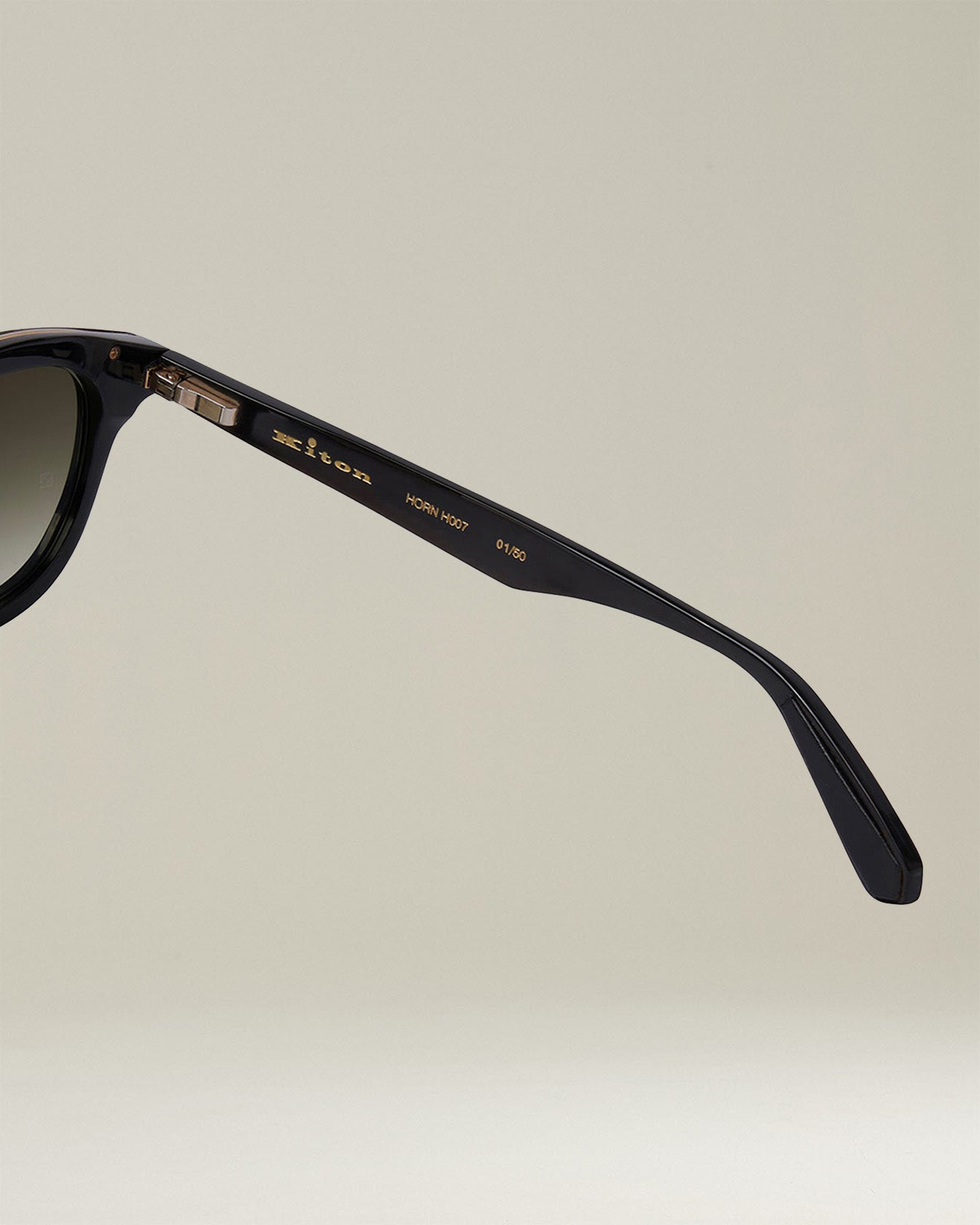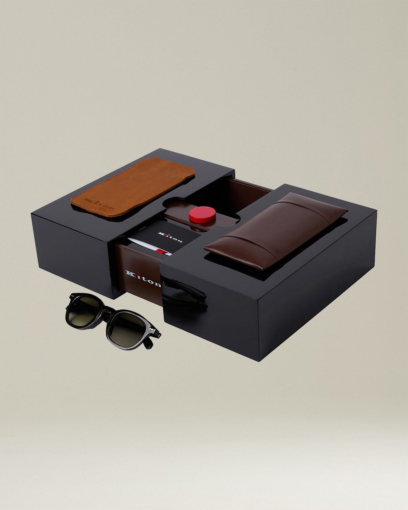 Limited edition numbered horn sunglasses in black with green shaded lenses. Inspired by the iconic Panto design dedicated to the great architect Le Corbusier, and consecrated by Hollywood’s Golden Age as a protagonist of 20th century American culture, the frame has a thick round shape and has been reinterpreted in a modern way to give the glasses a strong personality and a casual attitude in keeping with the refined aesthetics and relaxed elegance of Kiton. The horn is Indian buffalo horn, a lightweight natural material, the colour variations of which make each piece unique. In full compliance with environmental and animal welfare standards, the horns used to make the glasses come from buffaloes bred naturally for their meat who have died of natural causes. Innovation. Quality. Italian soul: Kiton horn sunglasses are handcrafted in Italy and use a revolutionary patented frame rotation system that protects the lenses from scratches and impact by overlapping the temples on both sides ofthe frame. The Zeiss 4-base nylon lenses feature an anti-reflective coating on the back as well as a scratch-resistant, oil-phobic and hydrophobic coating.