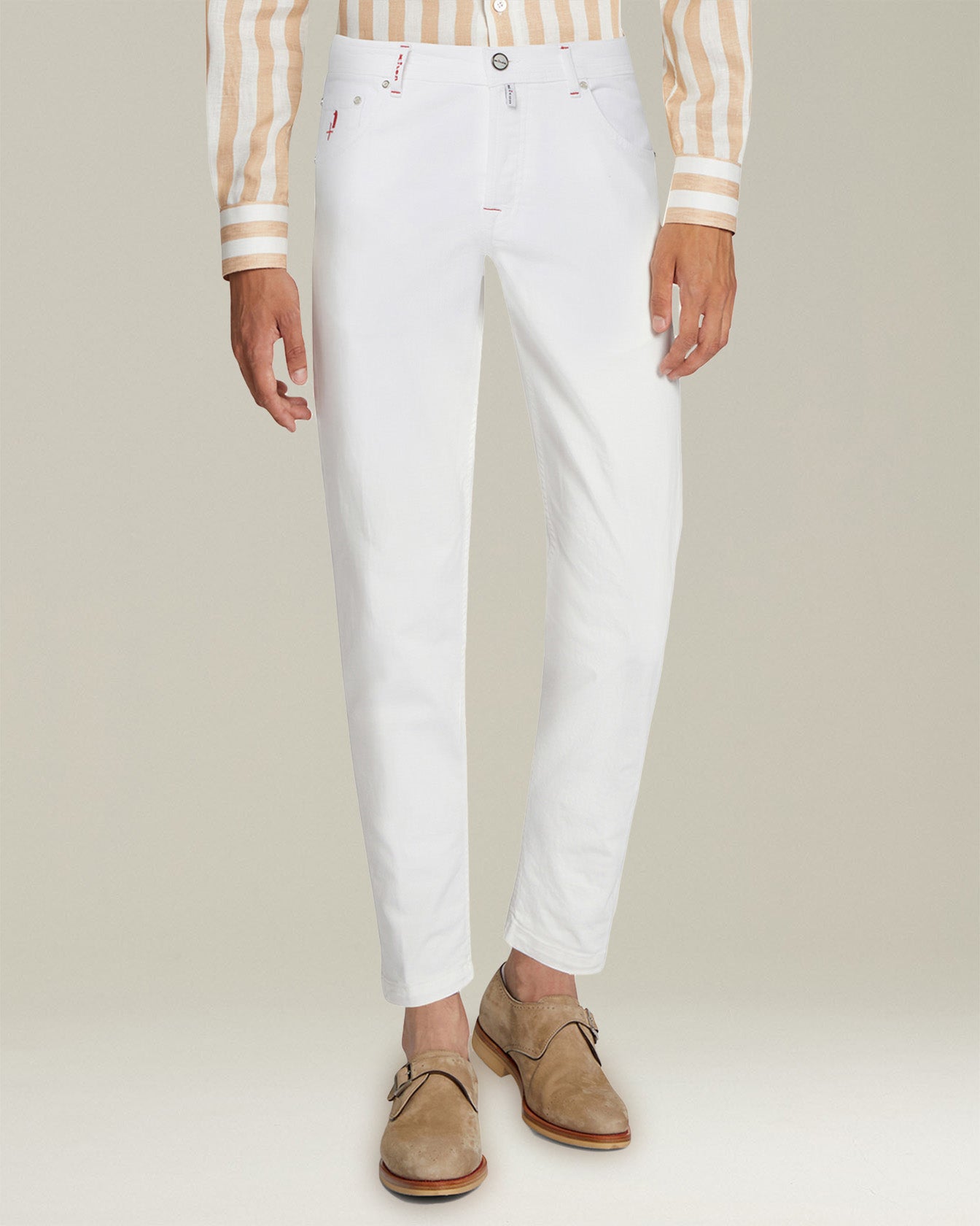 These five-pocket low-rise jeans come in white denim and flaunt an ultra-slim fit. An iconic piece when it comes to contemporary, laid-back elegance, Kiton jeans combine their light weight with durability thanks to the double seams that make them indestructible. The small percentage of elastane makes these jeans extremely comfortable: the fabric gently encloses the leg without compromising the shape. These non-pleated jeans feature tonal top-stitching, red bar tacks and contrasting red kick tape that reinforces the hem. The hem is 19.5 cm on a size 50. We recommend hand-washing the garment inside-out at 30ºC.