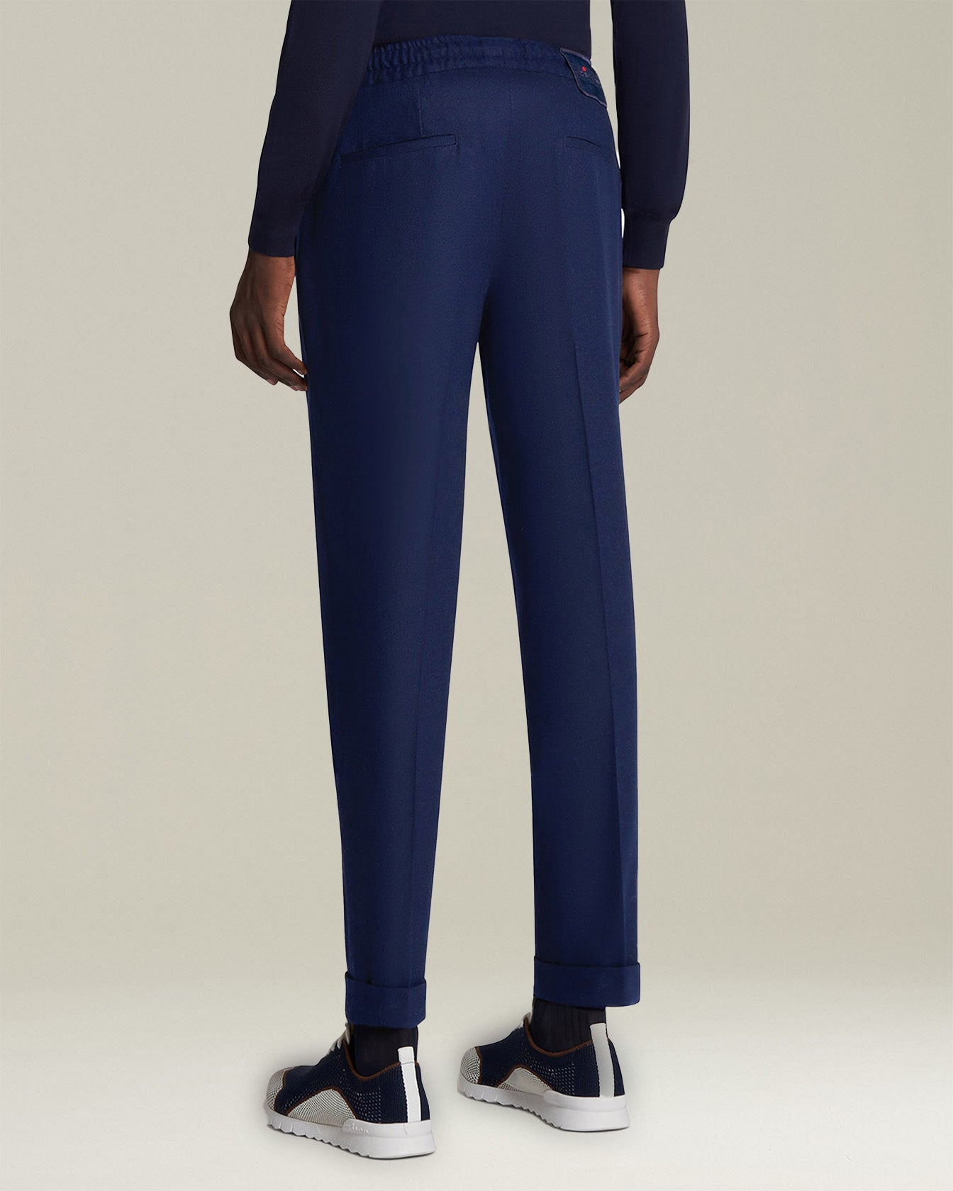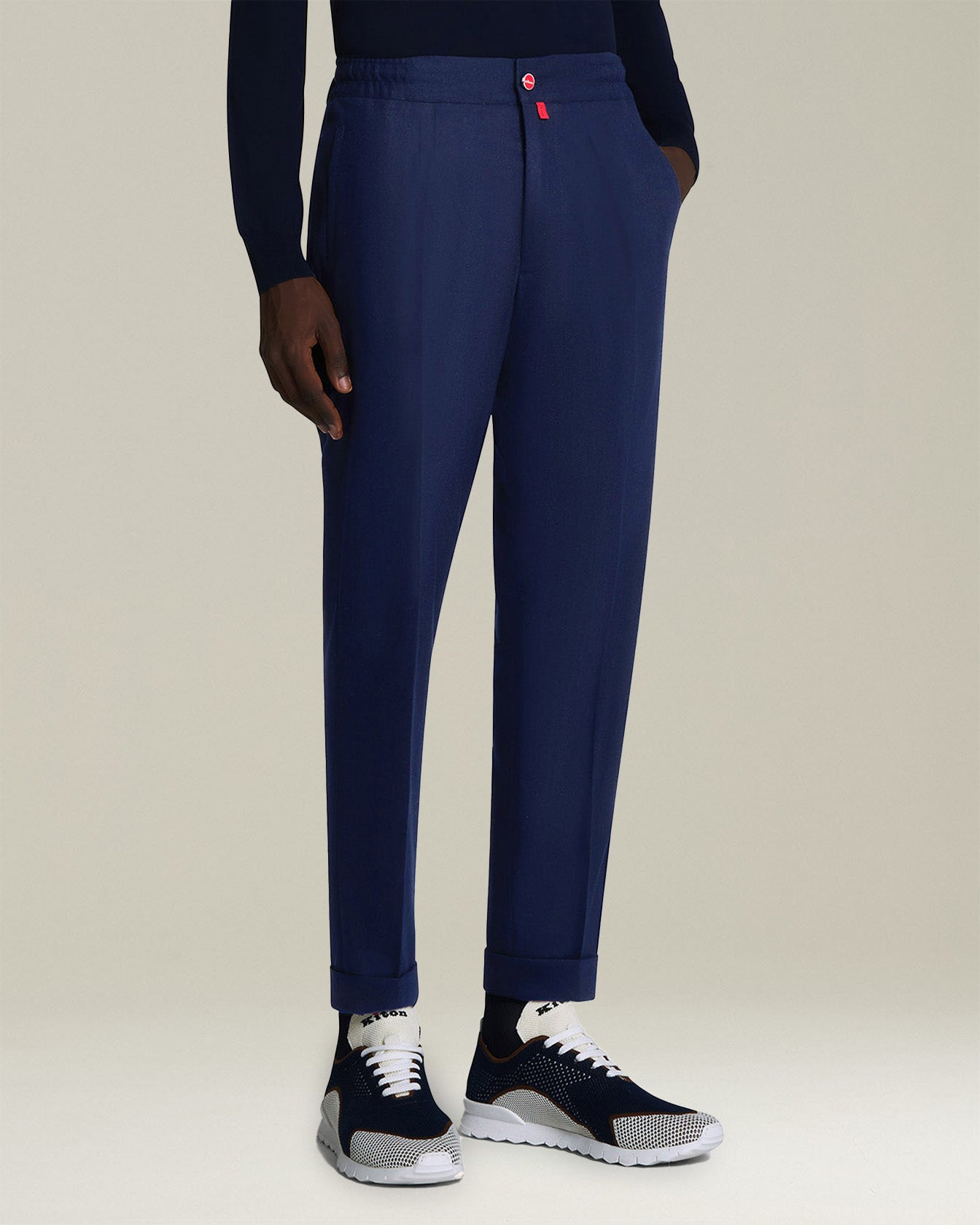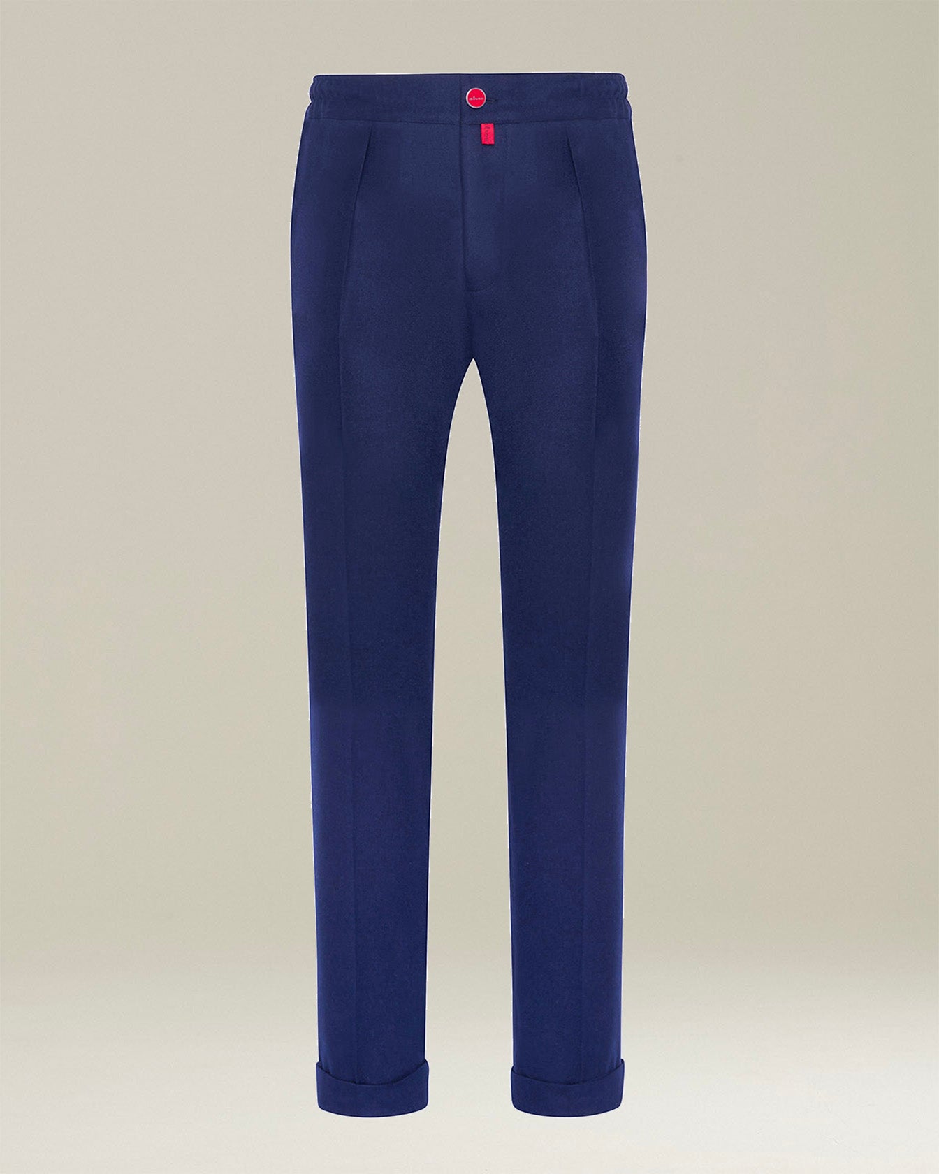 Blue jogger trousers made from soft wool. The Kiton trouser, an icon of casual style, is reinterpreted with a relaxed twist thanks to volumes that are relaxed on the pelvis, wide on the leg and narrower at the bottom in order to offer an authentic experience of comfort. The drawstring waist with a sporty soul meets darts inspired by the world of tailoring to express the casual and elegant vocation of the garment. The opening of the leg is 18 cm on a base size of 50 (Italian). We recommend hand washing inside-out at 30 C.