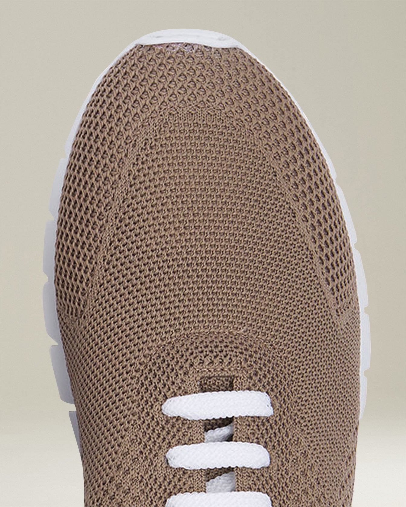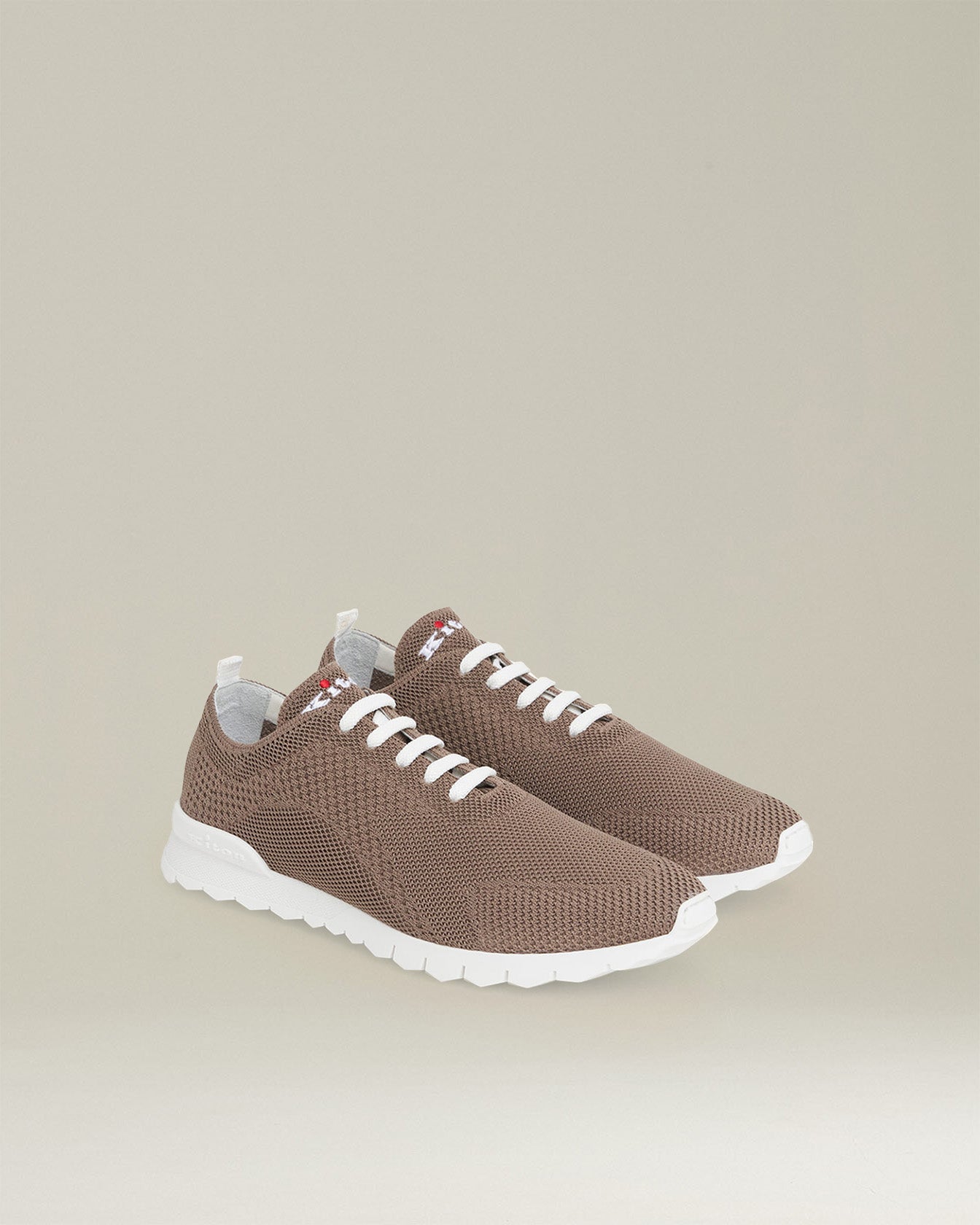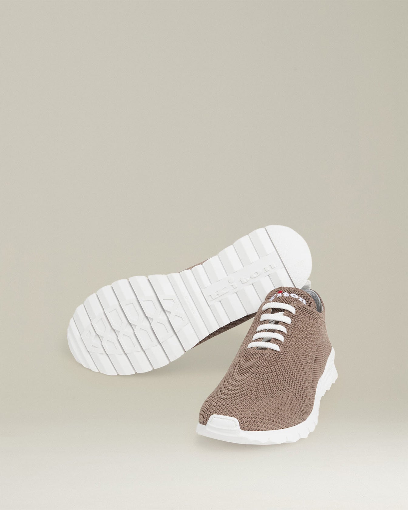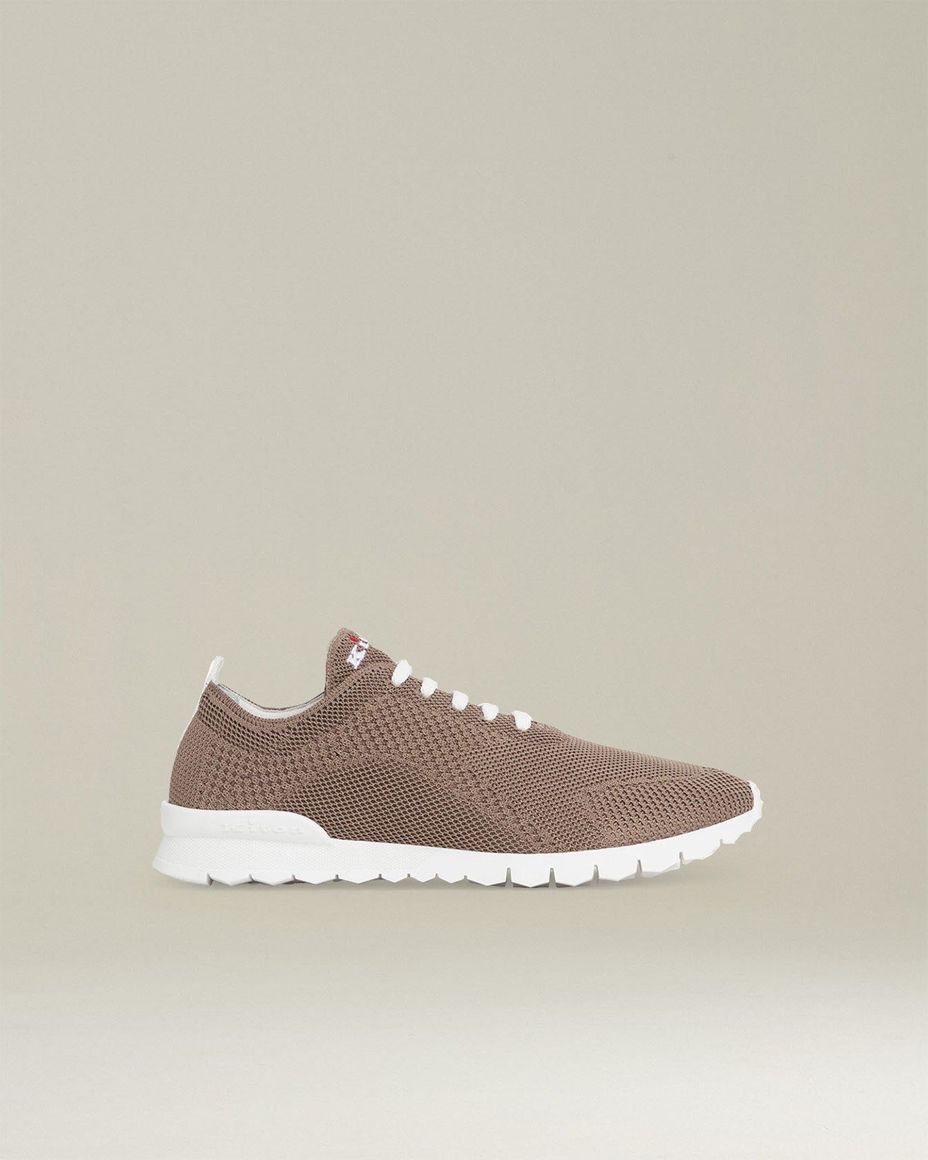 “FIT” model trainers in khaki-coloured knitted fabric. These trainers feature a one-piece upper; the structure is in Kiton knit fabric, rendered unique by the graphic juxtaposition of different stitches. The white sole is flexible and extra-light under foot, and is combined with an elasticated tongue for added comfort. Embroidered Kiton logo; stretch mesh laces which feature the iconic red aglet. All Kiton products are made by expert artisans in our atelier in Naples. The Kiton mission is to innovate in terms of aesthetics and technique, while always keeping tradition in mind. For this item, we’ve interpreted sneakers according to the philosophy of the fashion house, placing quality first and foremost. The benefit of hand-made products lies in their superior comfort: in this case, a particularly soft and ergonomic insole. Dry clean to keep them looking their best.