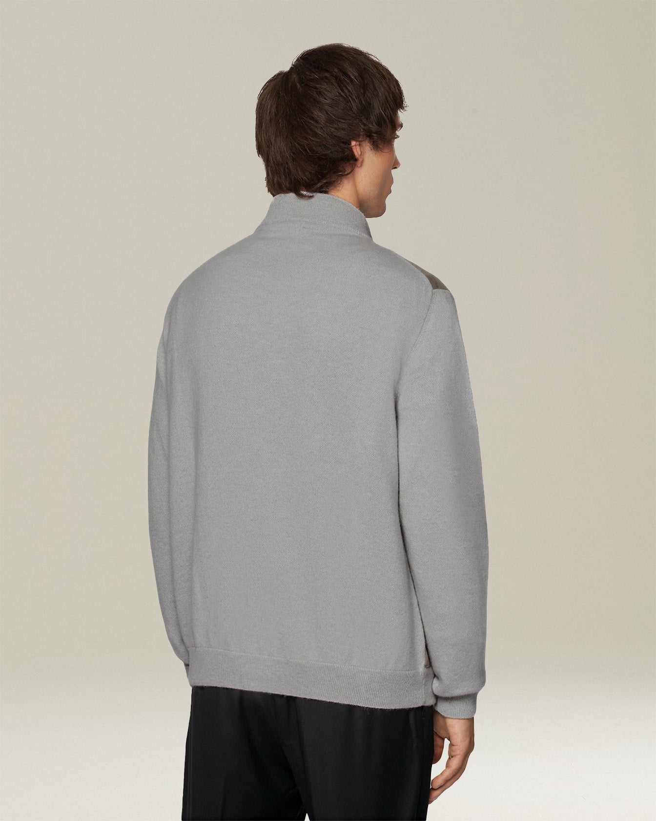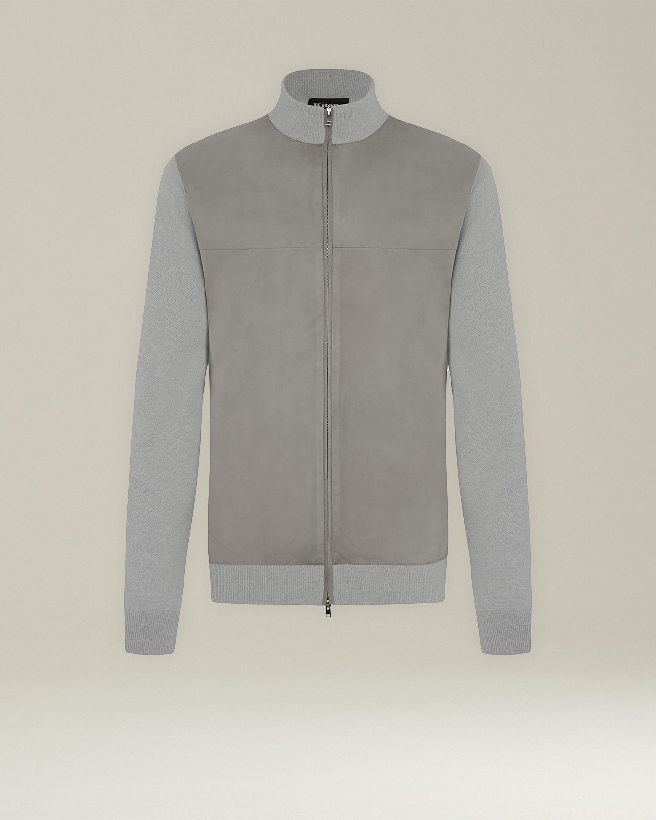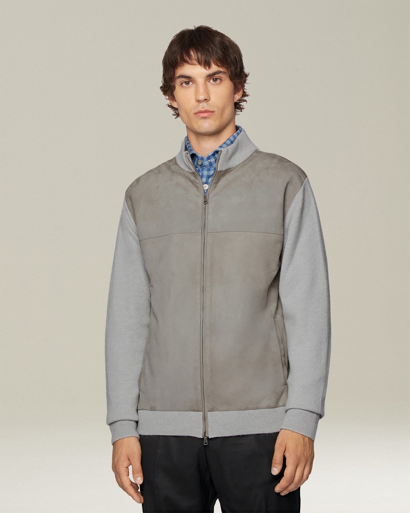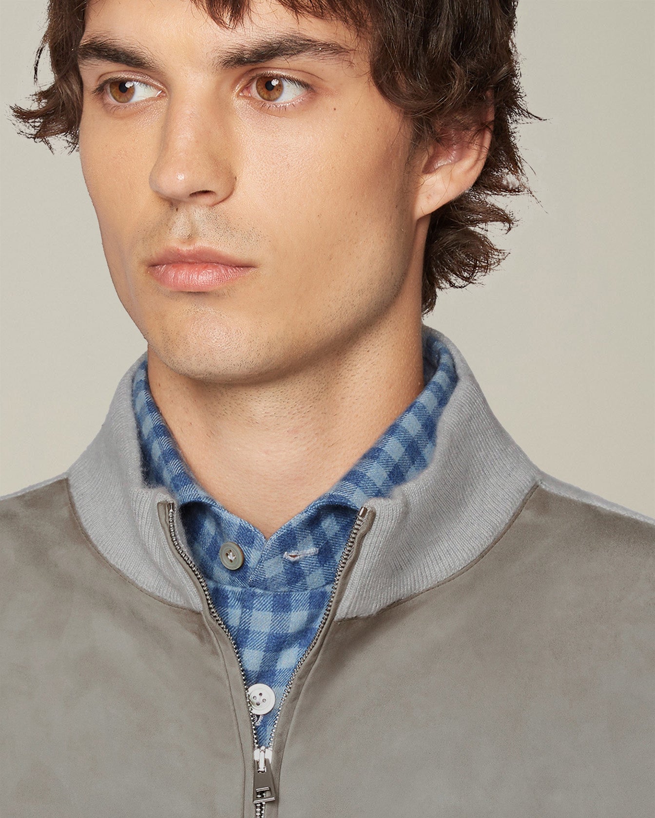 The softness and warm sophistication of cashmere, combined with the modernity and texture of suede, create a sophisticated, contemporary aesthetic, an impeccable fusion of luxury and innovation. This combination of materials not only enhances the design of the garment, but also offers an intriguing visual and tactile contrast. Inspired by the bomber jacket, this jumper combines elegance and comfort with quality craftsmanship to create an authentic example of stylistic innovation. It is the ideal garment for the man who wants to combine luxury and functionality in every detail of his clothing.