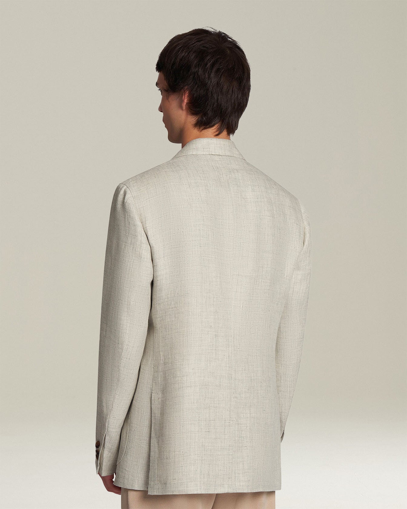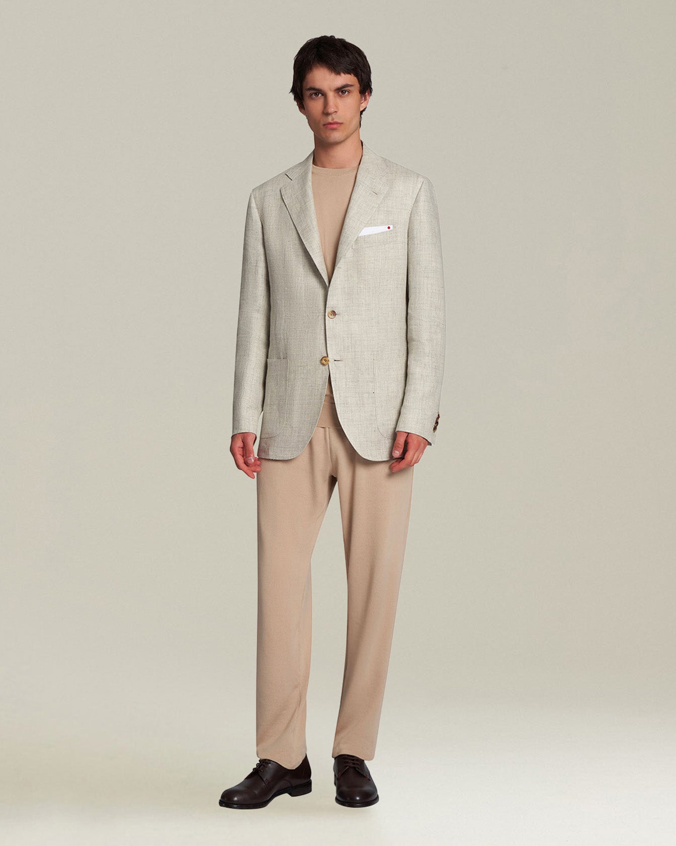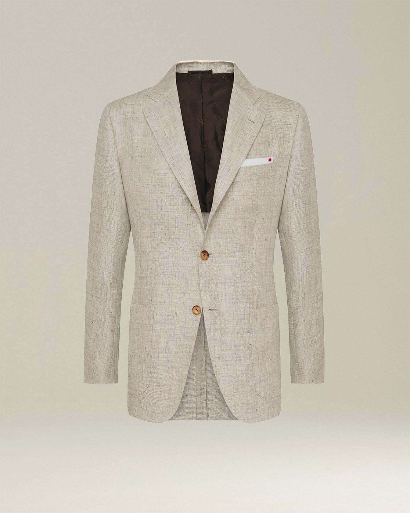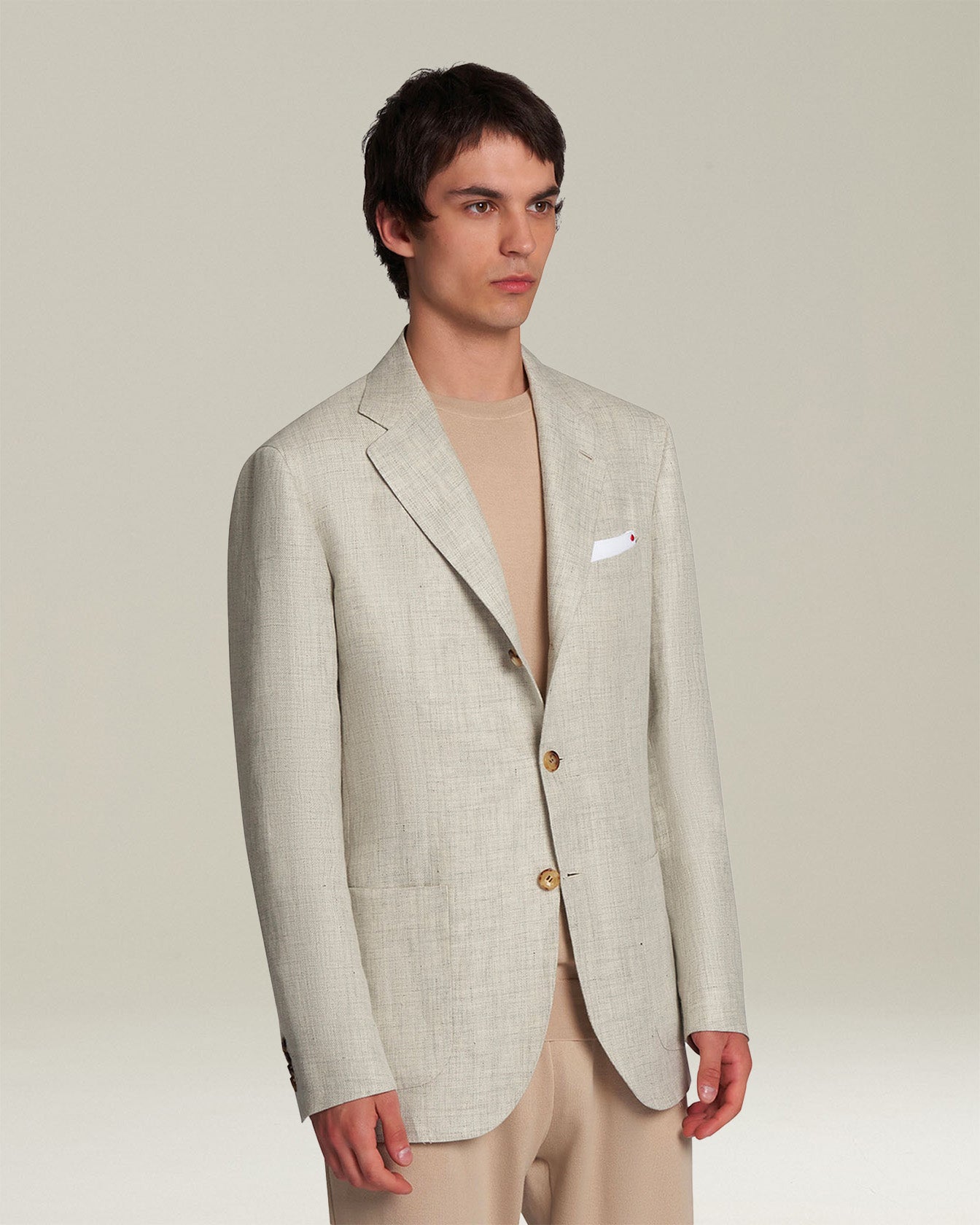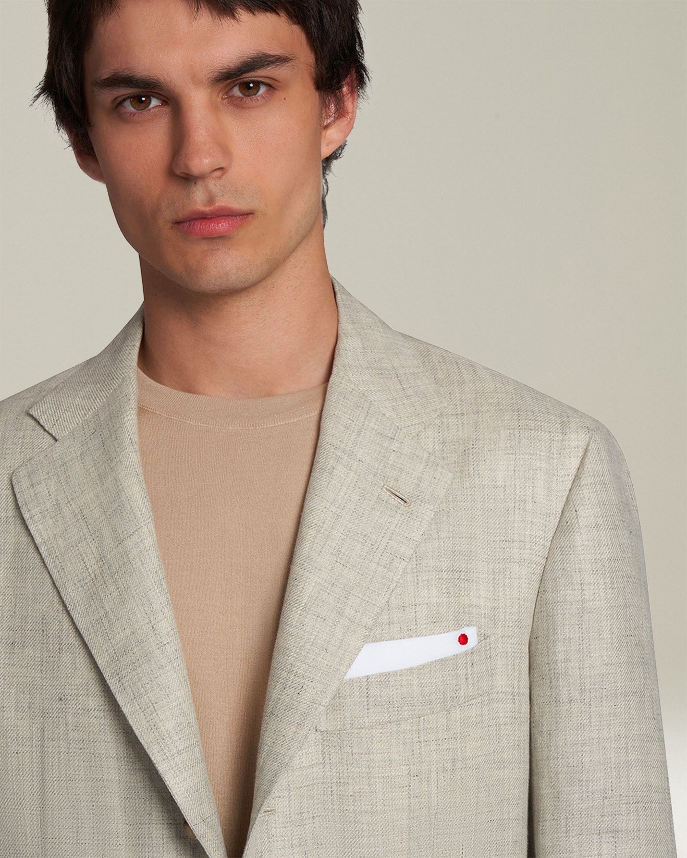 Single-breasted jacket made from distinguished Irish linen in beige. Finely crafted textiles have always been a cornerstone at Kiton: in our wool mill in Biella, Italy, constant experimentation has given rise to the creation of innovative textures and fibres, paying special attention to sustainability and the environment. The deconstructed nature of the garment and the use of soft yarn offer an authentic, personal experience of refined comfort that combines allure and freedom of movement with afocus on relaxed elegance. The cornerstones of the Kiton wardrobe change without losing their substance. The precision of haute couture blends with the comfort of leisurewear. Every Kiton jacket is a masterpiece of design, entirely cut and sewn by hand in Naples by 25 master tailors who carry out 1,800 steps to complete such fine architectural attire. Linen pocket square with a hand-embroidered red dot. Perfect for both leisure time and formal occasions, it will bring an elegant, sophisticated twist to casual looks. To maintain the beauty of your Kiton jacket, we recommend professional laundering and pressing.