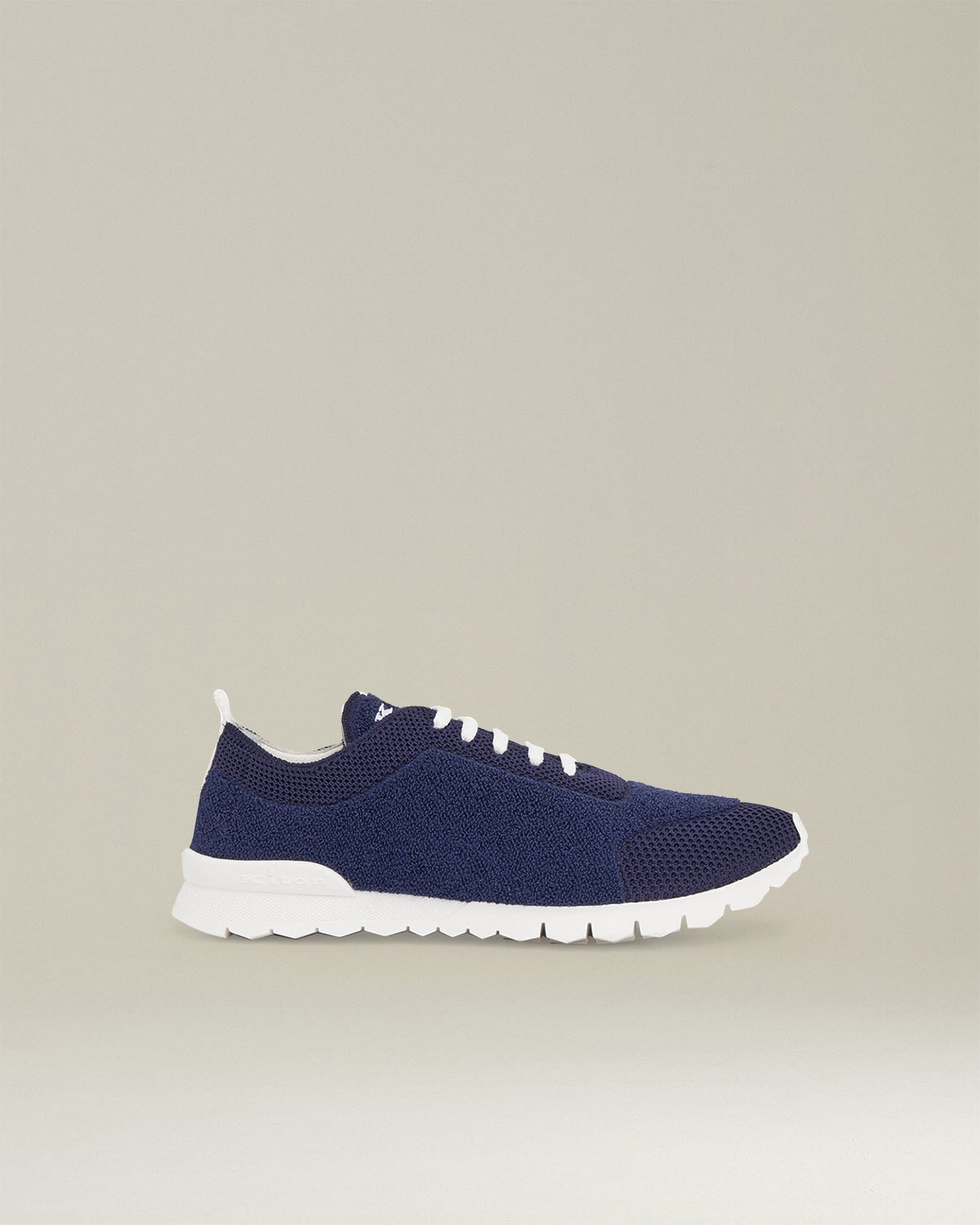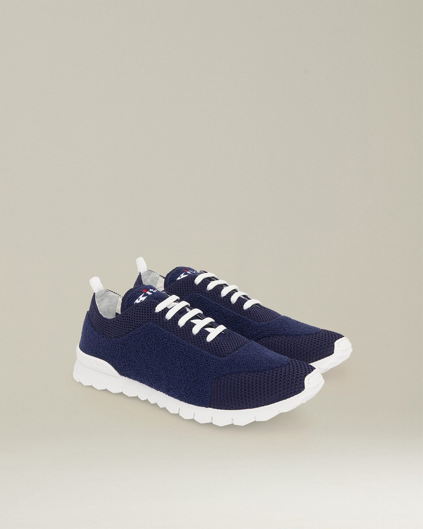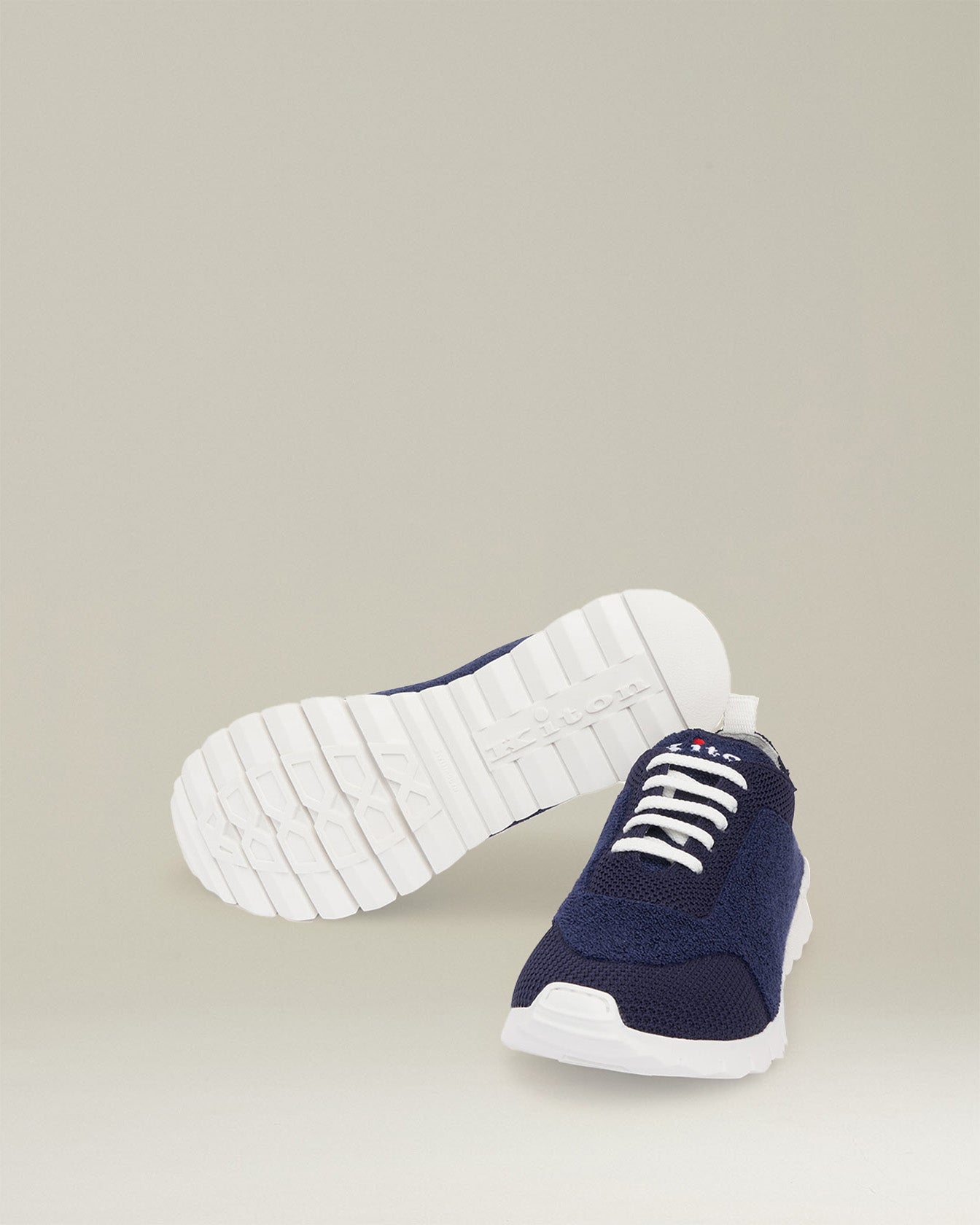 Navy blue knit sneakers. The one-piece upper of these trainers is in Kiton knit fabric with bouclé effect details, which makes them even more comfortable and warm. The white sole is flexible and extra-light under foot, and is combined with an elasticated tongue for added comfort. Embroidered Kiton logo; stretch mesh laces which feature the iconic red aglet. All Kiton products are made by expert artisans in our atelier in Naples. The Kiton mission is to innovate in terms of aesthetics and technique, while always keeping tradition in mind. For this item, we’ve interpreted sneakers according to the philosophy of the fashion house, placing quality first and foremost. The benefit of hand-made products lies in their superior comfort: in this case, a particularly soft and ergonomic insole. Dry clean to keep them looking their best.