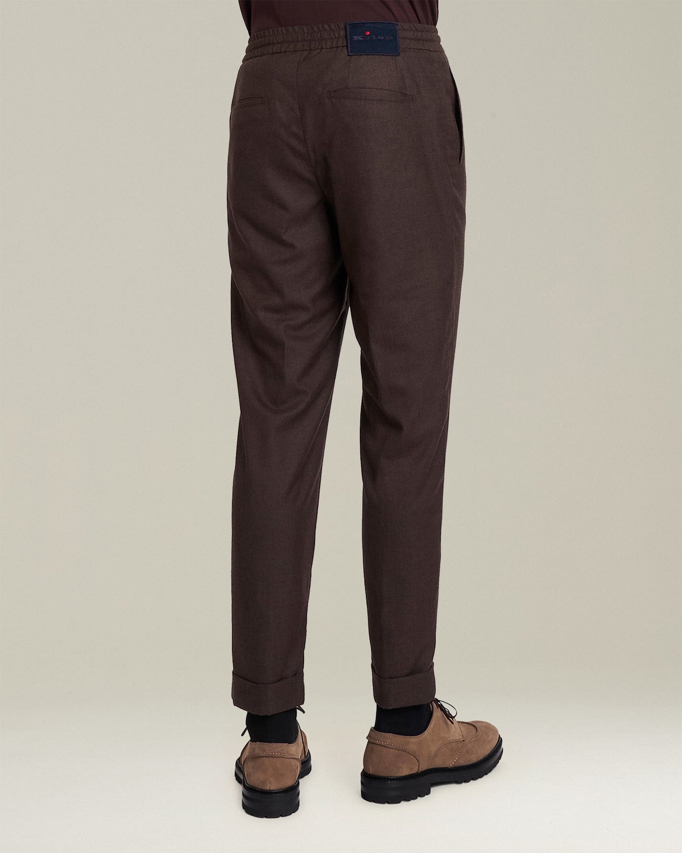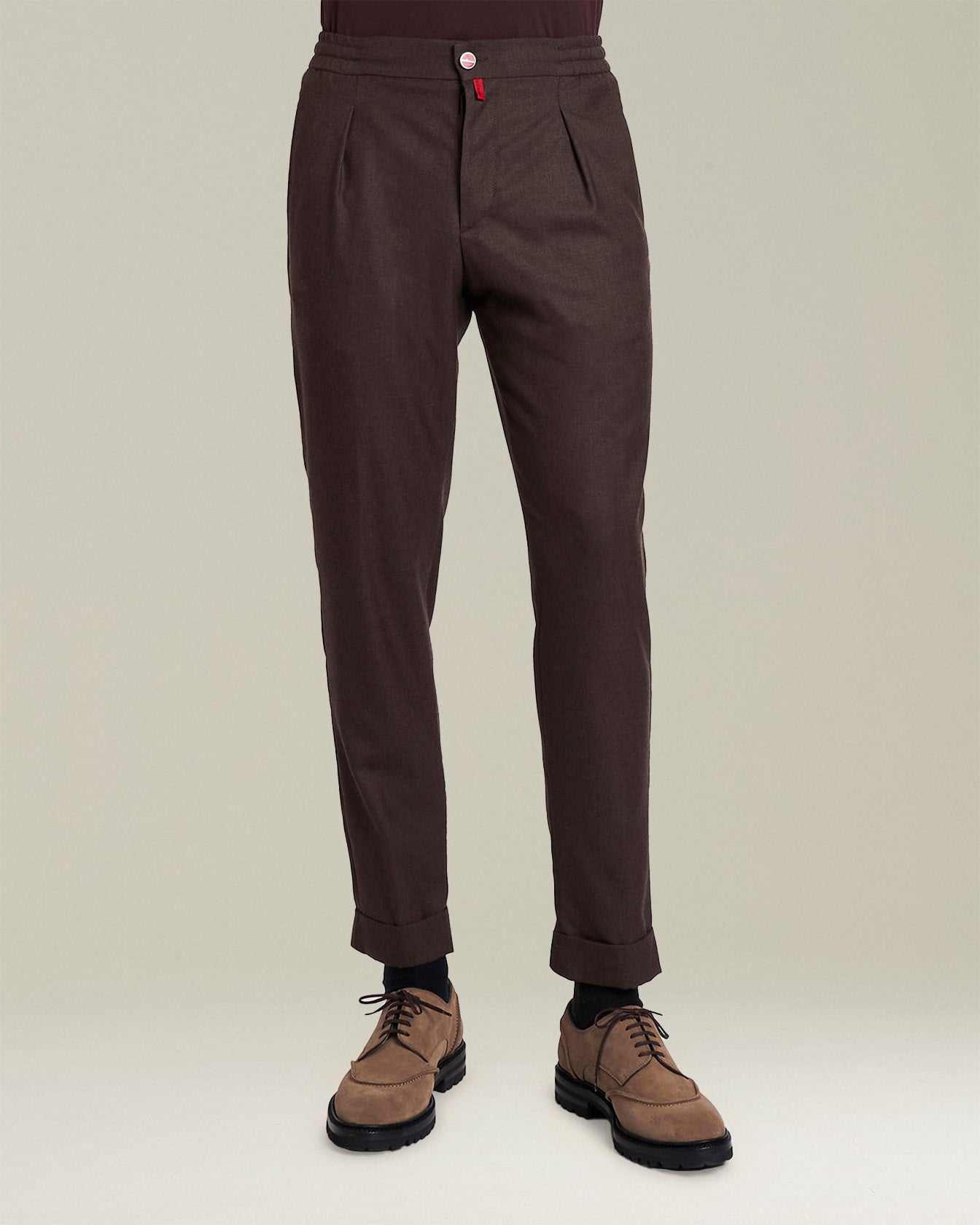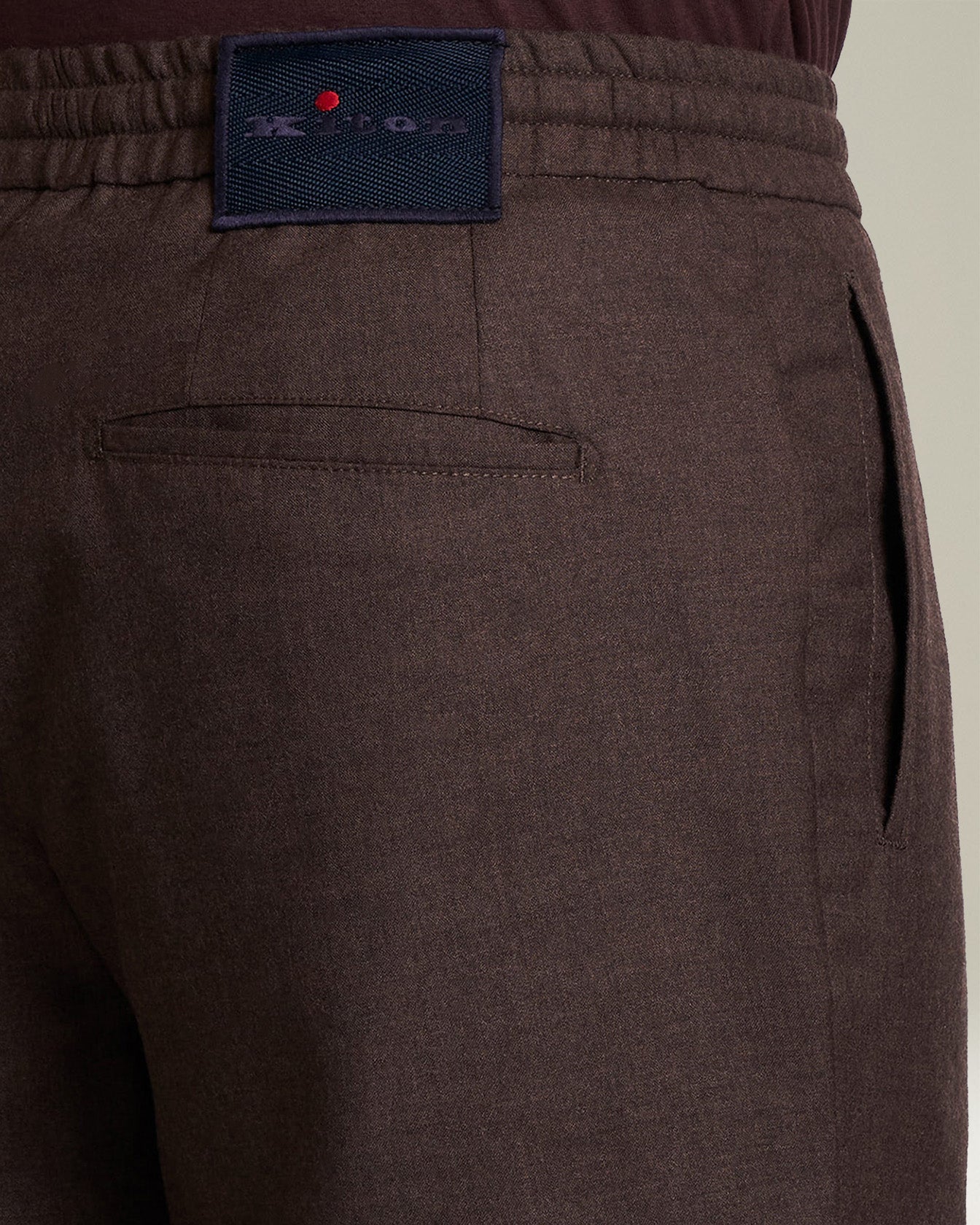 Drawstring trousers made from grey lyocell, a superb fabric with a super-soft handle. An icon of laid-back luxe, the Kiton trousers have been given an even more dégagé spin with a looser and more comfortable fit. The fabric gently swathes the leg, flattering the figure without any sense of restriction. It features flat pockets and an inverse pleat. The elasticated adjustable drawstring at the waist has been finished on the tip with a Kiton-lasered toggle. The trouser bottom measures 18 cm for astandard size 50. Enhanced with a light-wash treatment. We recommend washing this garment by hand inside out and at 30° C.
