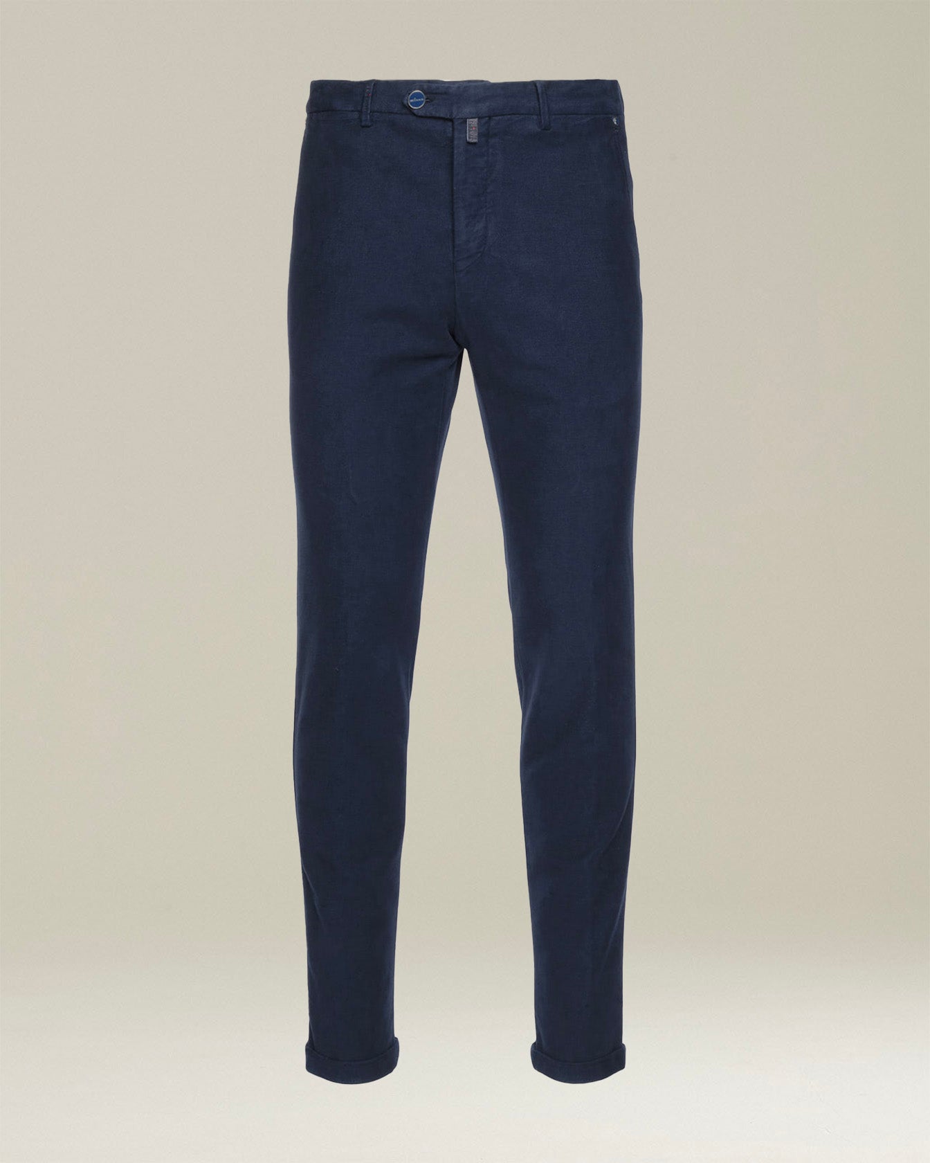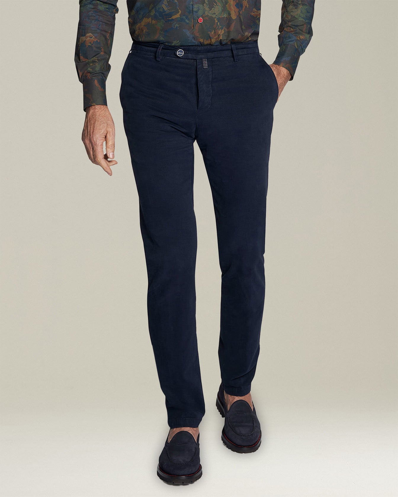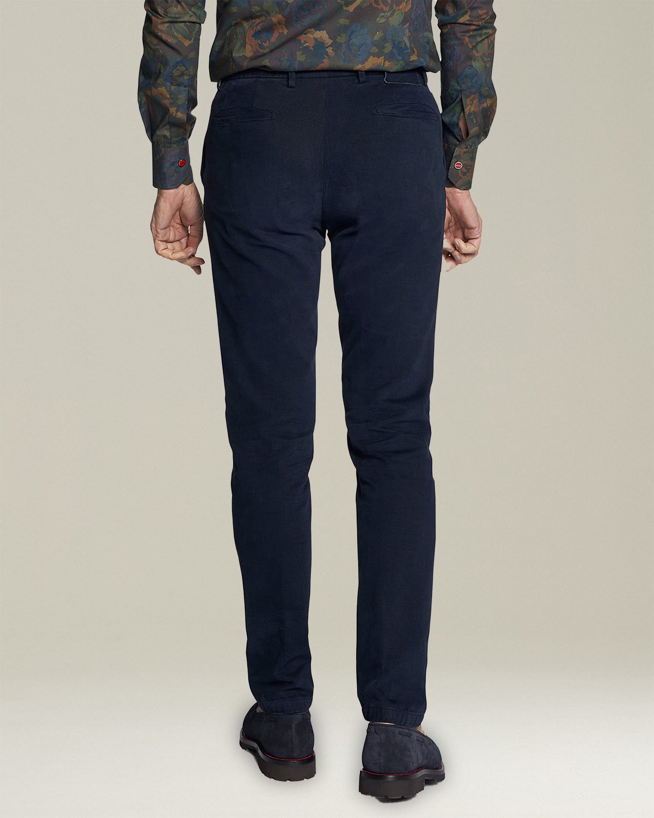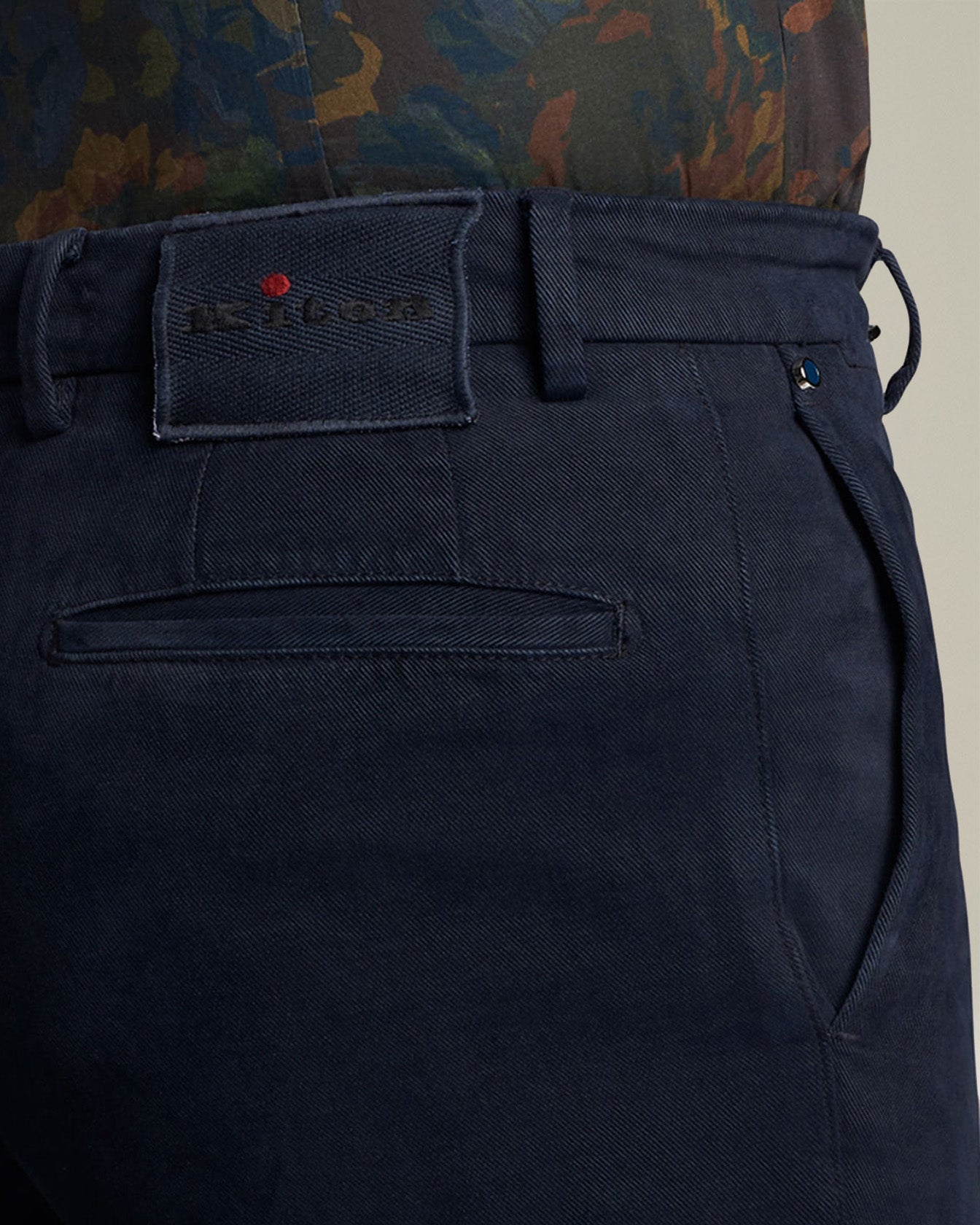 Navy-blue trousers made from cotton and cashmere with ''American''-style pockets without darts and tonal stitched detailing. A small quantity of elastane gives these Kiton trousers just the right amount of ''give'' and the fabric gently swathes the leg, flattering the figure without any sense of restriction. Slim fit. The trouser bottom measures 18 cm for a standard size 50. Enhanced with a light-wash treatment. We recommend washing this garment by hand inside out and at 30° C.
