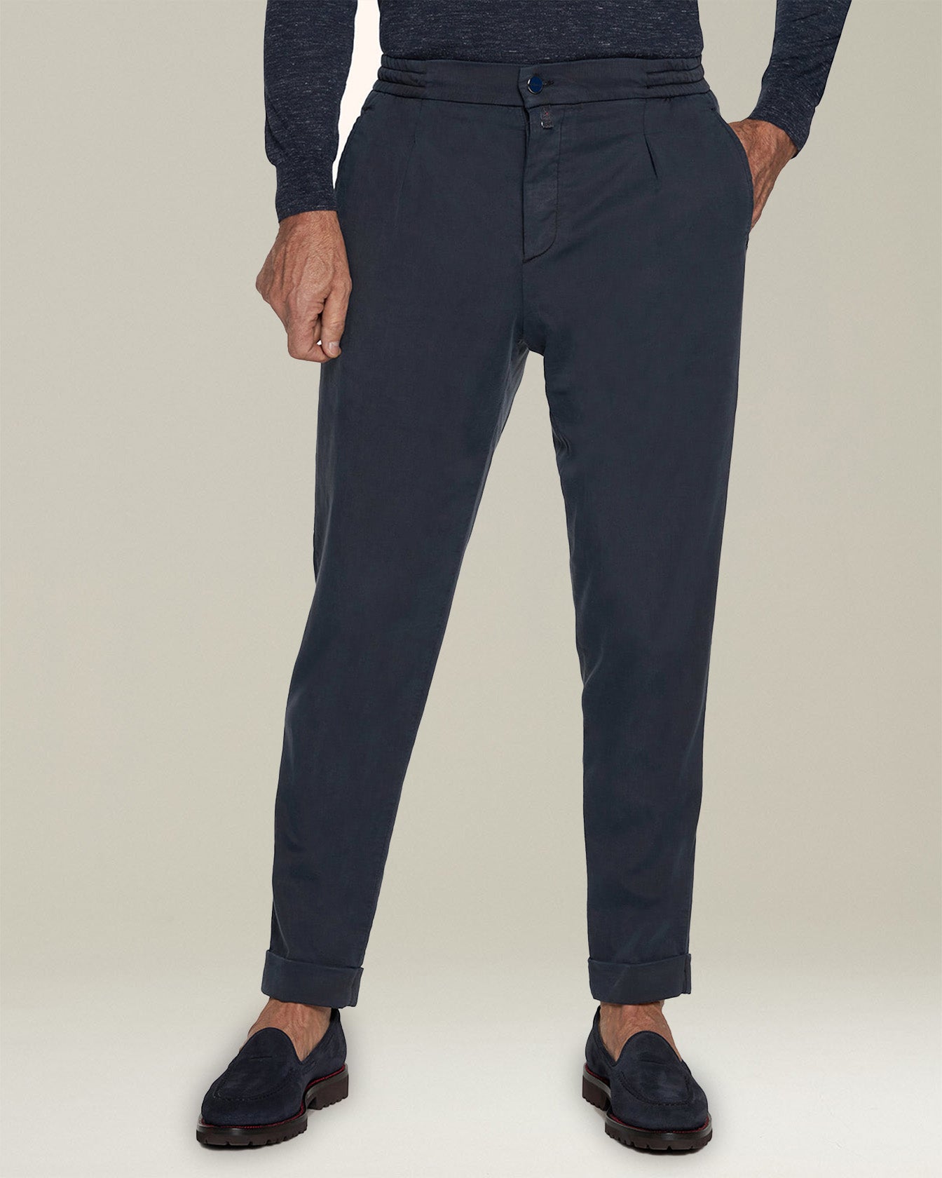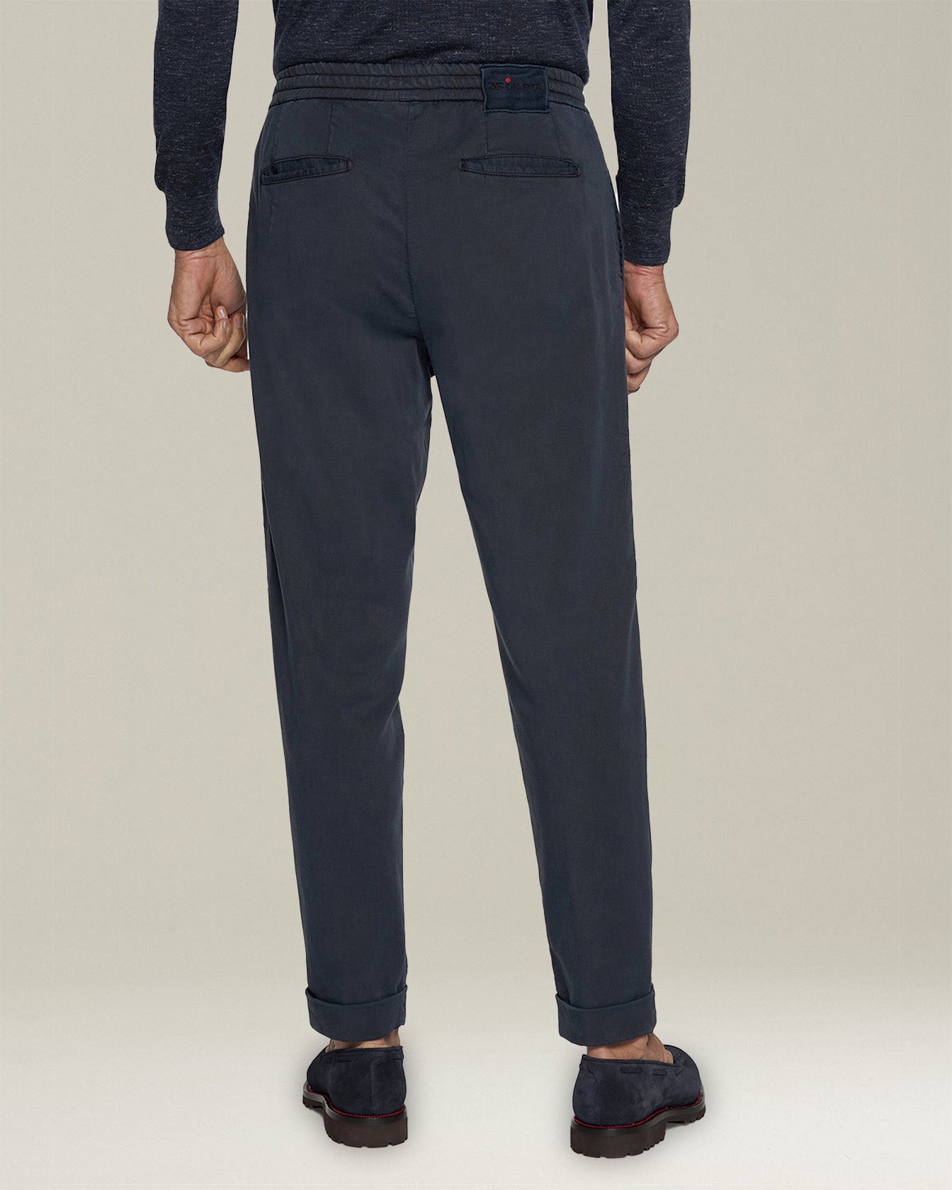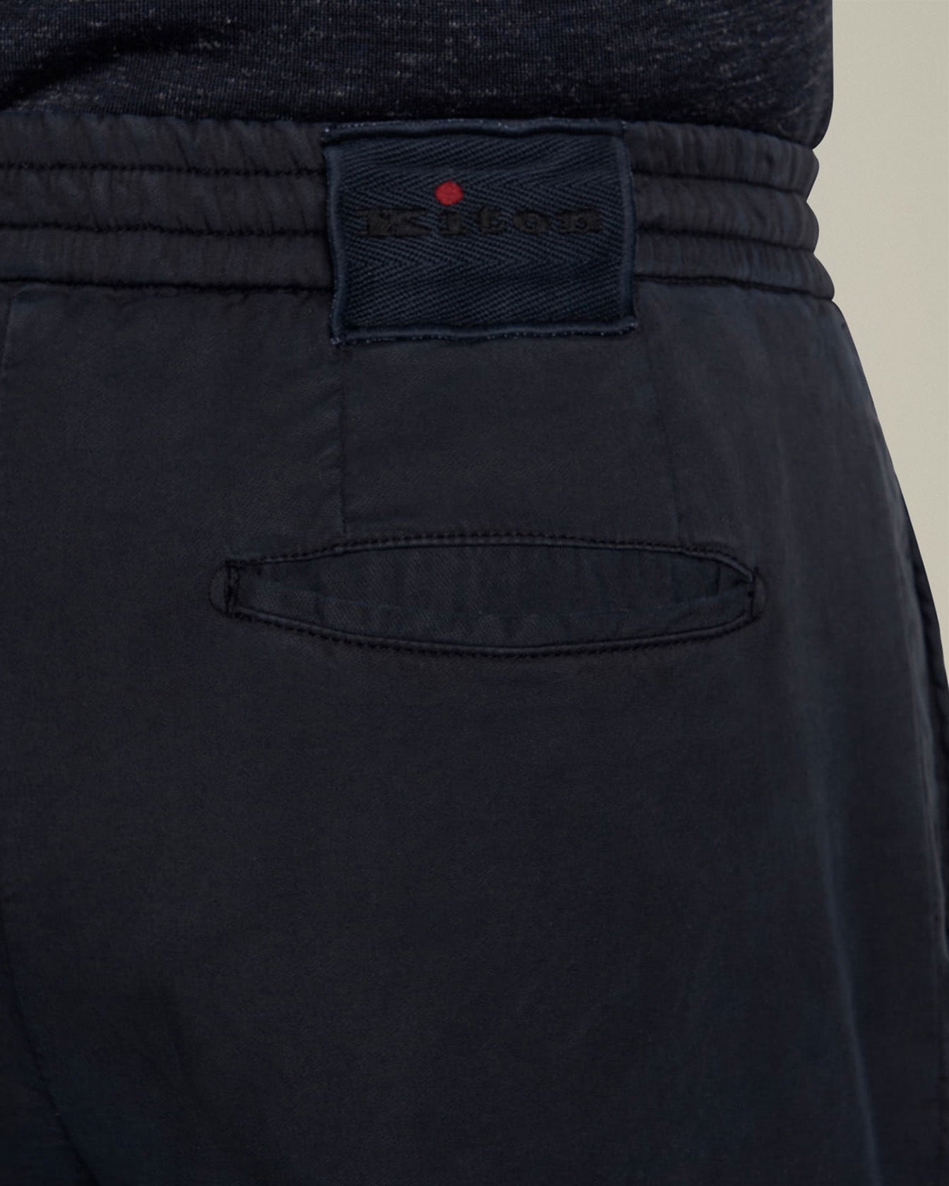 Drawstring trousers made from navy-blue lyocell and cotton, a superb blend with a super-soft handle. An icon of laid-back luxe, the Kiton trousers have been given an even more dégagé spin with a looser and more comfortable fit. It features flat pockets and an inverse pleat. The elasticated adjustable drawstring at the waist has been finished on the tip with a Kiton-lasered toggle. A small quantity of elastane gives these Kiton trousers just the right amount of ''give'' and the fabric gently swathes the leg, flattering the figure without any sense of restriction. The trouser bottom measures 18 cm for a standard size 50. Enhanced with a light-wash treatment. We recommend washing this garment by hand inside out and at 30° C.