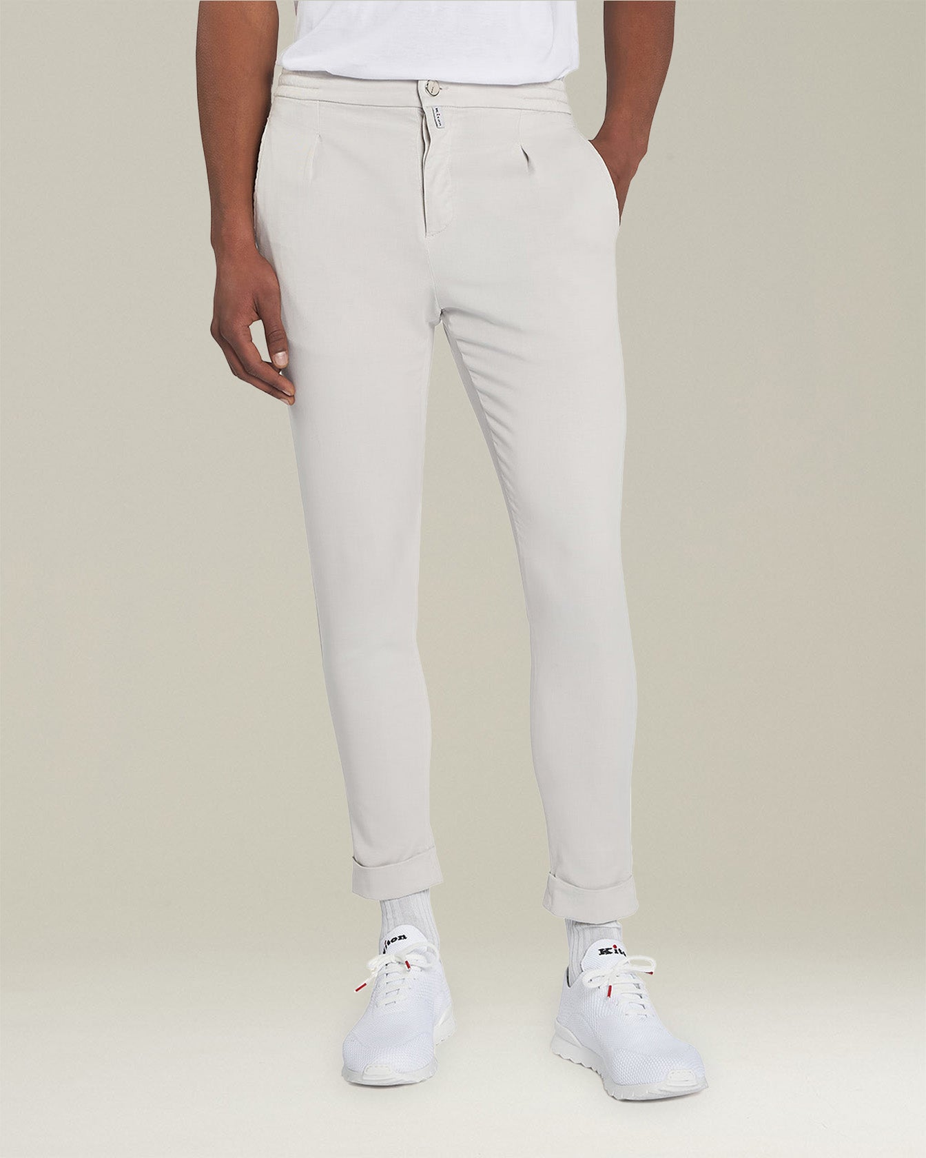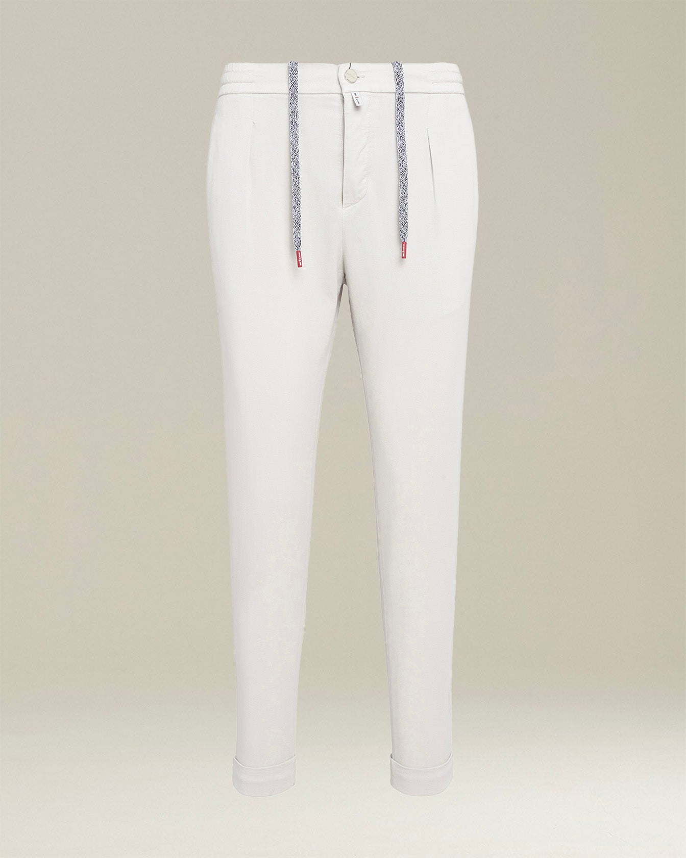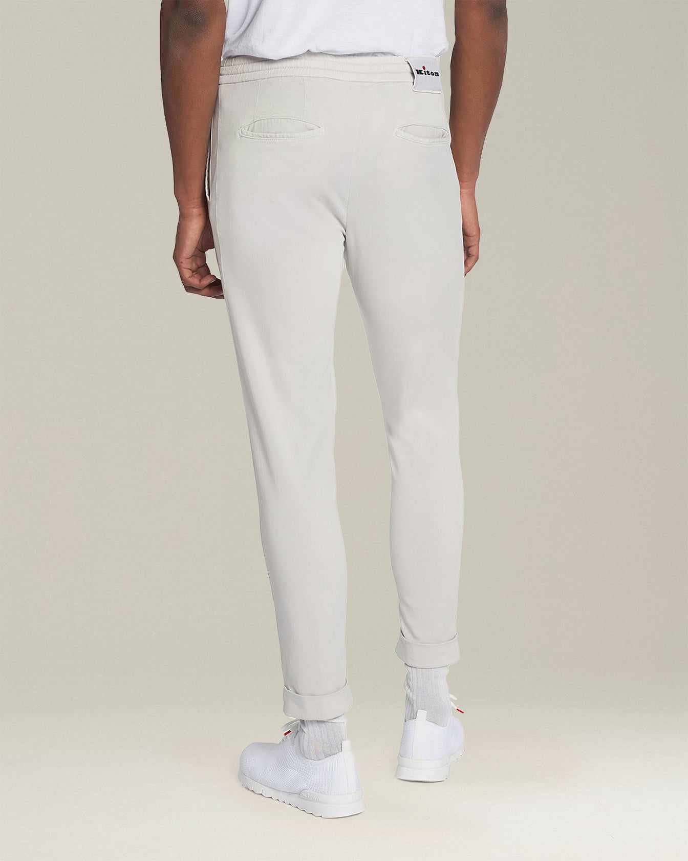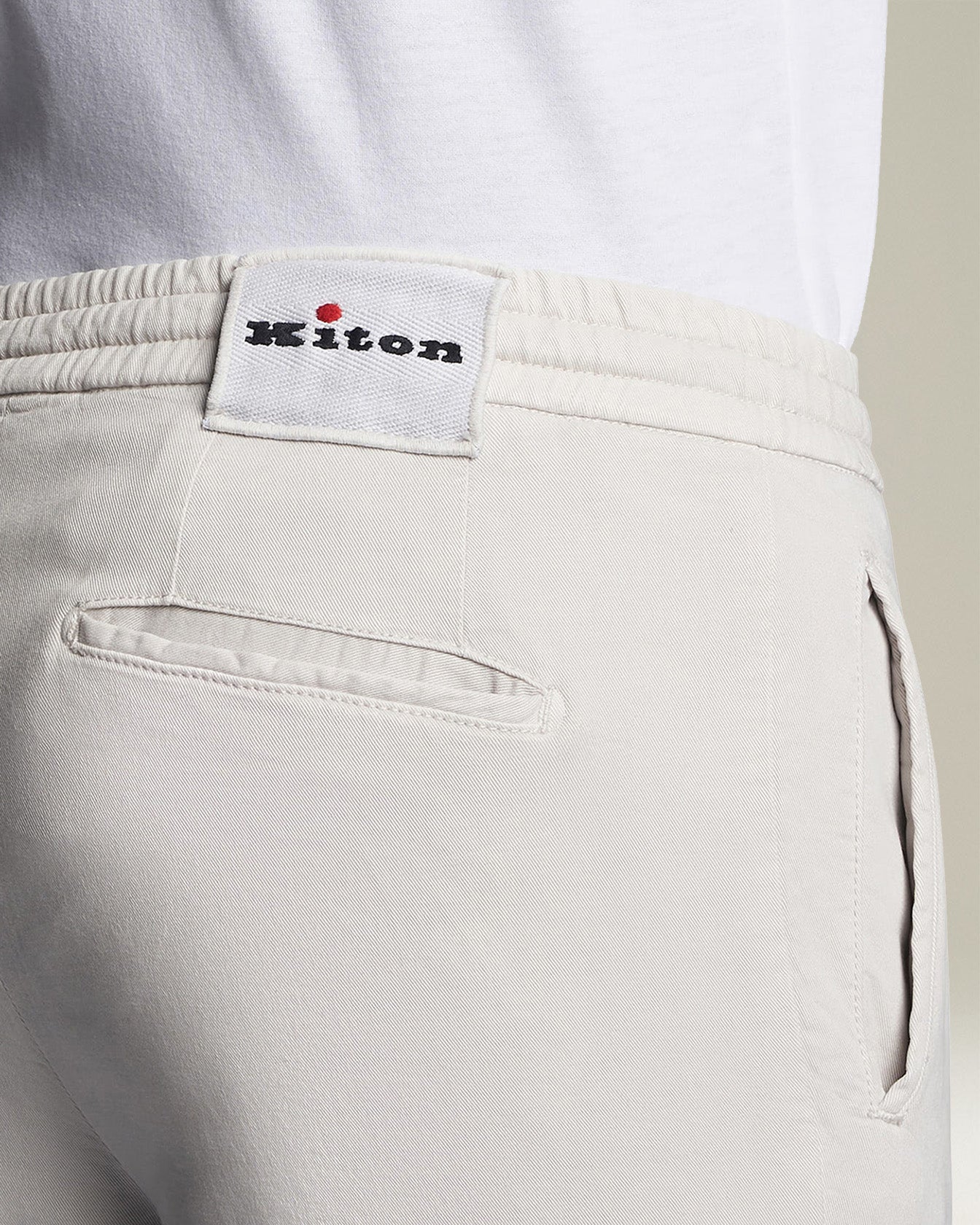 Drawstring trousers made from glacier-grey lyocell, a superb fabric with a super-soft handle. An icon of laid-back luxe, the Kiton trousers have been given an even more dégagé spin with a looser and more comfortable fit. It features flat pockets andan inverse pleat. The elasticated adjustable drawstring at the waist has been finished on the tip with a Kiton-lasered toggle. A small quantity of elastane gives these Kiton trousers just the right amount of ''give'' and the fabric gently swathes the leg, flattering the figure without any sense of restriction. The trouser bottom measures 18 cm for a standard size 50. Enhanced with a light-wash treatment. We recommend washing this garment by hand inside out and at 30° C.