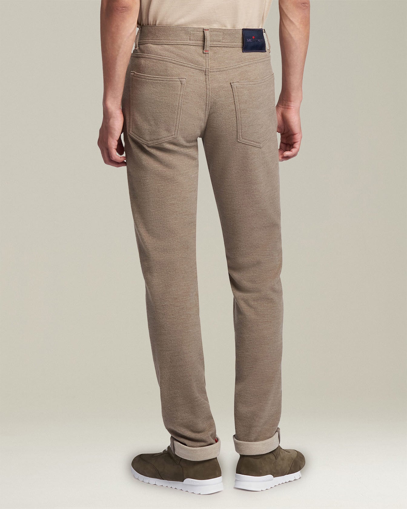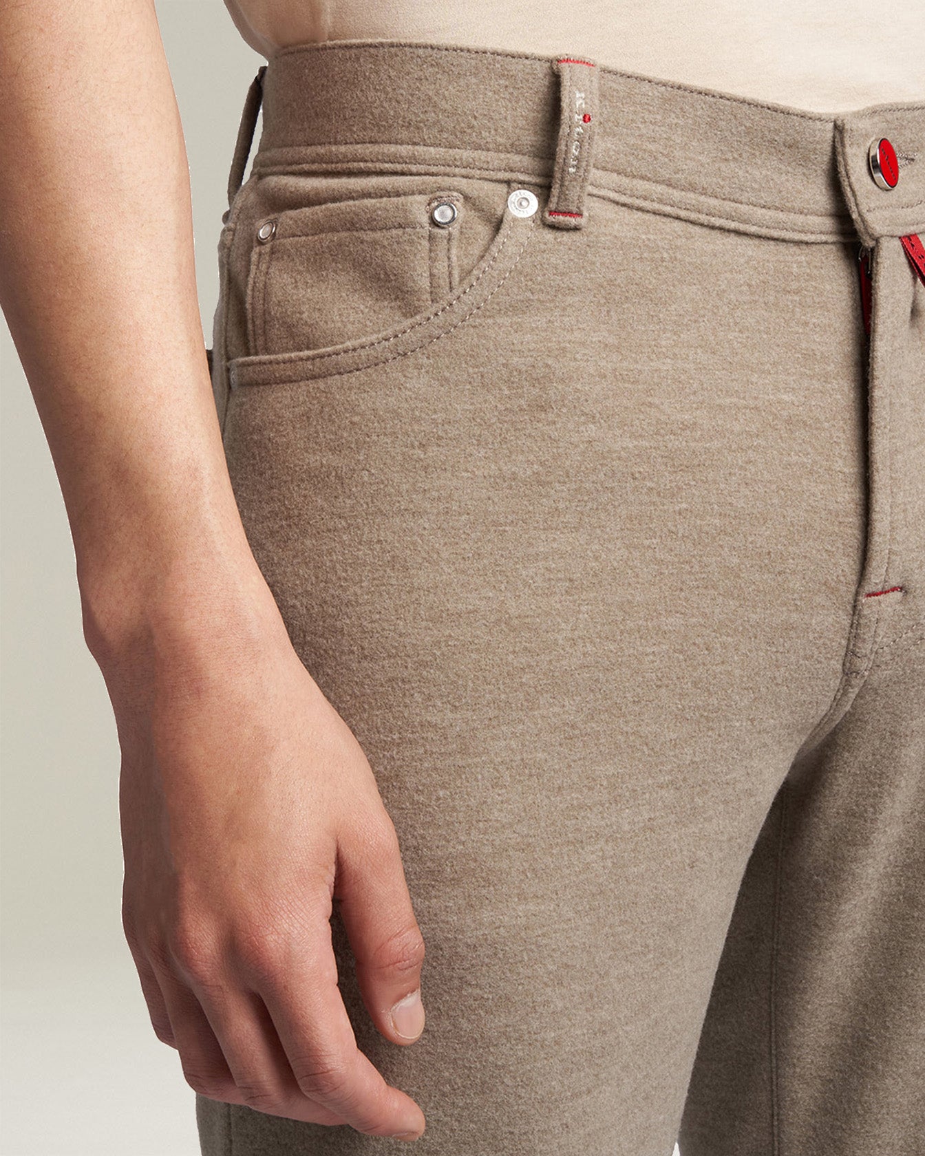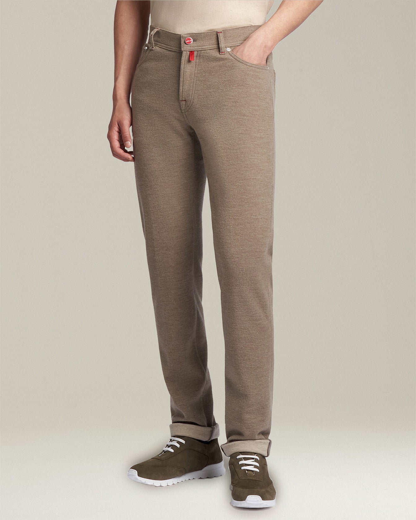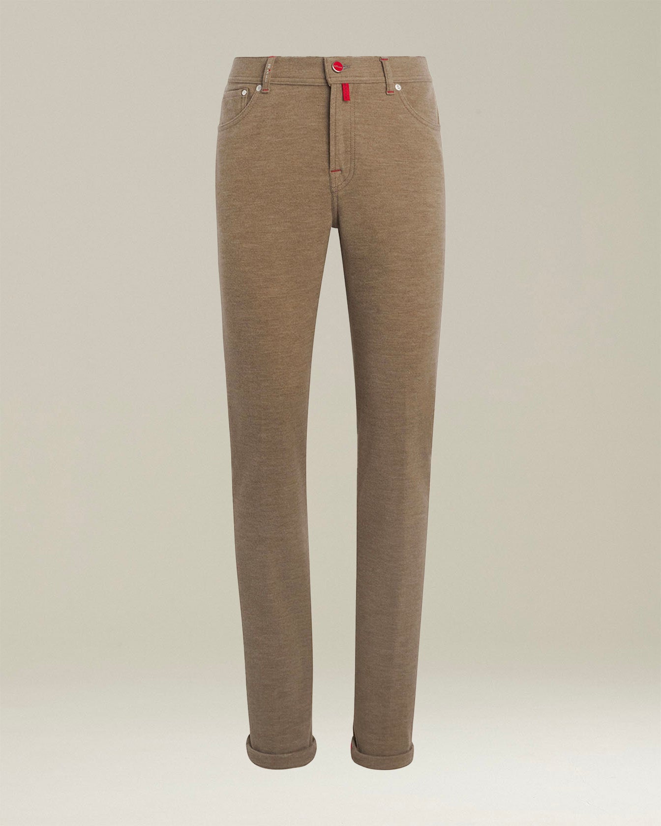 Slim-fit five-pocket trousers in camel-hued wool fabric. An icon of relaxed, contemporary elegance, Kiton trousers offer lightweight durability thanks to the double seams, making them nearly indestructible. Sewn without darts, these trousers have tone-on-tone topstitching, red bar tacks, and red kick tape to reinforce the hem. Essential lines define this versatile garment, designed to enrich casual-chic and sporty looks. The opening of the leg is 19.5 cm on a base size of 50 (Italian). We recommend hand washing inside-out at 30 C.
