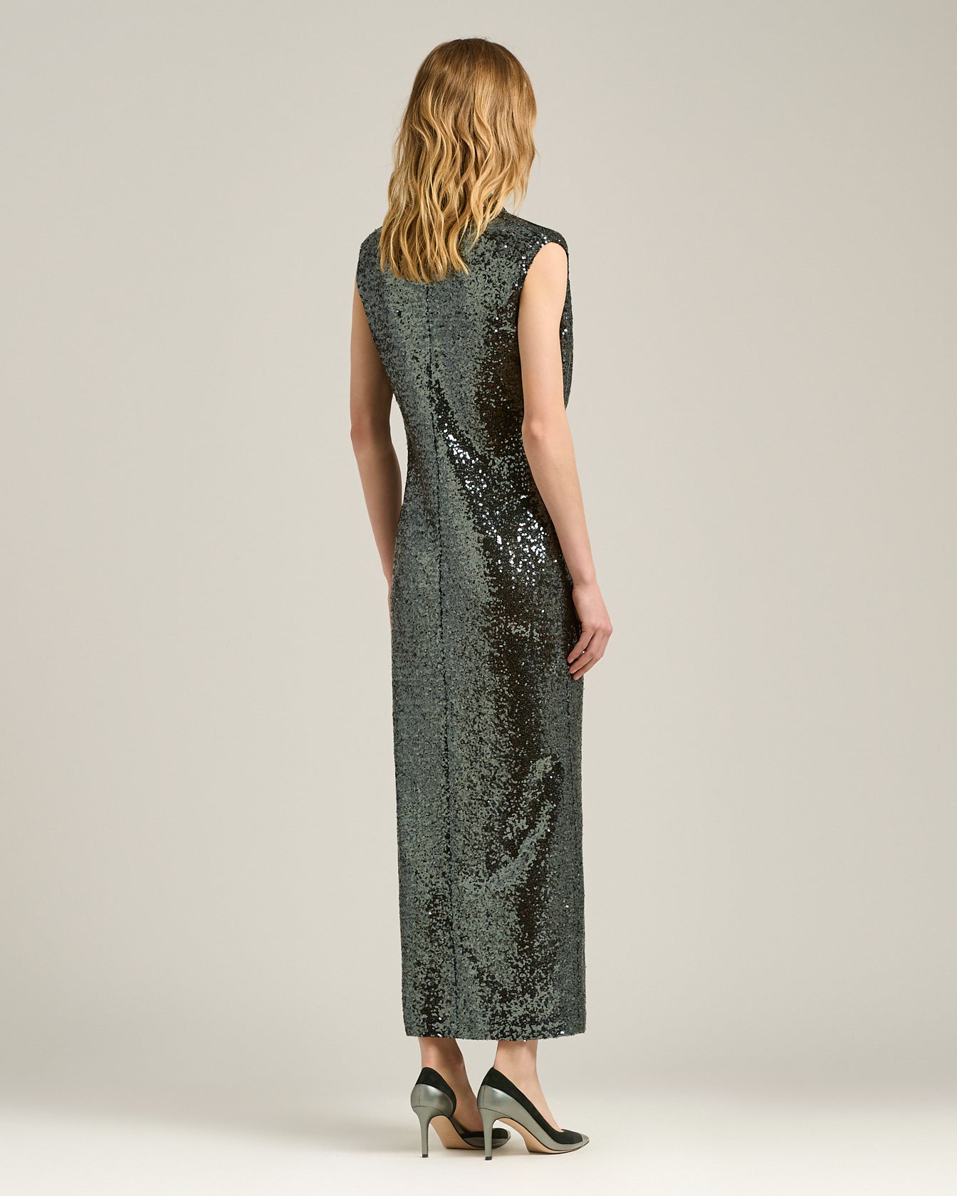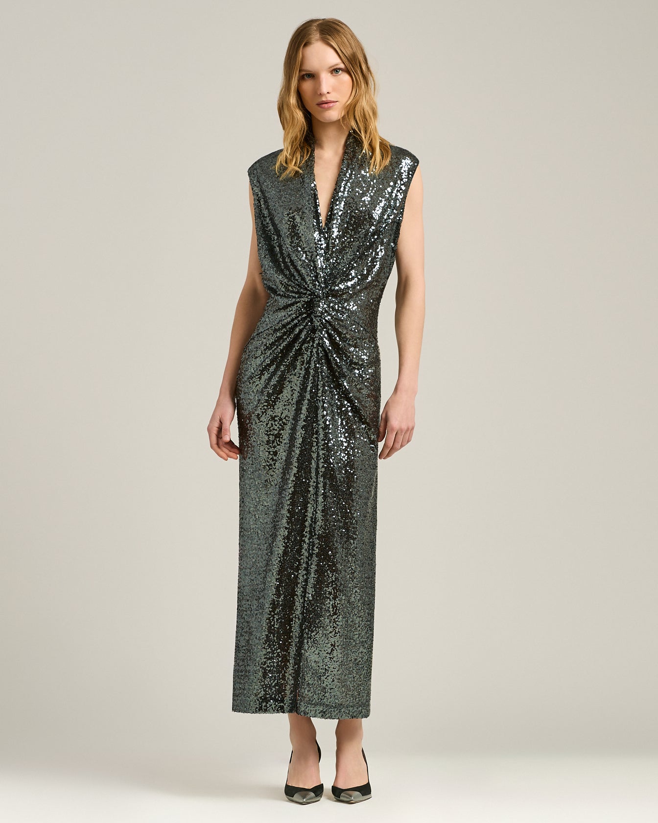 This evening dress, entirely covered in sequins, captures every light with refined, sophisticated brilliance. Its enveloping silhouette enhances the figure through draping, while the sparkling fabric creates magnetic glamour, perfect for exclusive events and gala evenings. Created with sartorial attention, the piece combines elegance and modernity, becoming a celebration of femininity.
