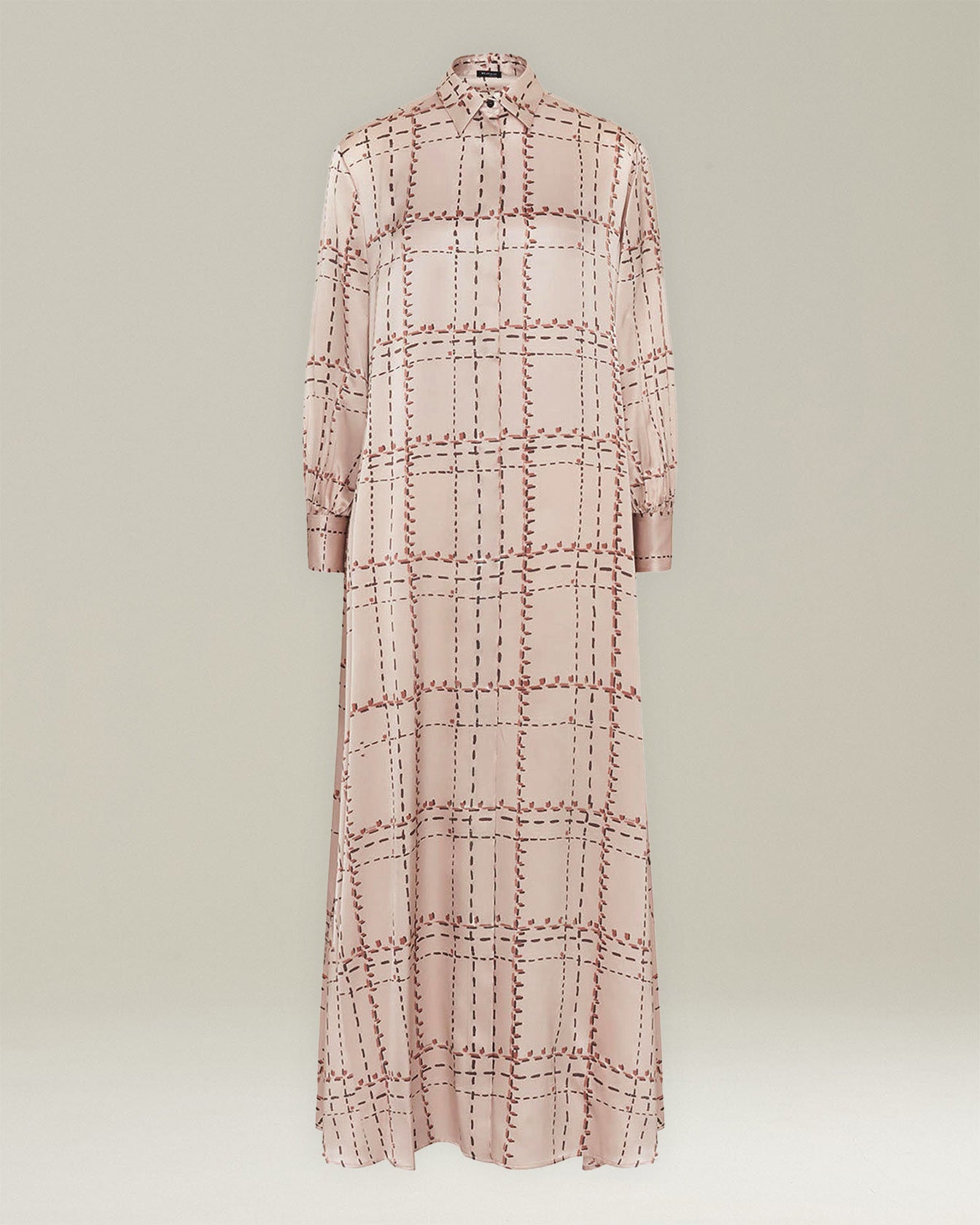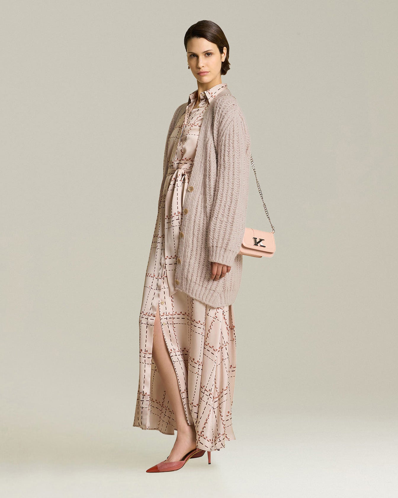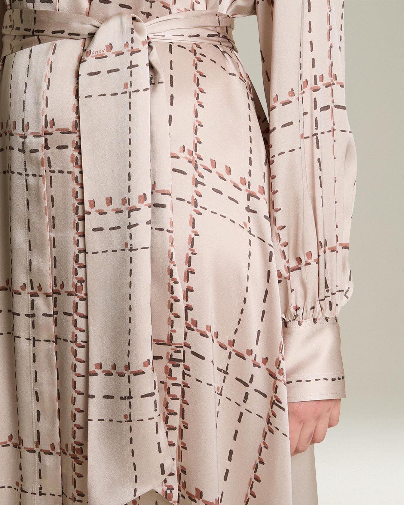 The apotheosis of grace and sophistication, this Kiton day dress is the quintessence of style for the most prestigious occasions. A tribute to stylish women with a determined, passionate personality, keen connoisseurs of the art of tailoring. This garment evokes the timeless enchantment of a piece worn for pure amusement. The lustrous printed silk feels like a second skin. Entirely handcrafted in Naples by our master tailors, the shirt dress boasts a straight, loose fit, with an eternal silhouette embellished by an elegant shirt collar and covered buttoning, a detail that lends the dress incomparable elegance and sophistication. The extraordinary sophistication of this garment is further complemented by a soft belt made from the same sumptuous fabric, which contours the silhouette with grace and precision.