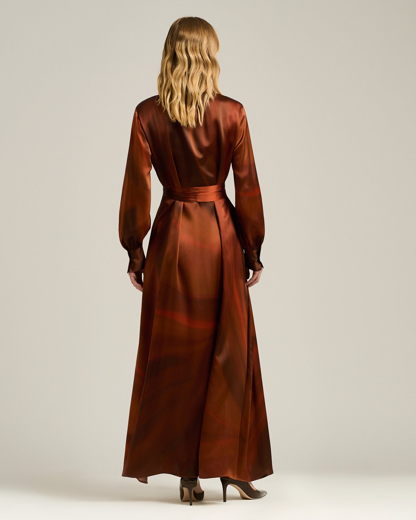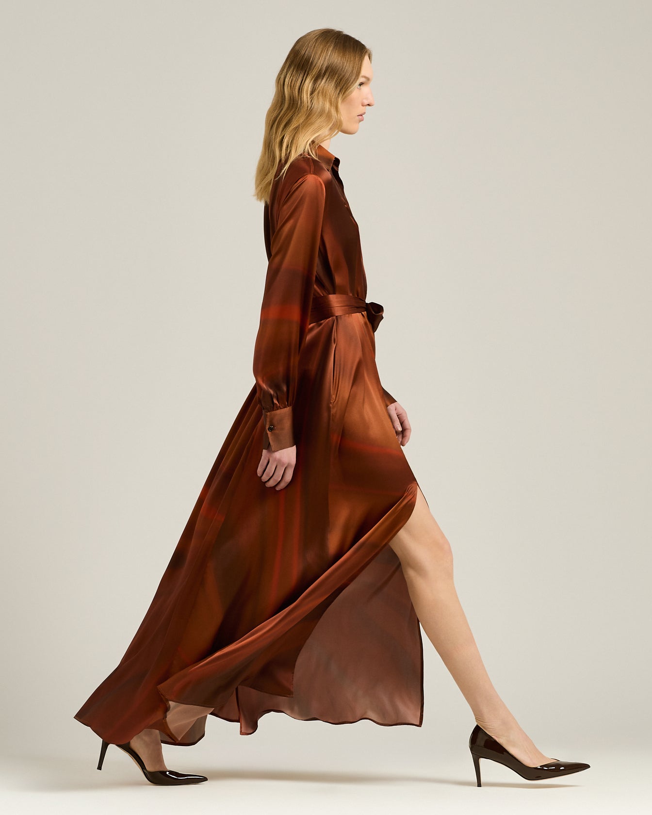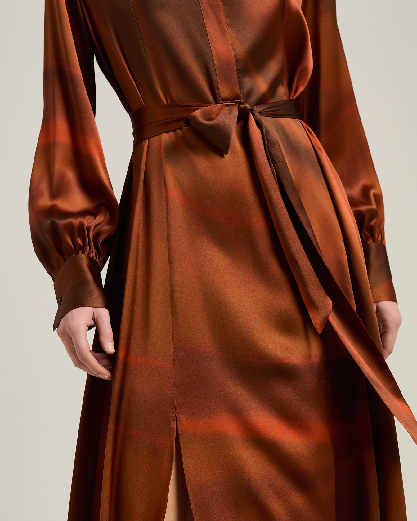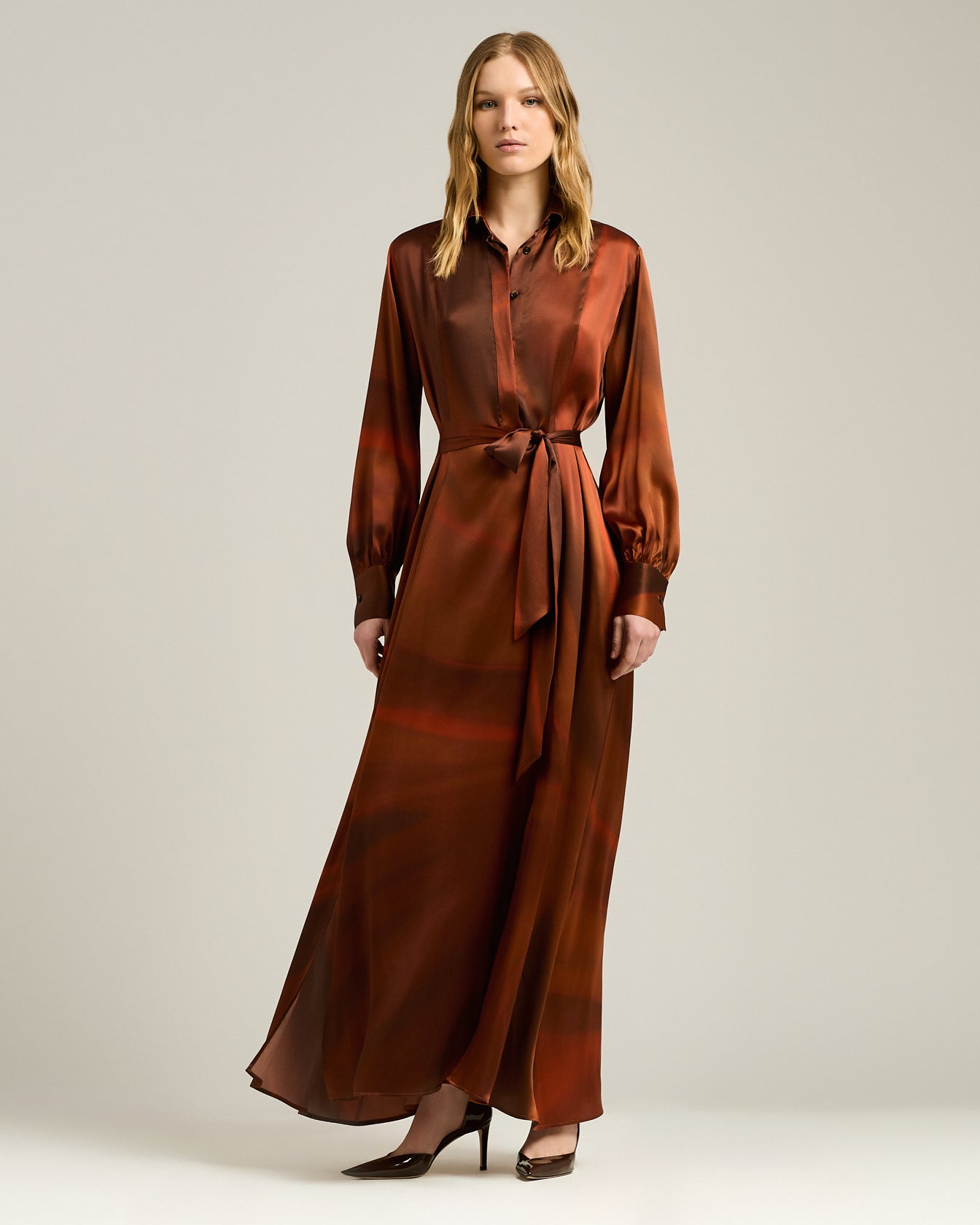 A fluid expression of contemporary refinement, this long dress is crafted from pure silk with a watercolour-effect print. The fabric, light and silky to the touch, glides over the body with natural movement, creating interplays of light and depth. The shirt dress design with concealed button fastening and wide sleeves is completed by a belt in matching fabric, to be tied at the waist to sculpt the silhouette. High, structured cuffs add a sartorial accent, in perfect balance between rigour and femininity.