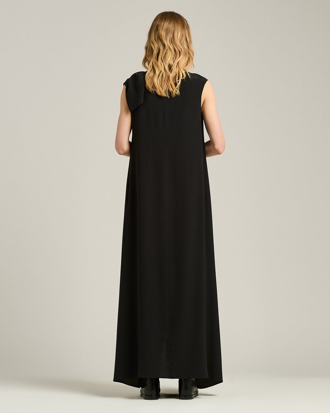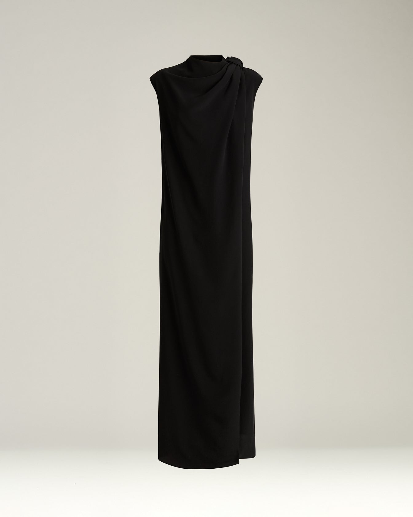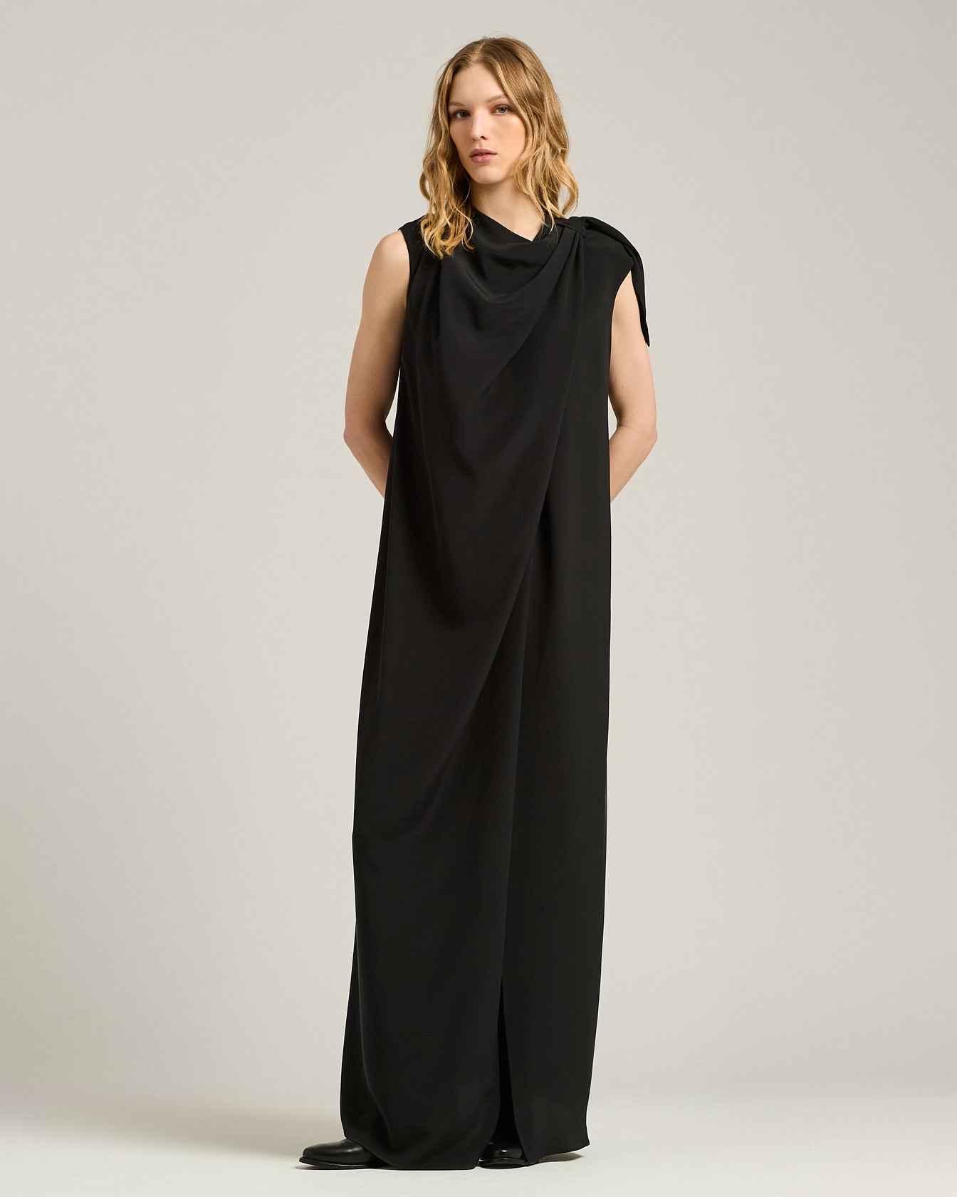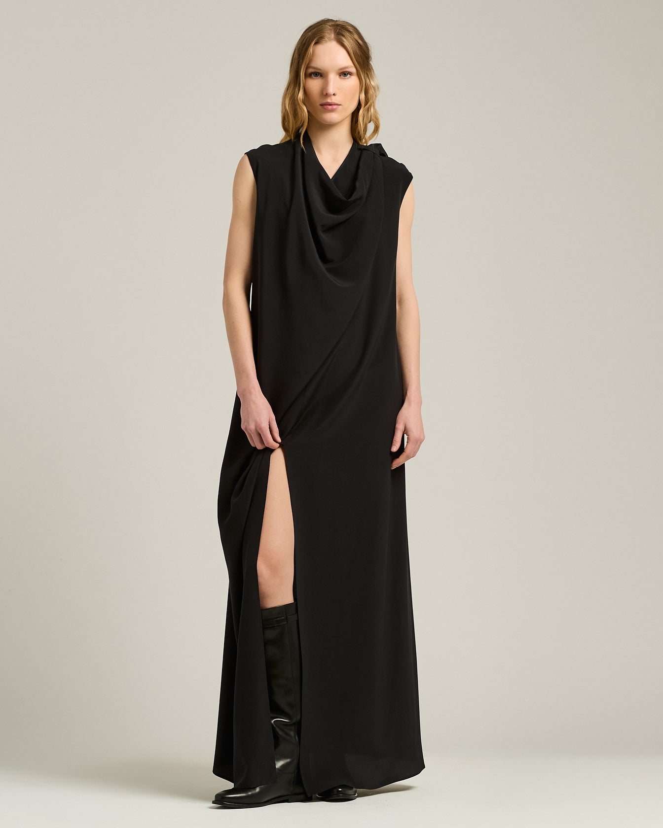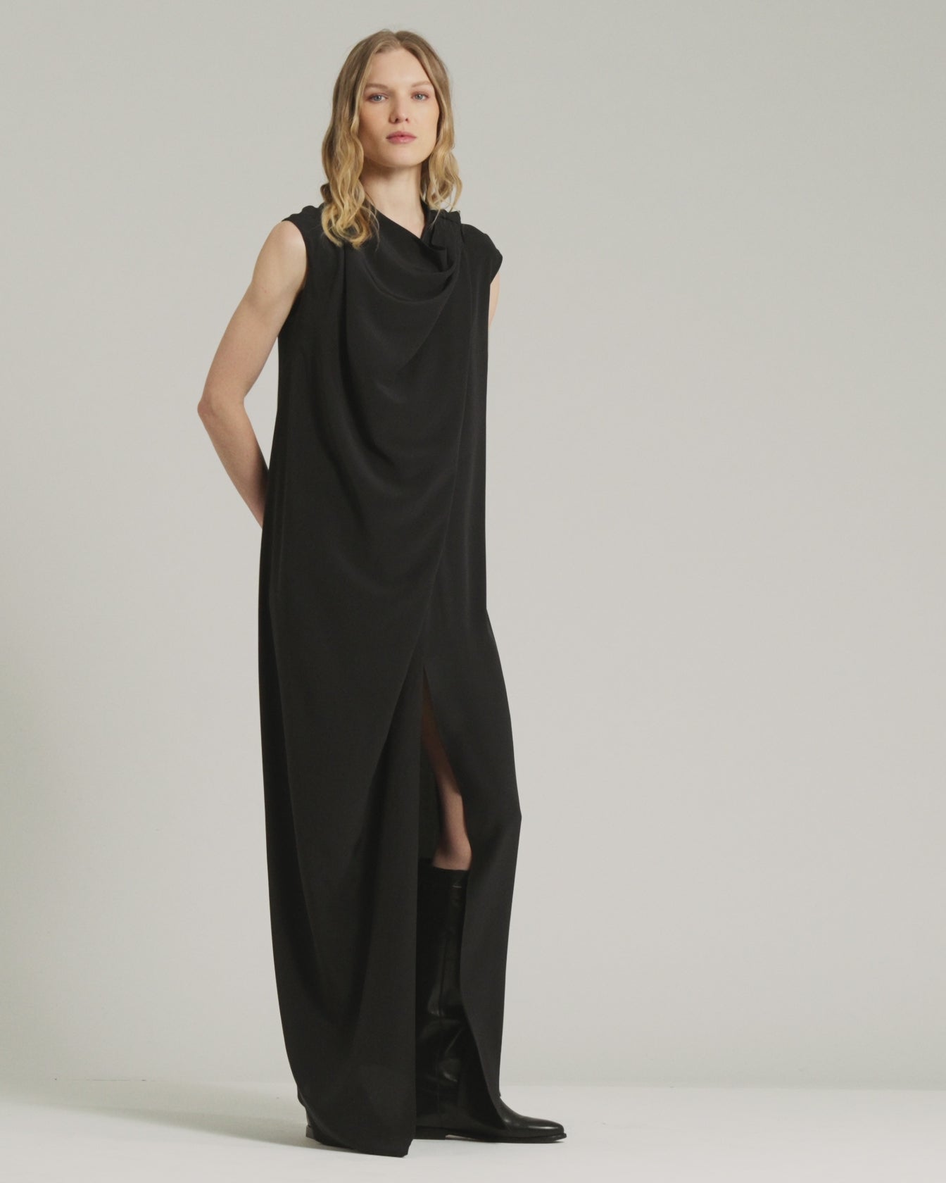 The fluidity of pure silk takes shape in this long sleeveless dress, characterised by sophisticated draping at the neckline and a sleek line that skims the body naturally. The vertical cut is interrupted by a deep slit, giving movement and character to the silhouette. The balance between the minimalism of the form and the sensuality of the detail makes this dress a bold, sophisticated choice, perfect for the evening or occasions with a confident, modern tone.