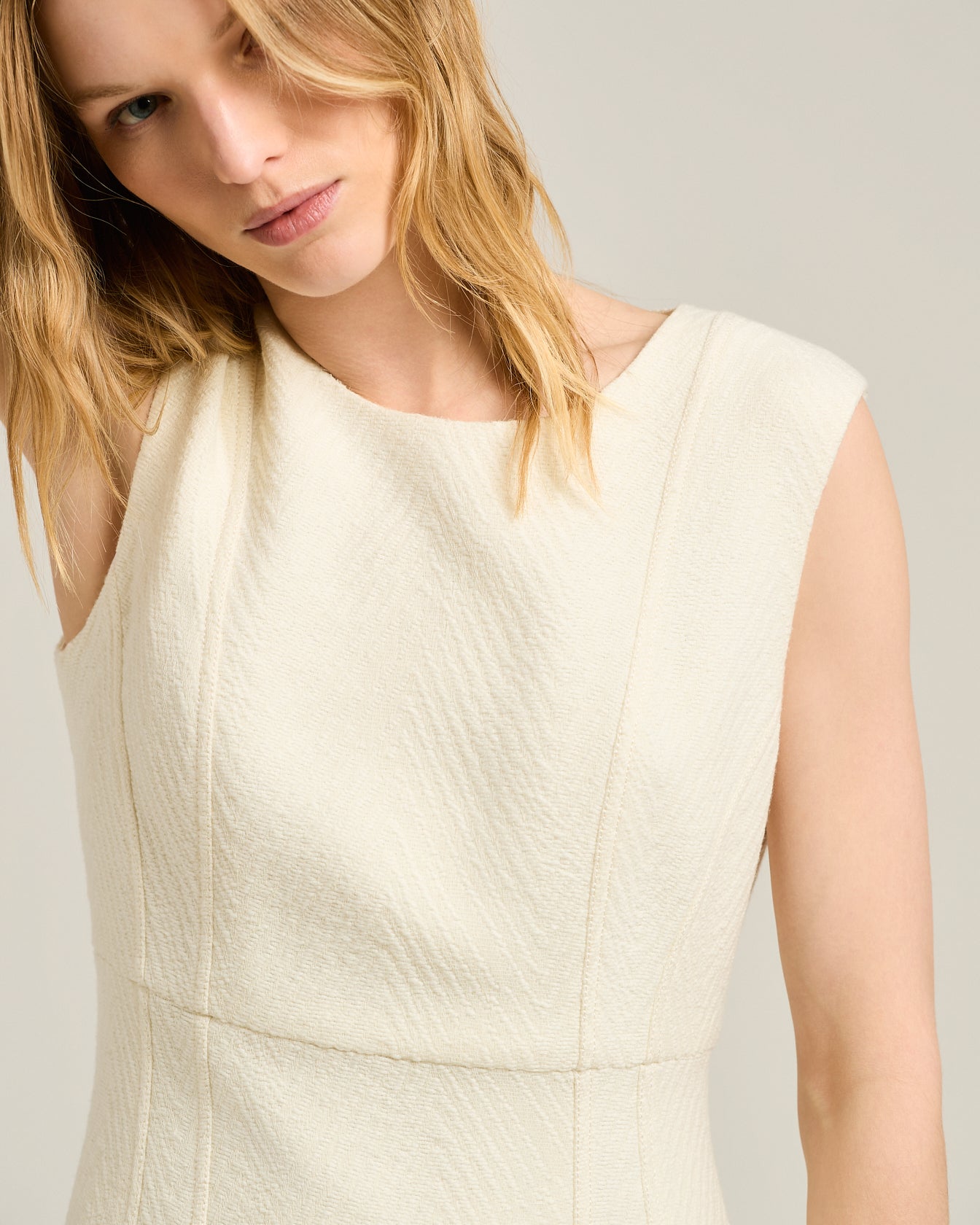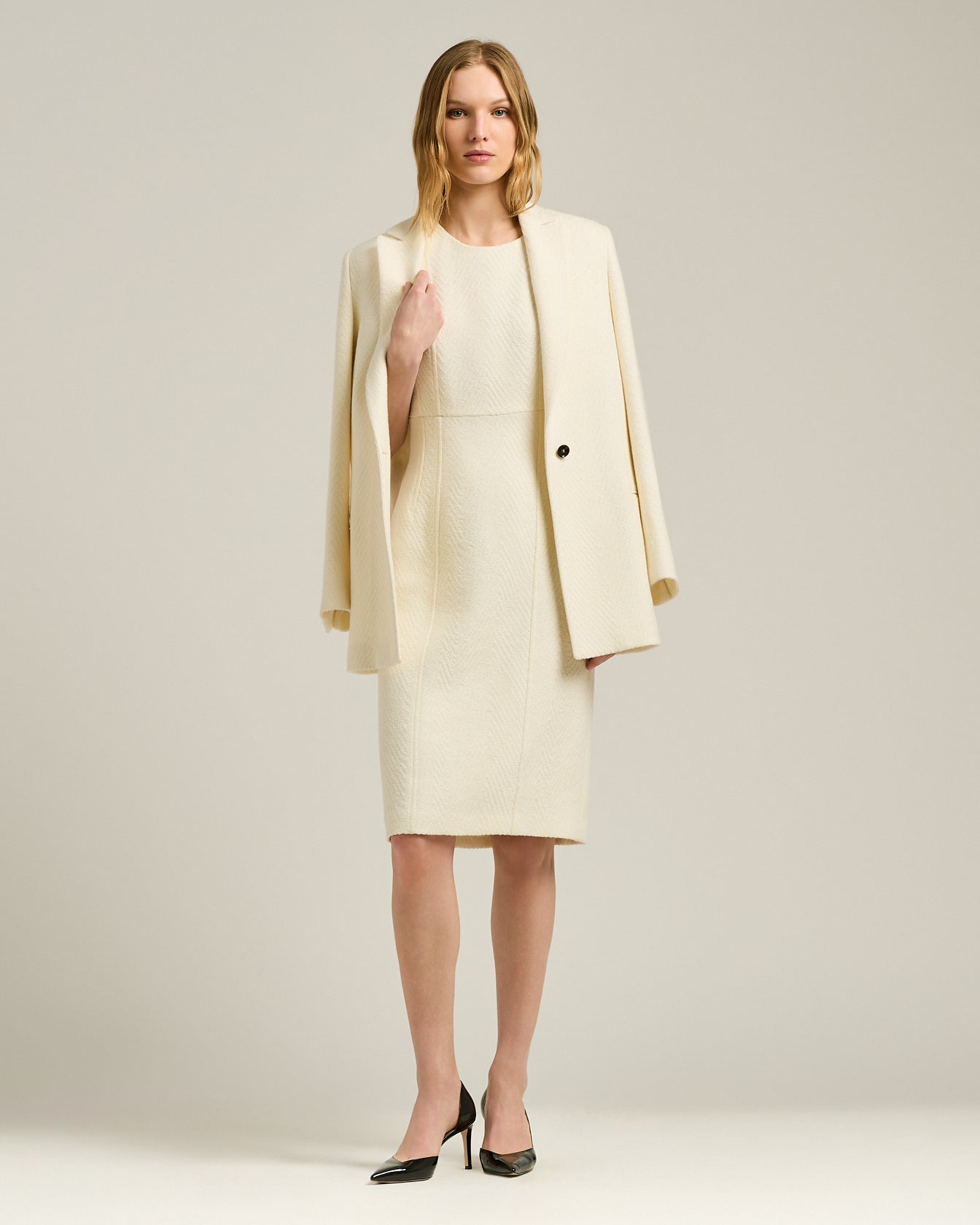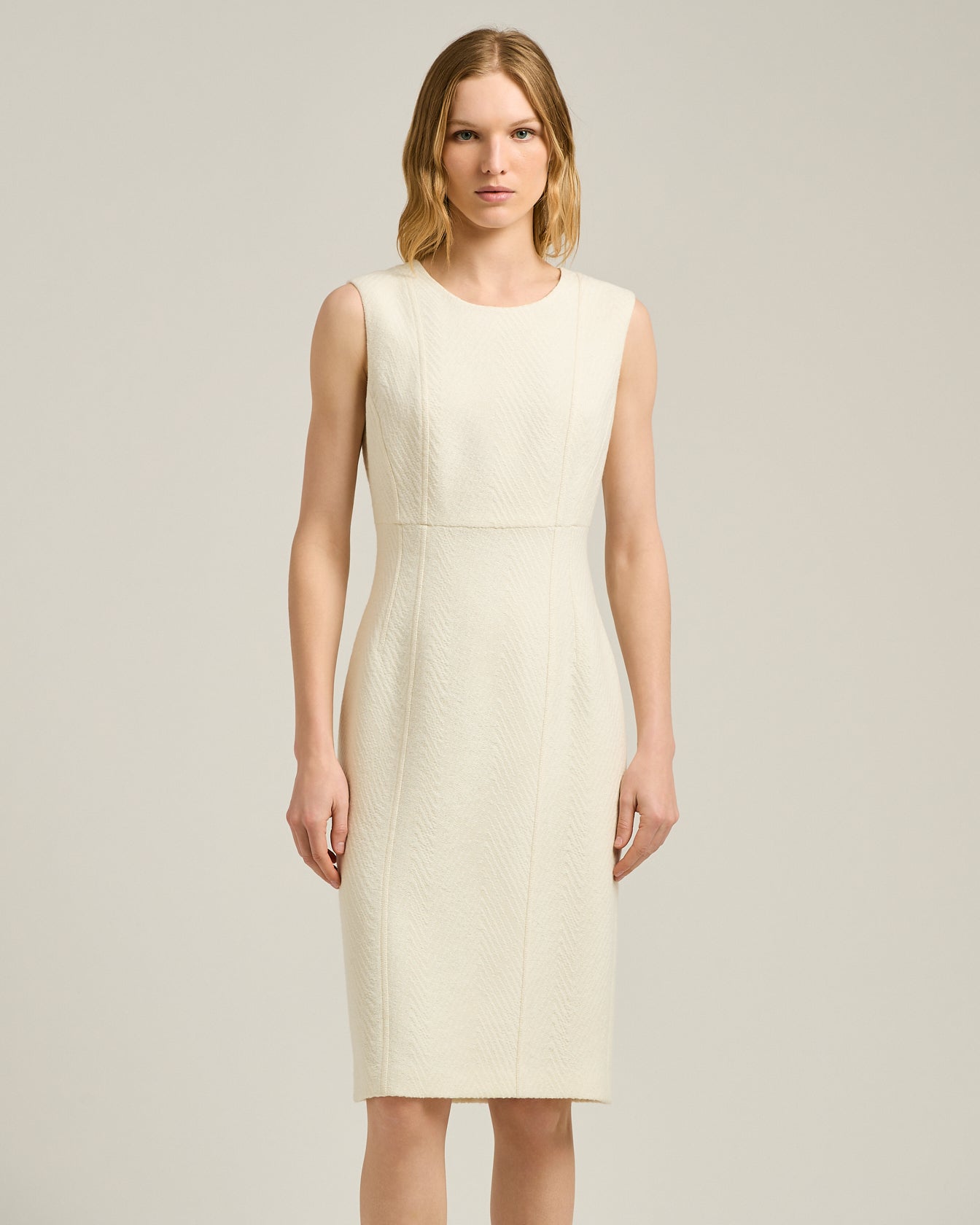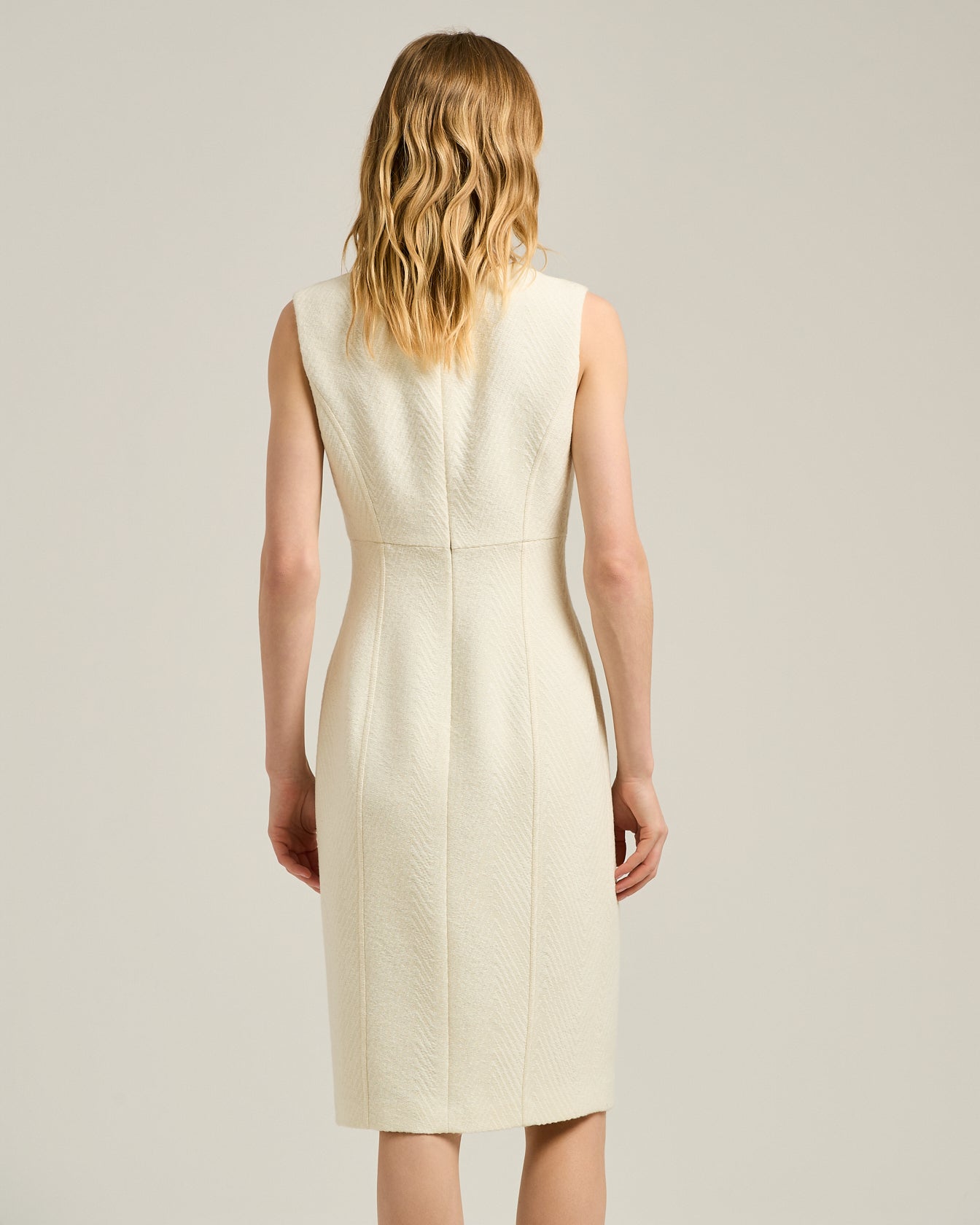 CREAM WHITE HERRINGBONE WOOL SHEATH DRESS