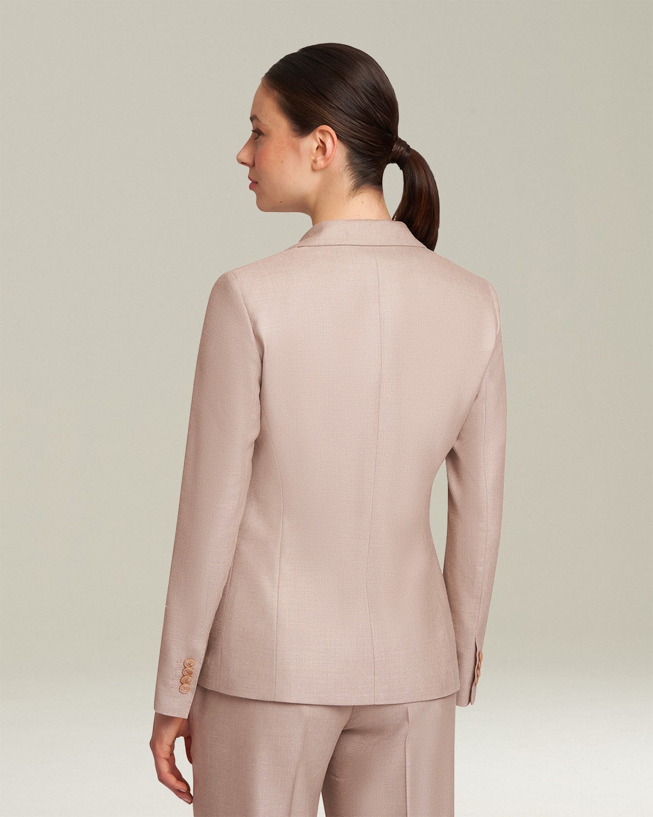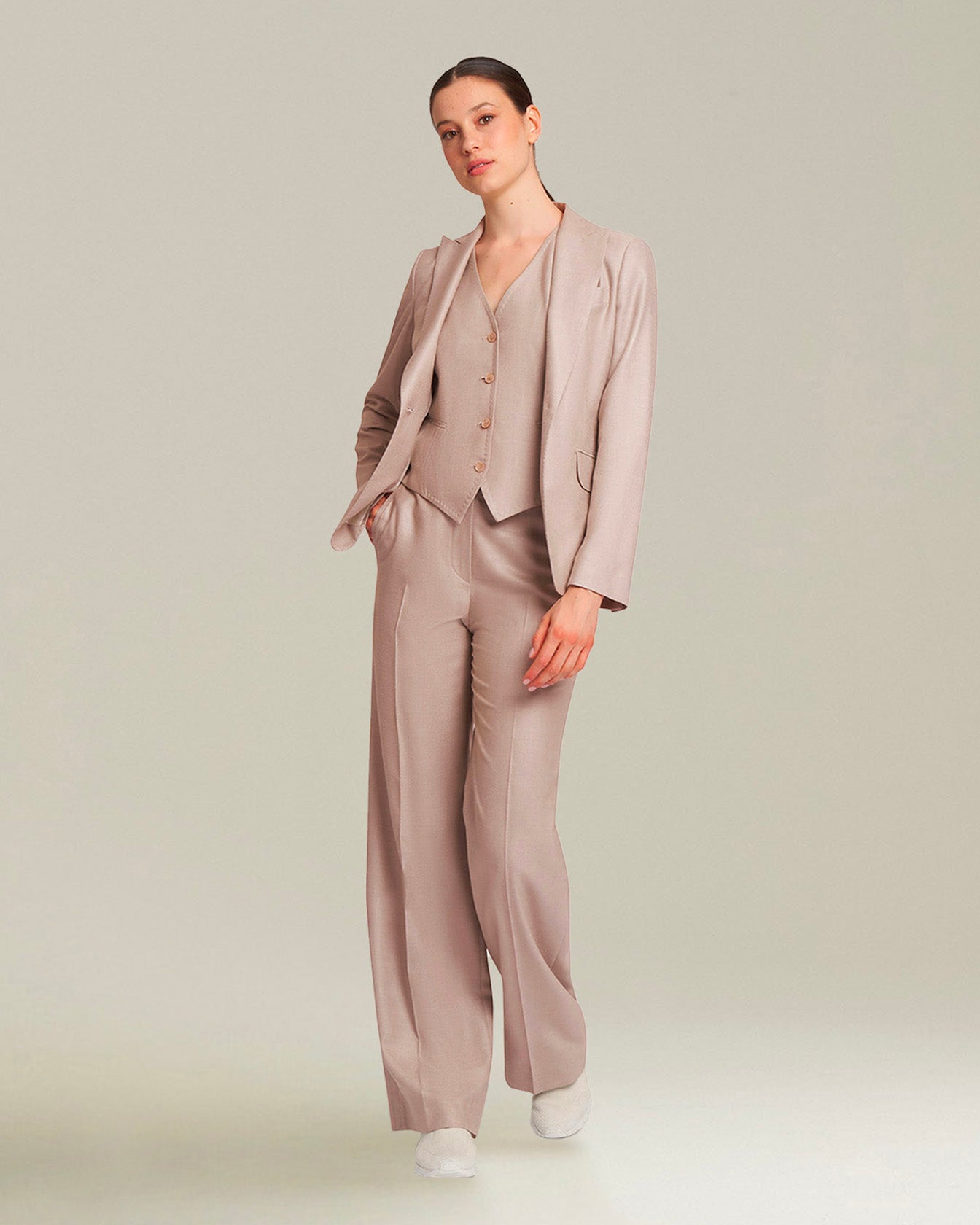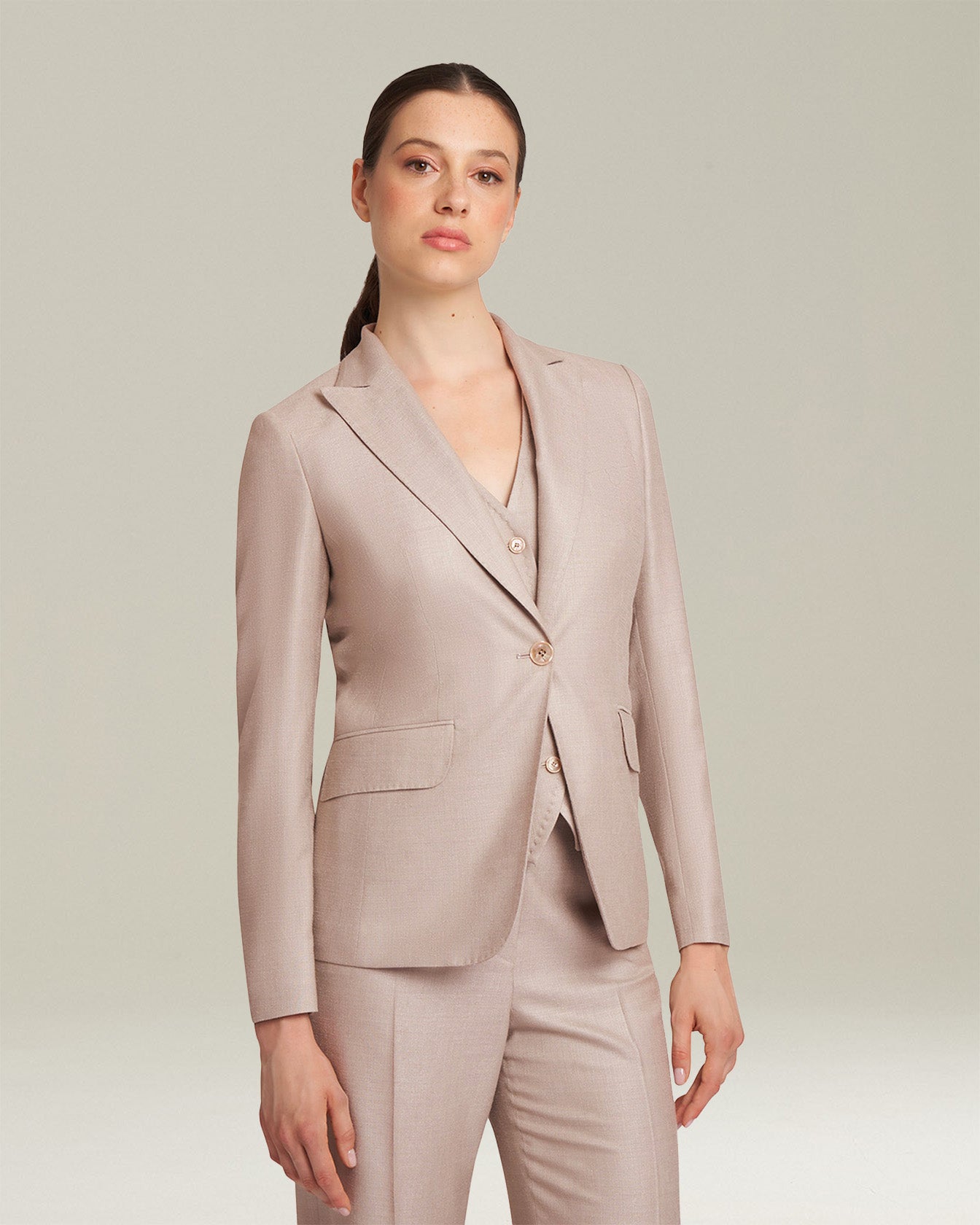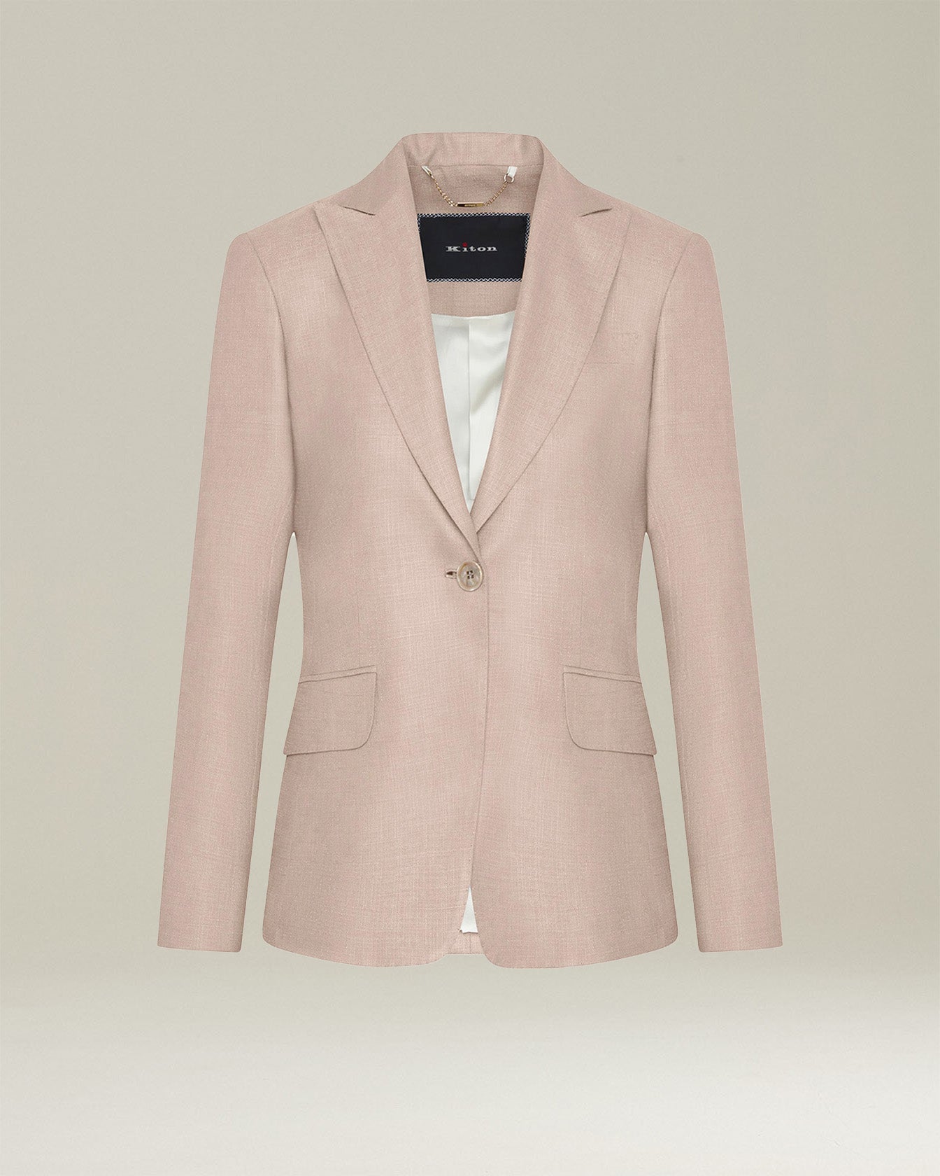 Beige single-breasted jacket in a blend of the finest silk and wool, with a clean design and essential lines. This is one of the brand’s most iconic jacket styles, embodying Kiton’s sartorial savoir-faire: the brand’s mastery of complex textile production processes is expressed through feminine tastes and needs. The jacket features pointed lapels, a single button, a breast pocket and two welt pockets with flaps on each side. The garment is fully lined in printed pure silk satin. Every Kiton jacket is a masterpiece of design, entirely cut and sewn by hand in Naples by 25 master tailors who carry out 1800 steps to complete such fine architectural attire. Perfect for formal occasions, this Kiton garment speaks to refined women with strong, passionate character, attentive connoisseurs of the sartorial traditions that it represents. To maintain the beauty of your Kiton jacket, we recommend professional laundering and pressing.