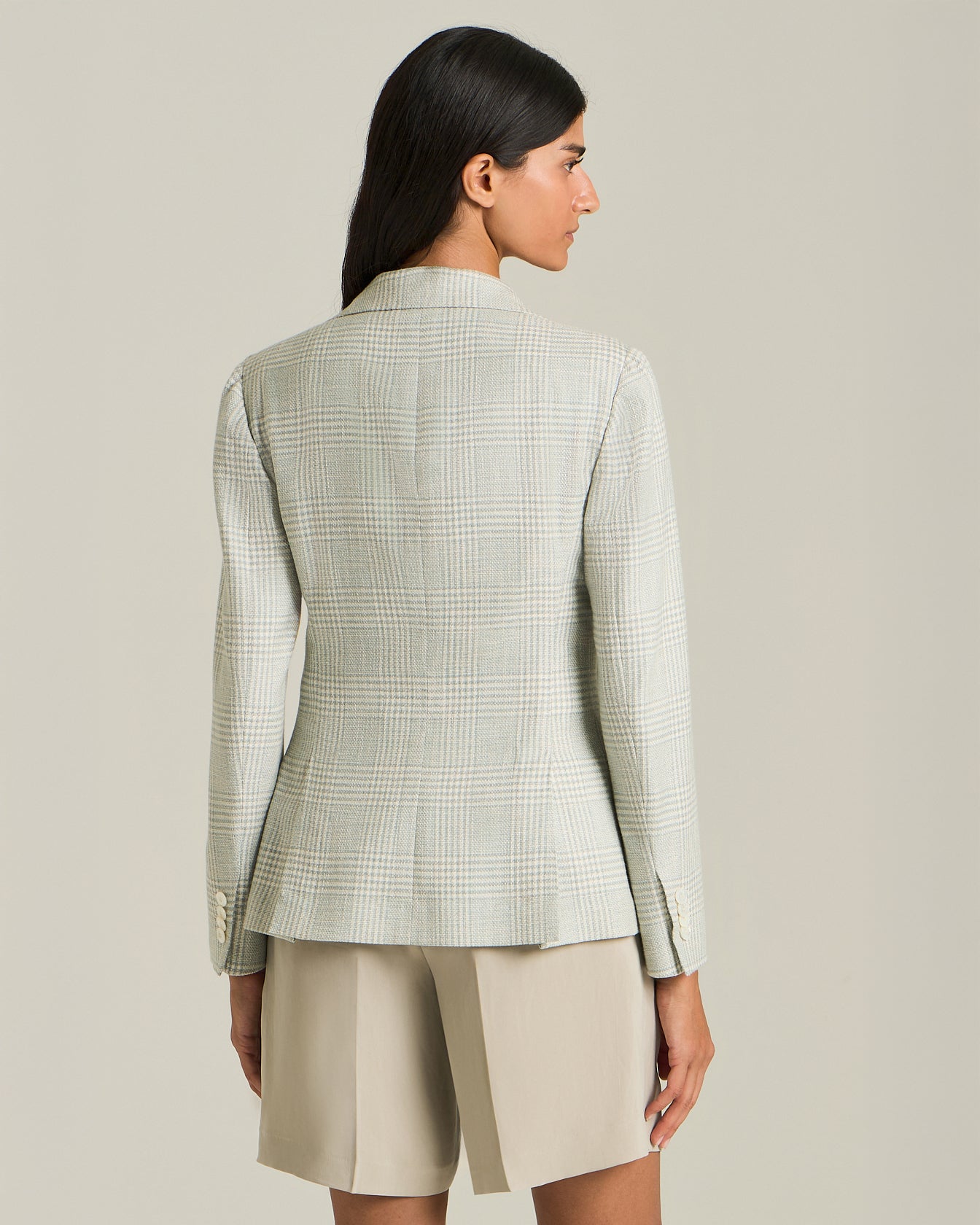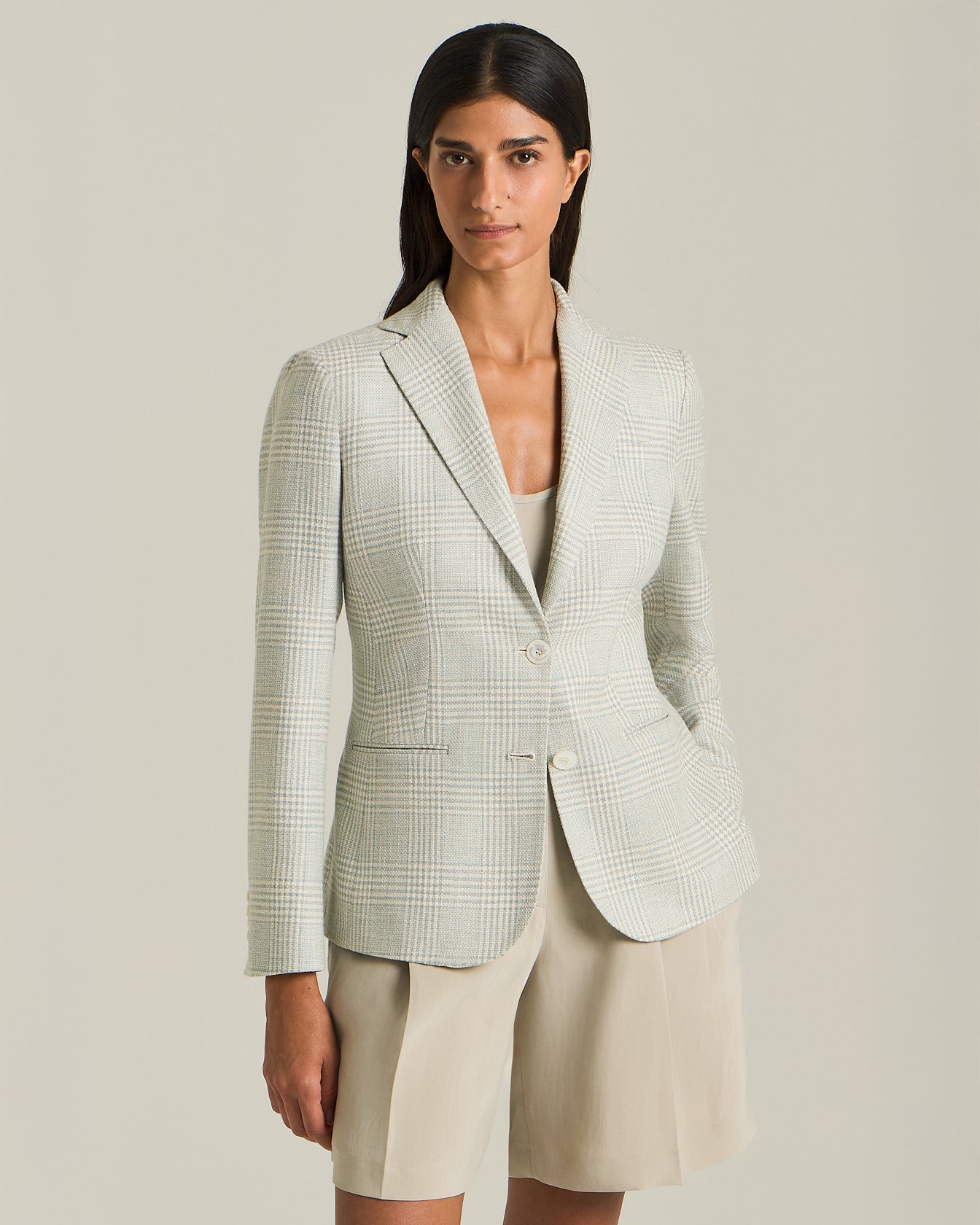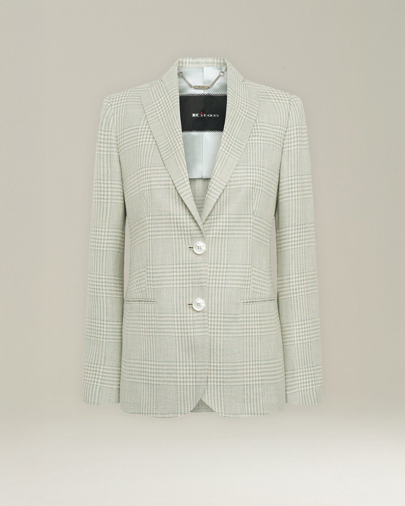 The iconic Glen plaid pattern, rooted in Kiton’s sartorial heritage, perfectly complements and celebrates the sophisticated femininity of the single-breasted jacket, crafted from an exclusive blend of silk, cotton and cashmere. The silhouette, simple yet harmonious, drapes the figure with elegance and enveloping comfort, embodying the timeless appeal of a design that transcends fleeting trends. Featuring notch lapels, horn buttons and welt pockets, every detail is carefully crafted to convey subtlety and finesse. The interior of the jacket features a half lining of pure silk satin, adding a luxurious touch that gently caresses the skin. Every Kiton jacket is a masterpiece of sartorial craftsmanship, meticulously handcrafted in our atelier in Naples.