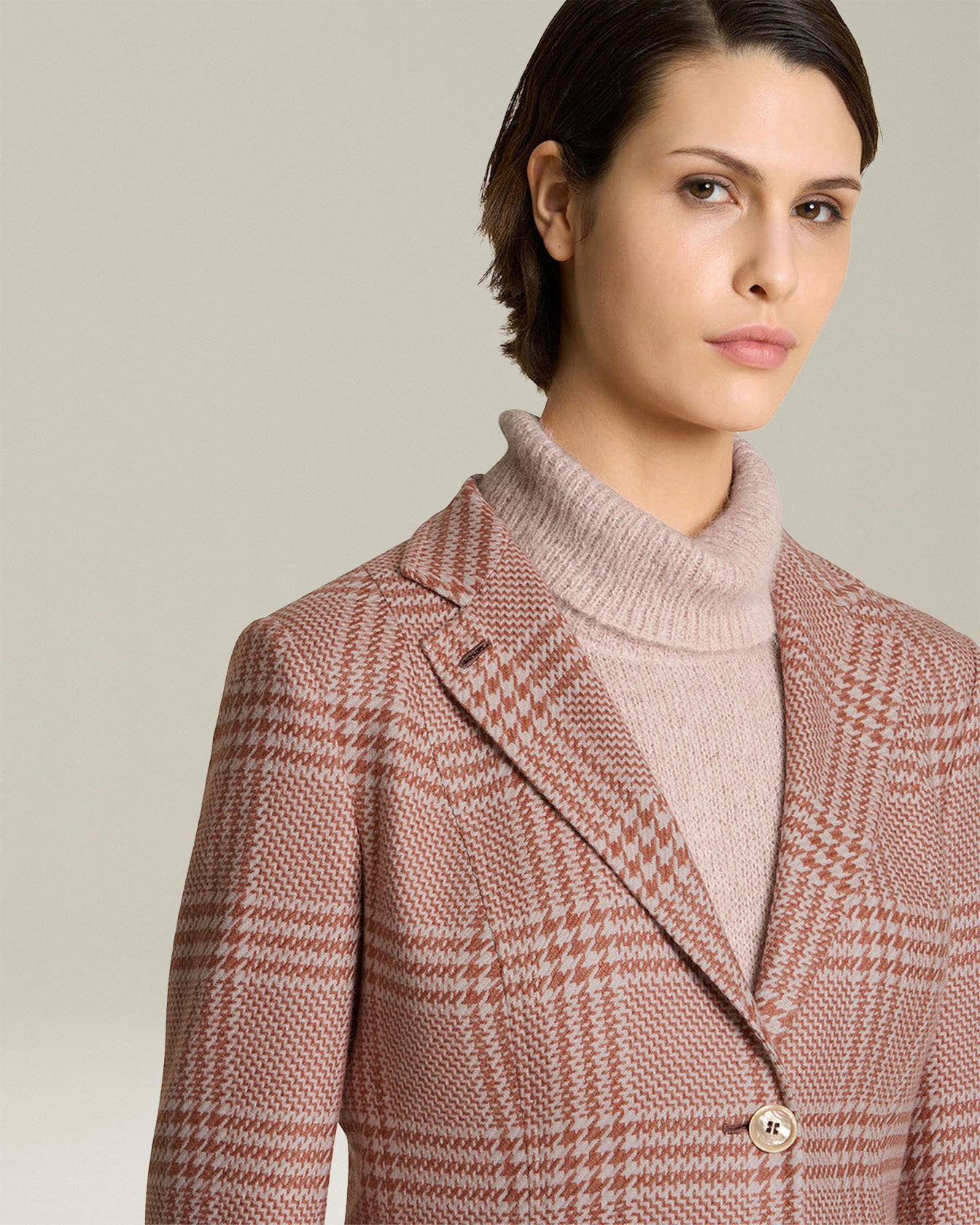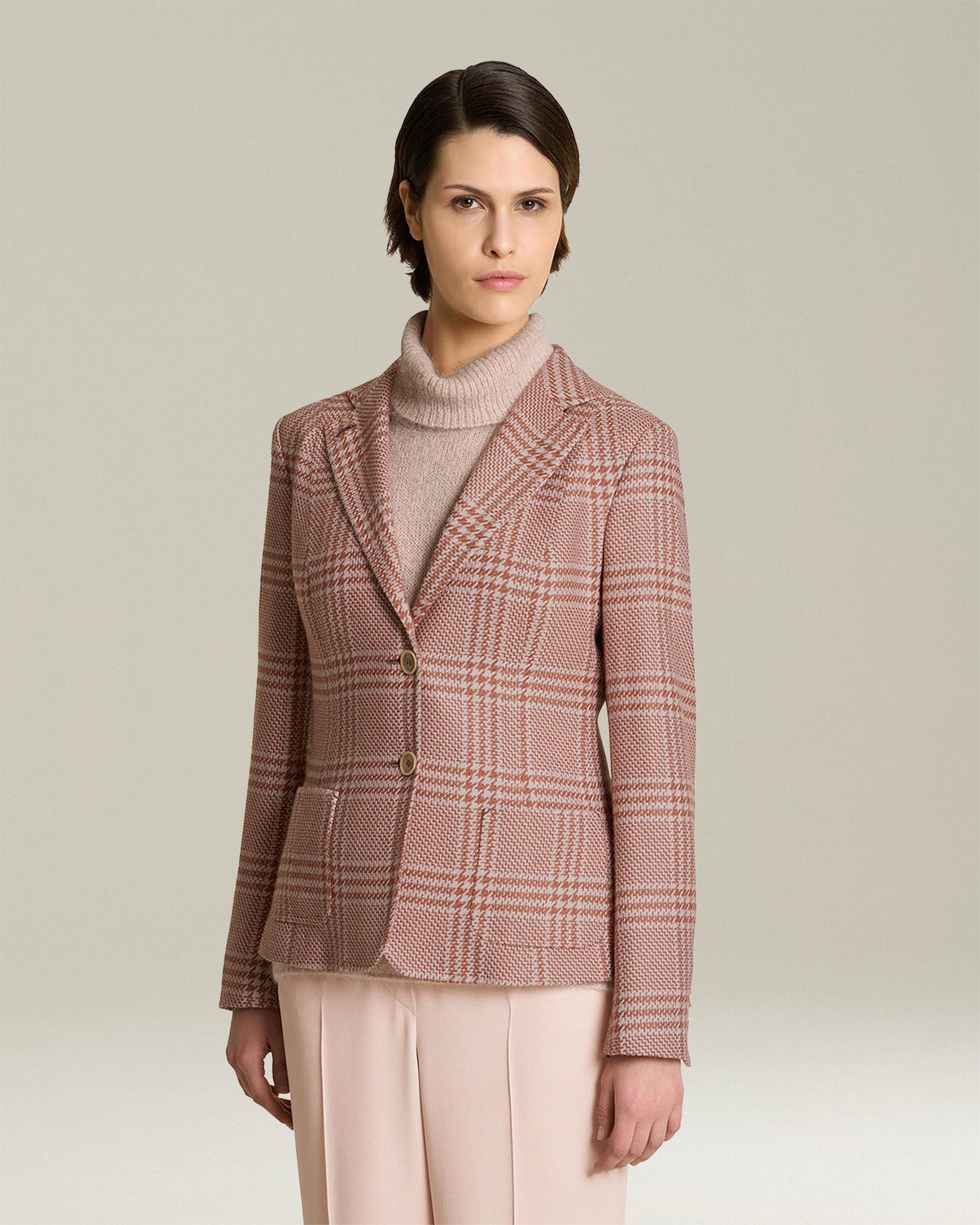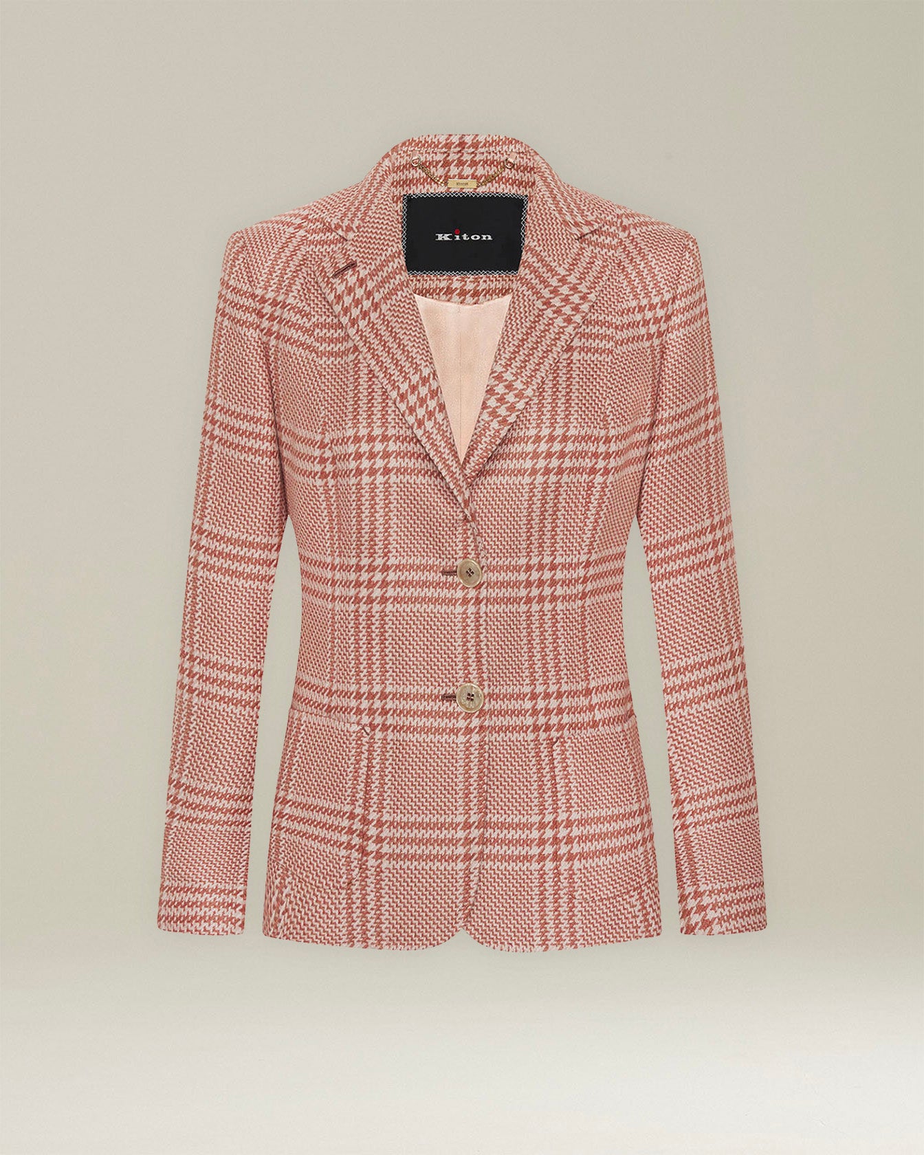 Dressed in clothes that make them feel confident and at ease, Kiton women live with great determination, without sacrificing comfort, freshness and, above all, elegance. This single-breasted blazer in a find blend of silk and cashmere with the iconic Glen plaid pattern is given a modern twist in terms of lengths and proportions. It features a slim fit, notch lapels, two horn buttons and two patch pockets. The garment is fully lined in pure white silk satin. Each Kiton jacket offers an experience of intimate and sophisticated luxury, the result of the skill of master tailors who create true sartorial masterpieces.