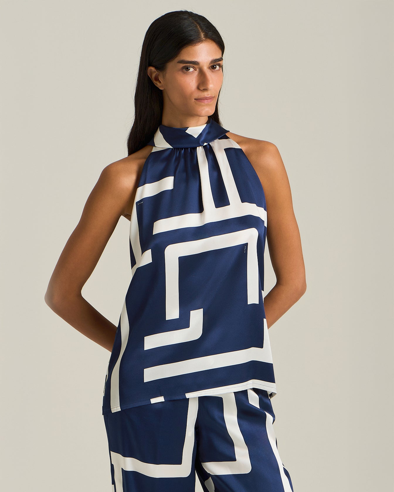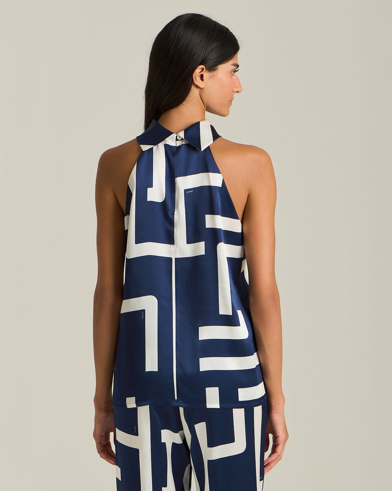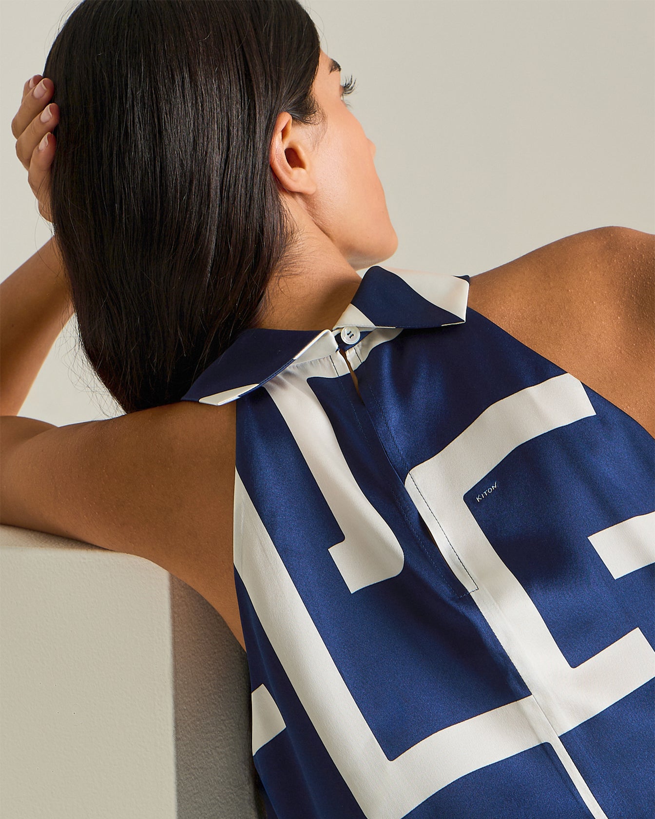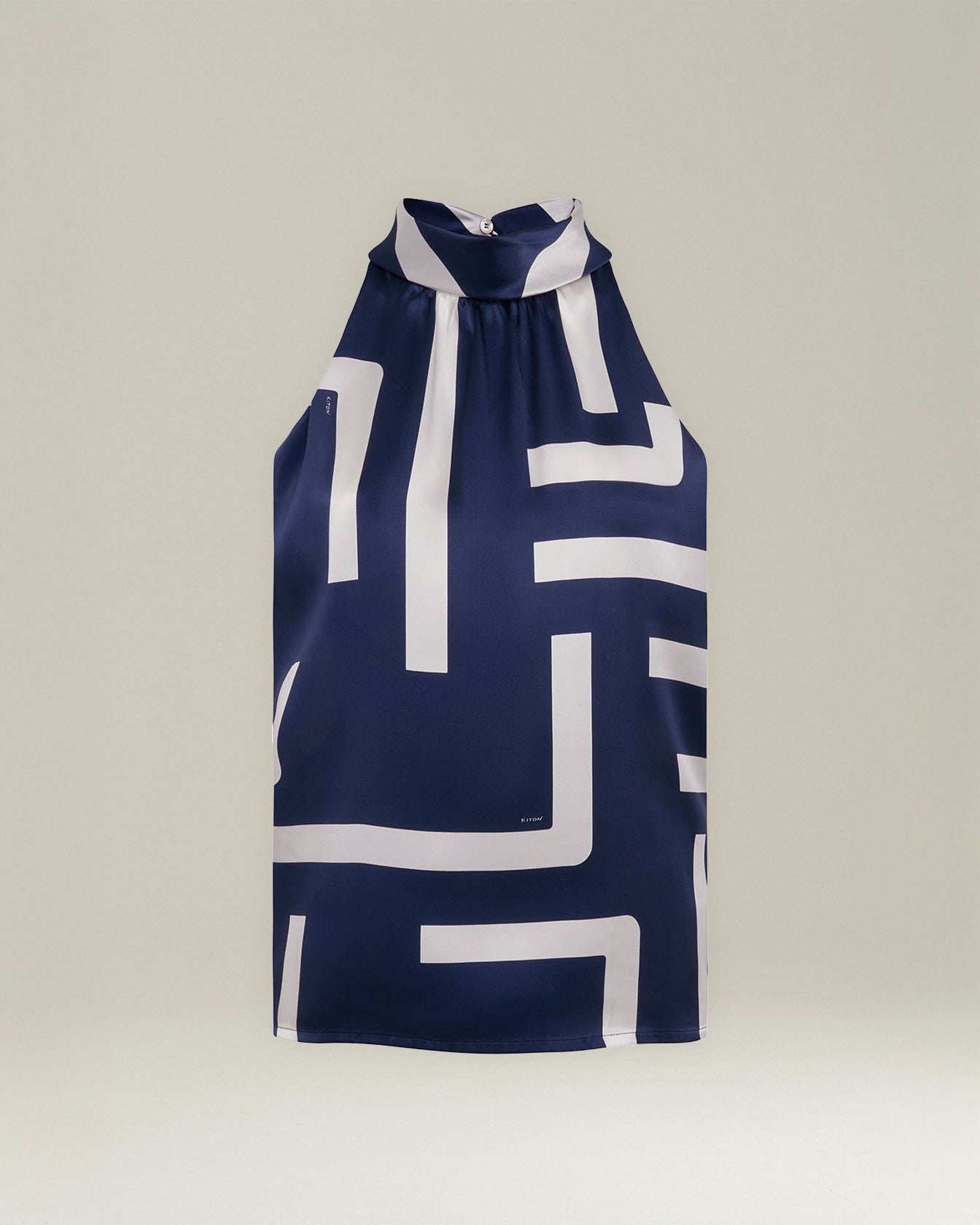 The ultimate expression of elegance, the Kiton blouse is a perfect balance of sophisticated detailing and clean lines that naturally hug the feminine silhouette. Exclusively crafted from lustrous silk and embellished with the sophisticated Infinity Maze pattern, this sleeveless, half-necked blouse reveals a soft, flowing texture that glides gracefully over the body, giving the wearer an aura of simple, refined sophistication. An unmistakably stylish garment, perfect for enhancing your wardrobe with a touch of timeless class.