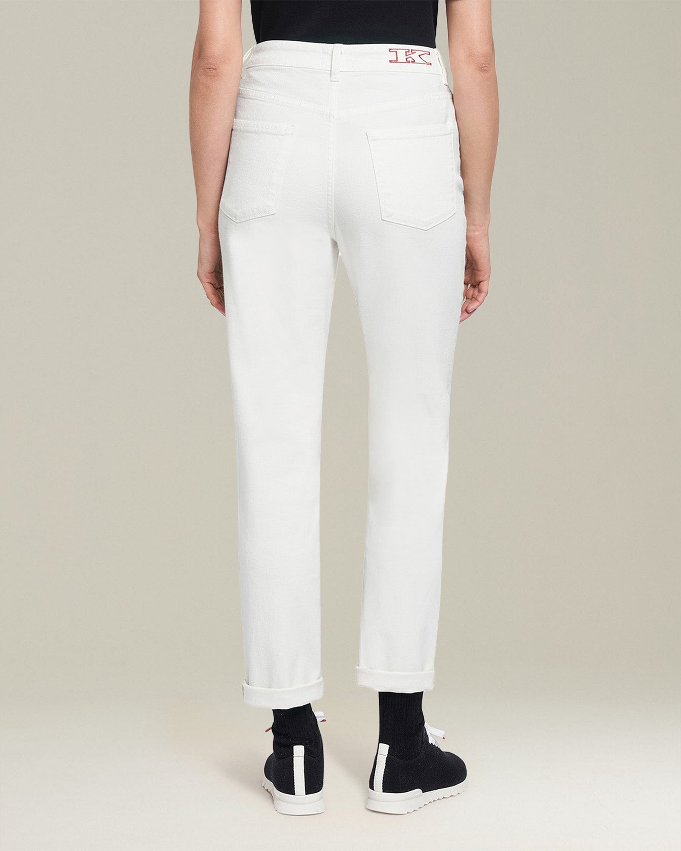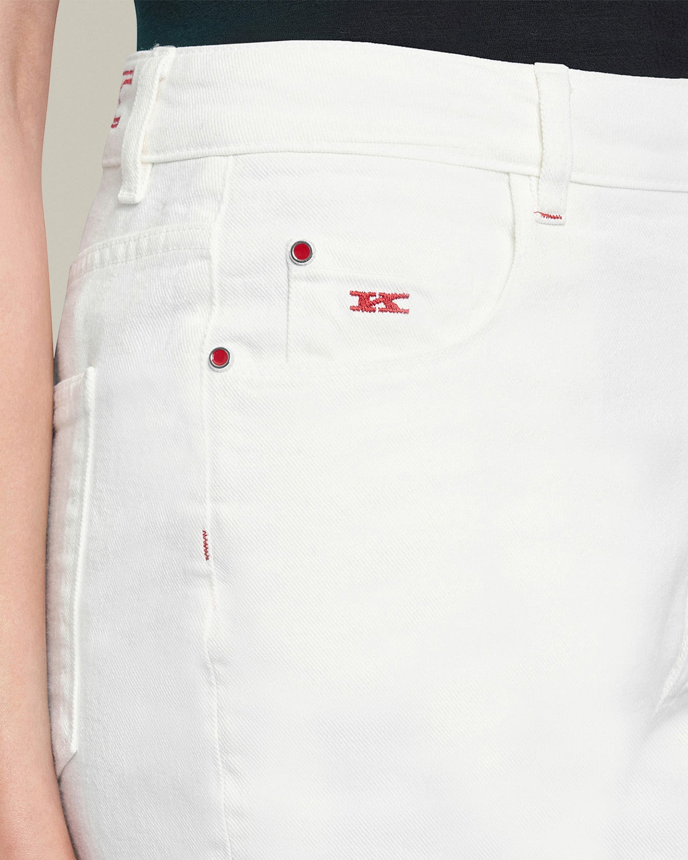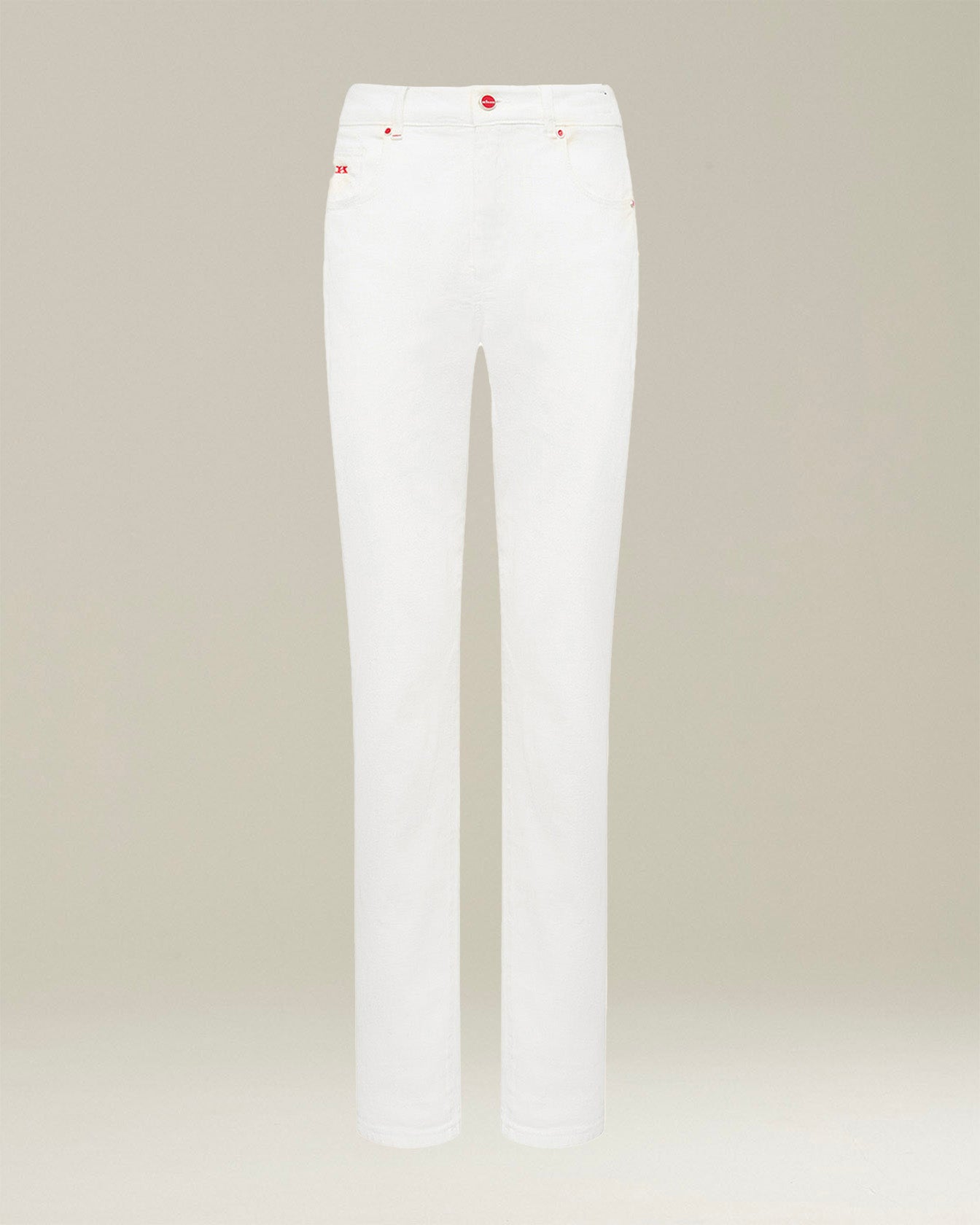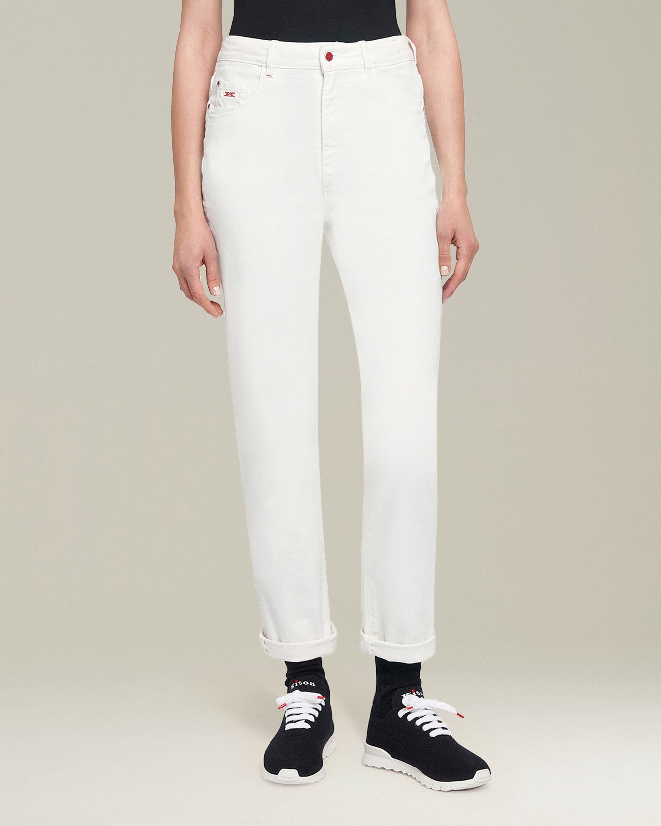 White slim-fit five pocket jeans with a high-rise waist, made from a cotton-cashmere blend. An icon of relaxed, contemporary elegance, Kiton jeans offer lightweight durability thanks to double stitching, making them nearly indestructible. A small amount of elastane in their composition makes these jeans extremely comfortable: the fabric gently hugs the leg without losing its shape. Contrast detail stitching; no darts. Logo detail: contrast K embroidery on the rear waistband. We recommend hand washing inside-out at 30 C.