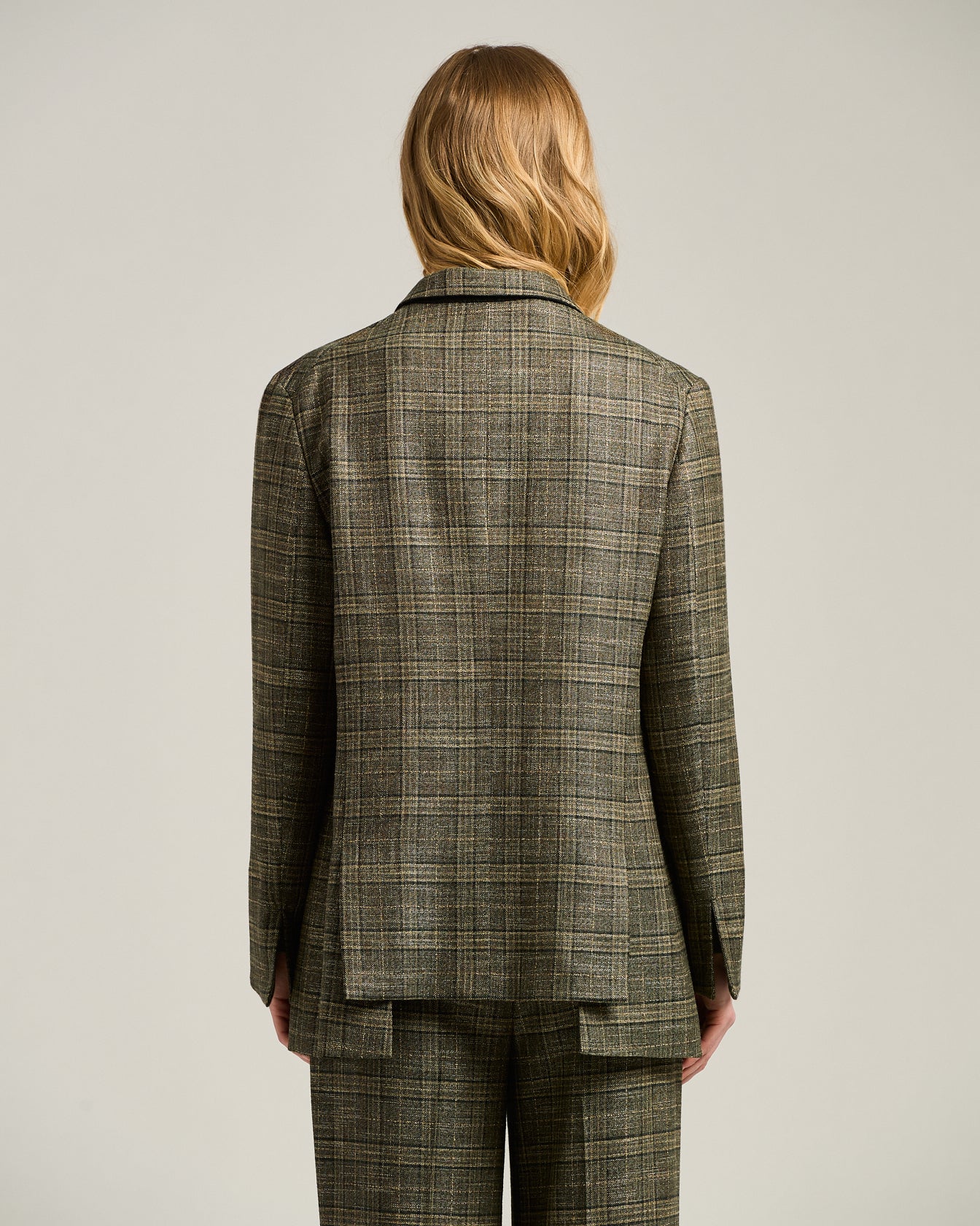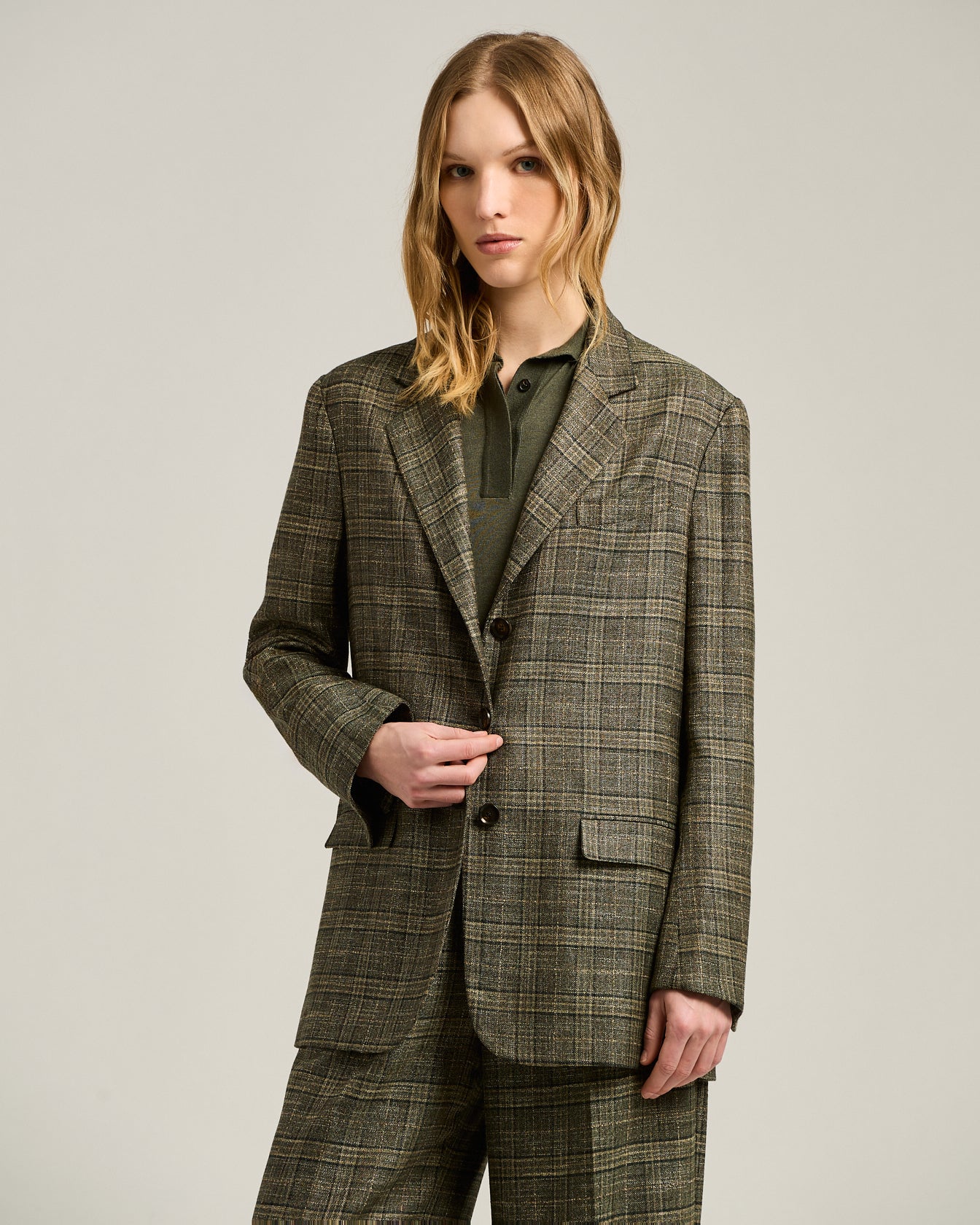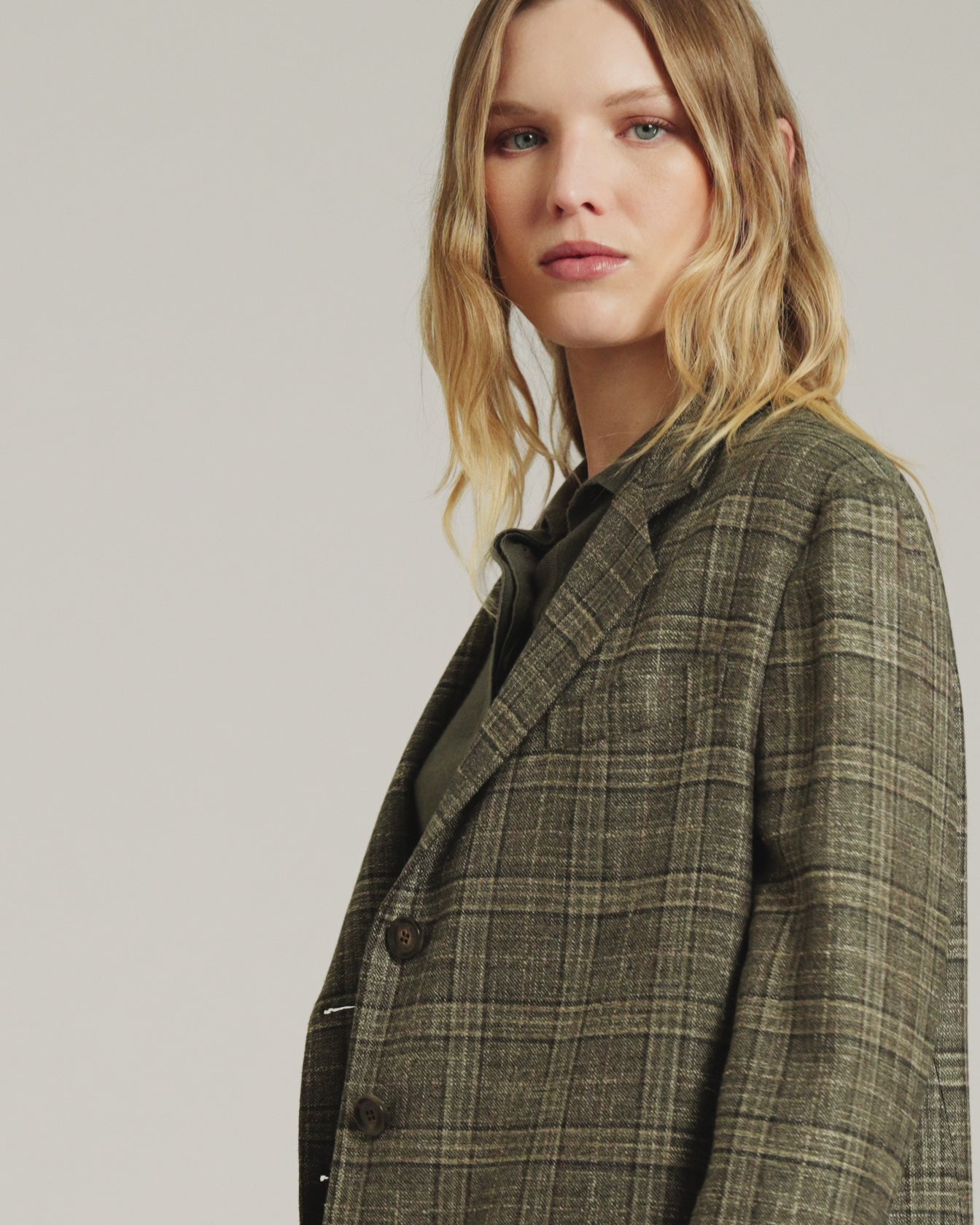 A timeless classic revisited with a contemporary twist, this Glen plaid blazer is characterised by its sophisticated palette of greens and beiges, giving the fabric an understated depth and elegance. Crafted from 100% viscose, the garment combines tailored construction with surprising softness and lightness, ensuring comfort and an impeccable fit. The defined cut and clean lines flatter the silhouette, making this blazer a versatile, sophisticated piece, perfect for adding a touch of character to both formal and casual-chic looks.