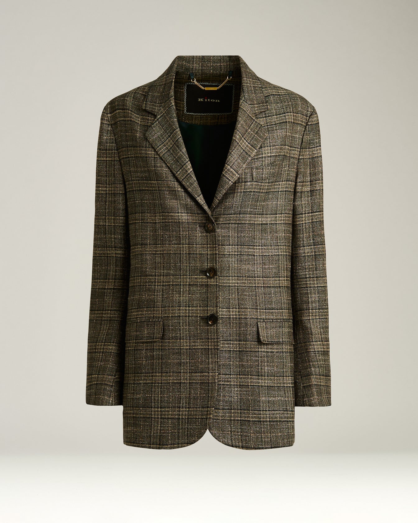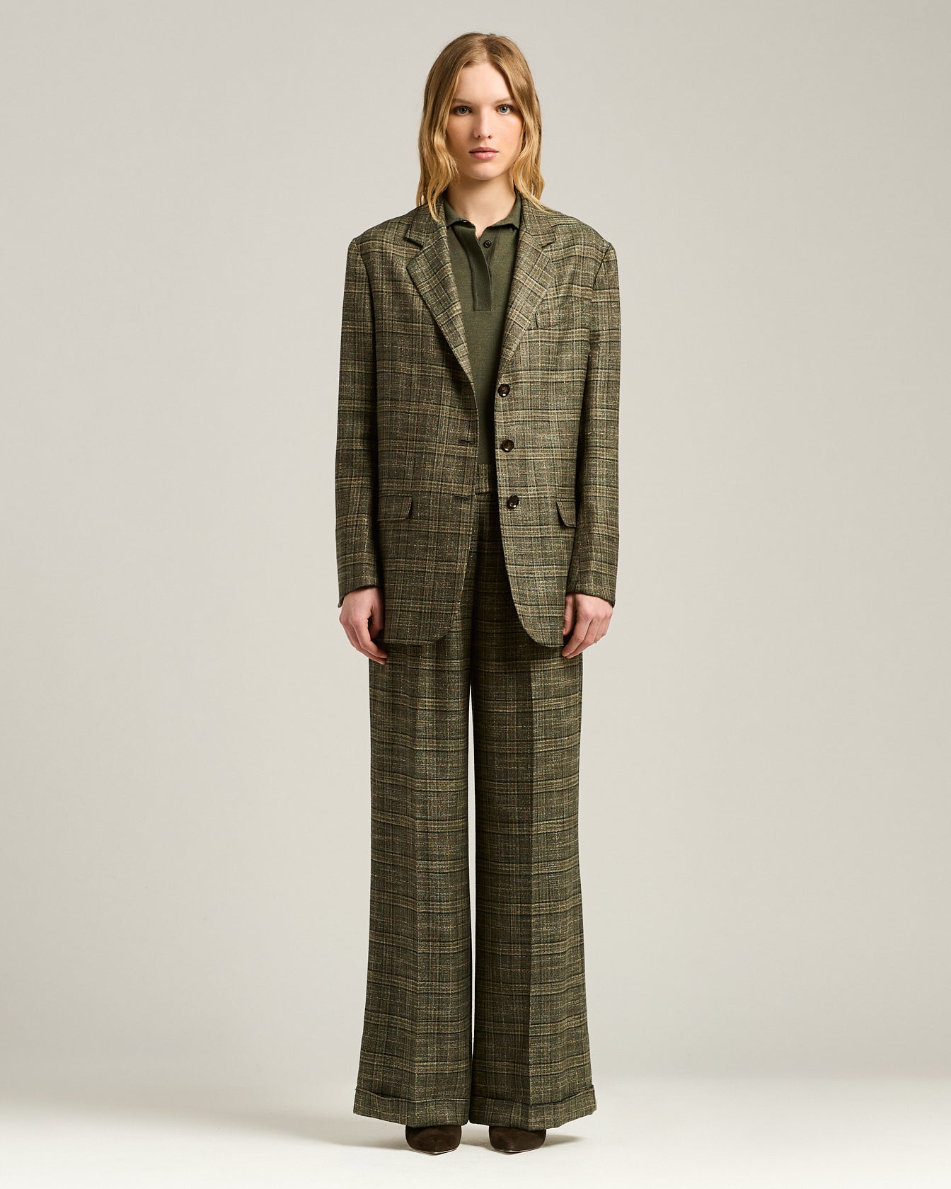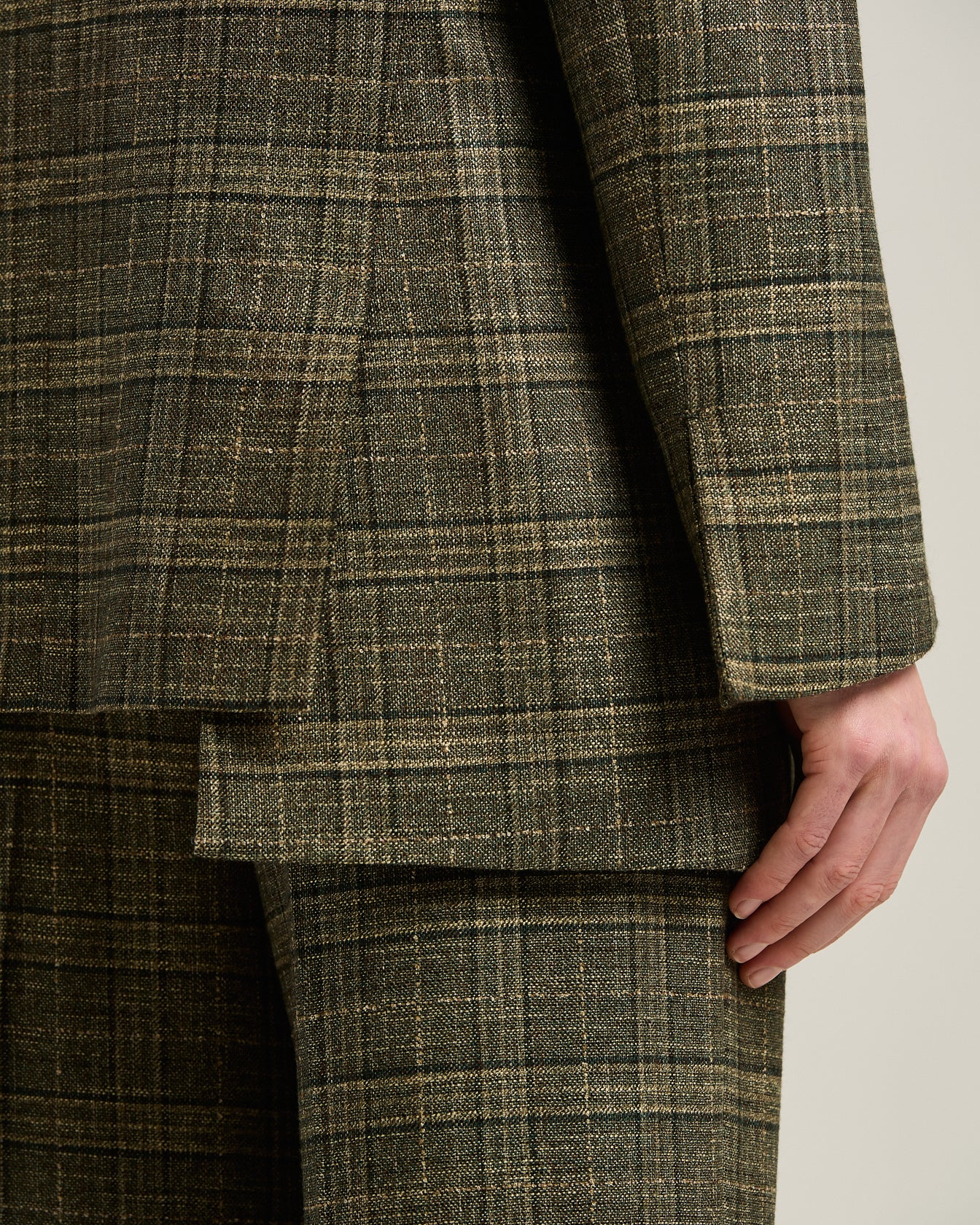 A timeless classic revisited with a contemporary twist, this Glen plaid blazer is characterised by its sophisticated palette of greens and beiges, giving the fabric an understated depth and elegance. Crafted from 100% viscose, the garment combines tailored construction with surprising softness and lightness, ensuring comfort and an impeccable fit. The defined cut and clean lines flatter the silhouette, making this blazer a versatile, sophisticated piece, perfect for adding a touch of character to both formal and casual-chic looks.