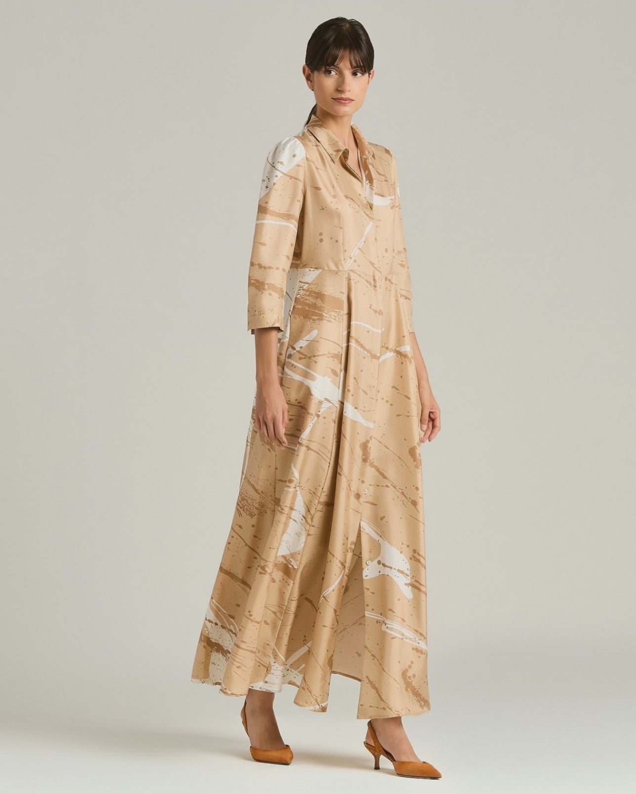 BEIGE PRINTED SILK KNEE-LENGTH SHIRT DRESS