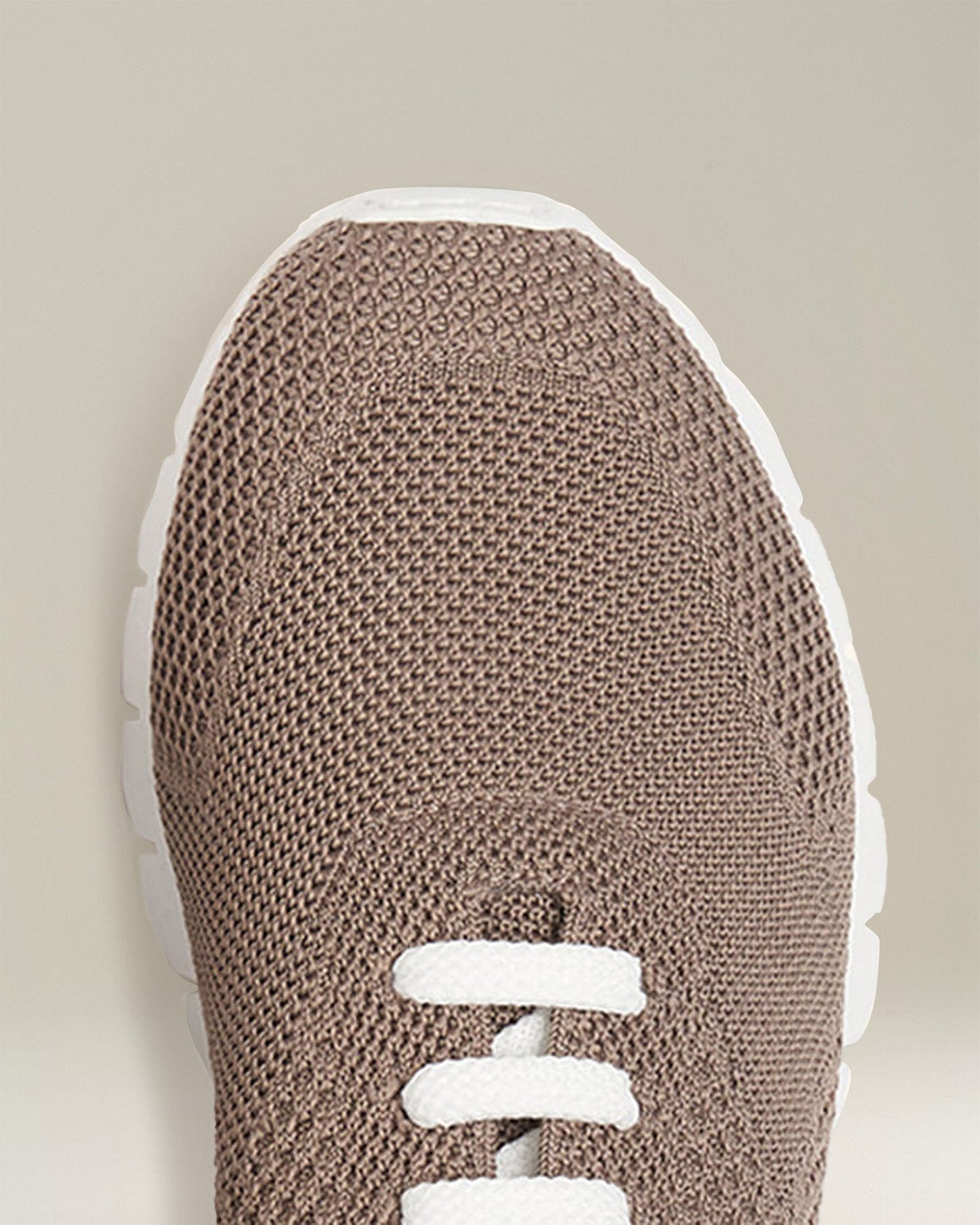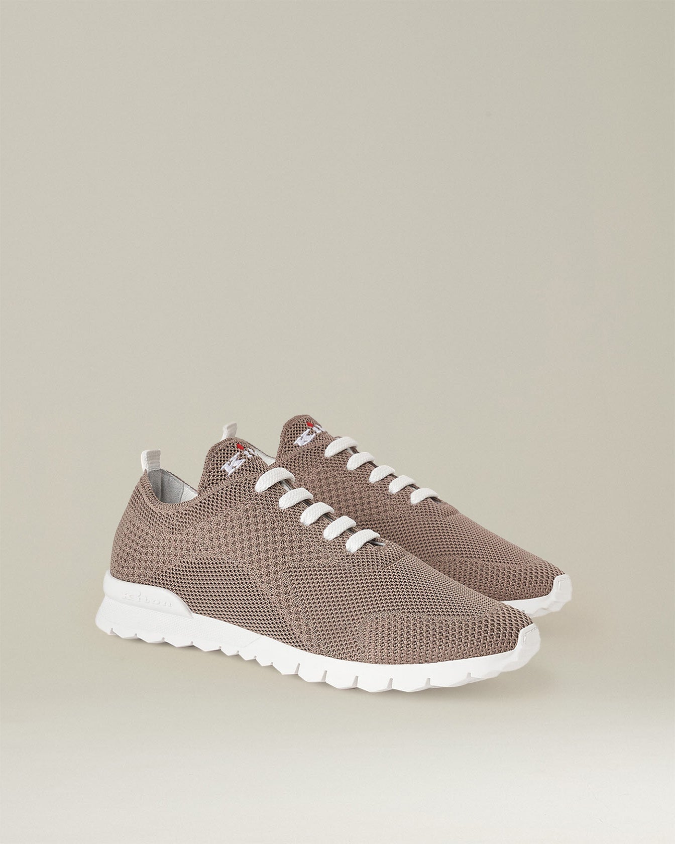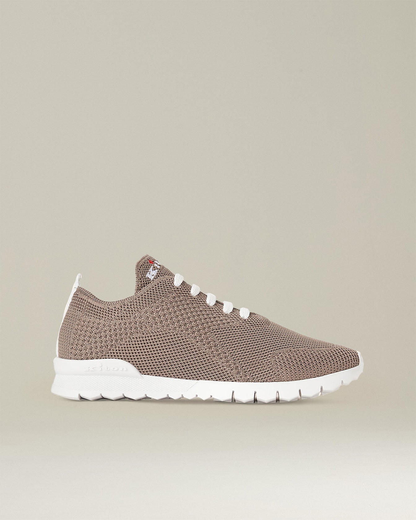 ‘FIT’ model trainers in dove grey knitted fabric. These trainers feature a one-piece upper; the structure is in Kiton knit fabric, rendered unique by the graphic juxtaposition of different stitches. The white sole is flexible and extra-light under foot, and is combined with an elasticated tongue for added comfort. Embroidered Kiton logo; stretch mesh laces which feature the iconic red aglet. All Kiton products are made by expert artisans in our atelier in Naples. The Kiton mission is to innovate in terms of aesthetics and technique, while always keeping tradition in mind. For this item, we’ve interpreted sneakers according to the philosophy of the fashion house, placing quality first and foremost. The benefit of hand-made products lies in their superior comfort: in this case, a particularly soft and ergonomic insole. Dry clean to keep them looking their best.