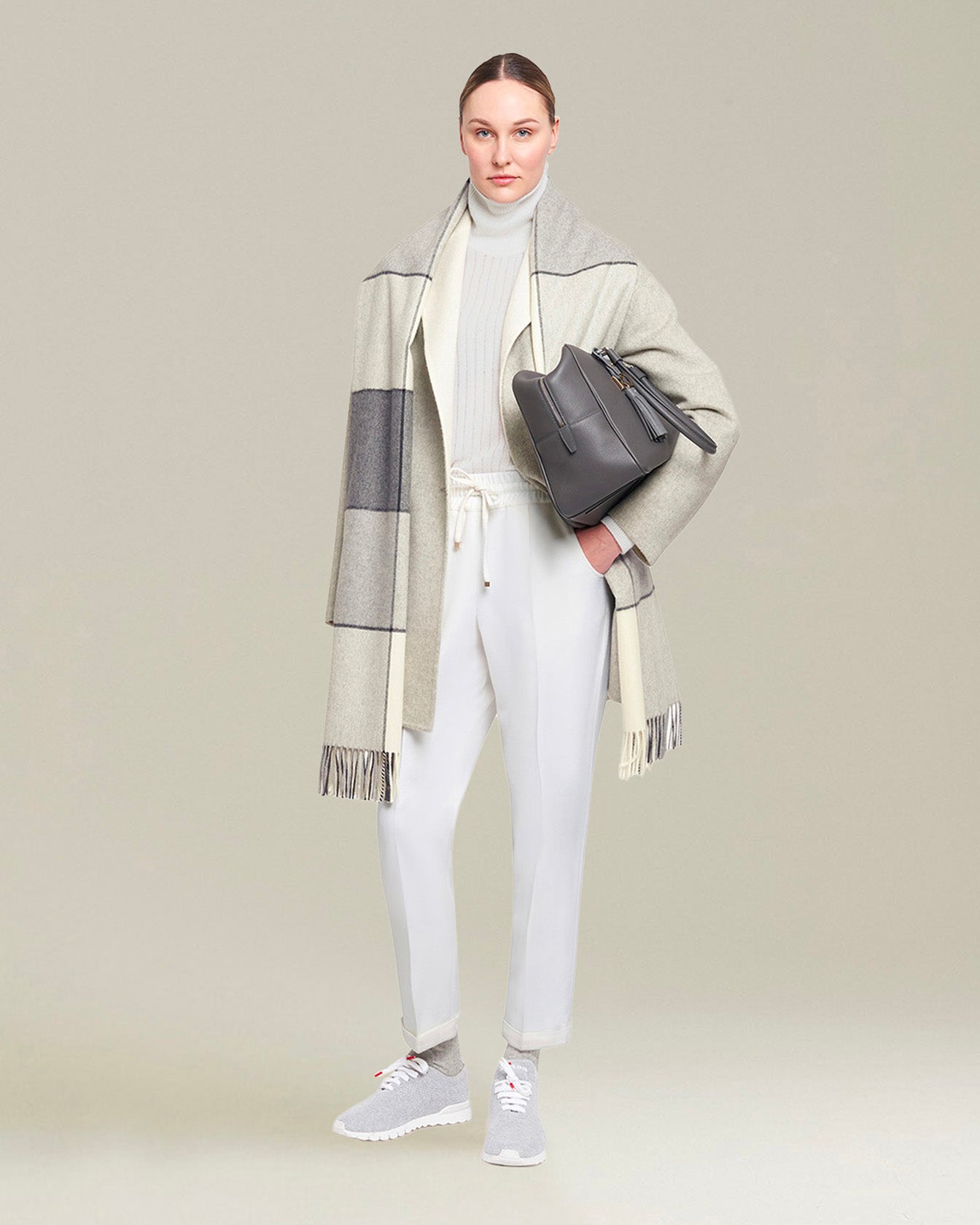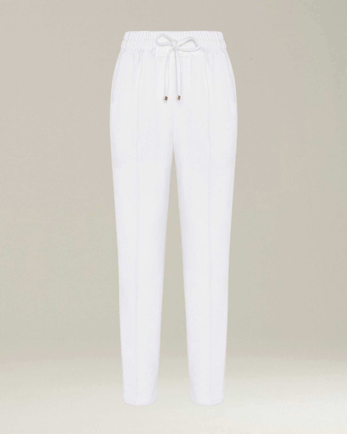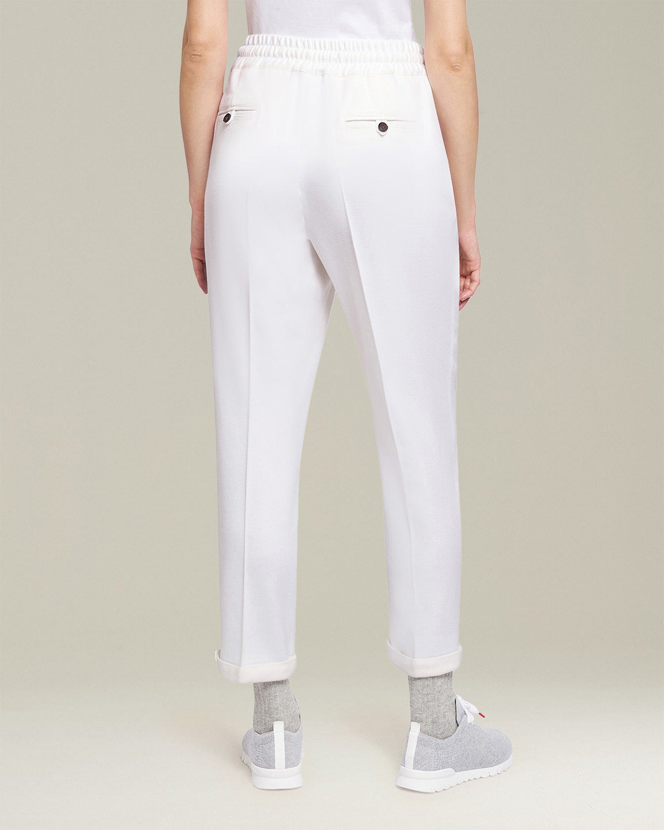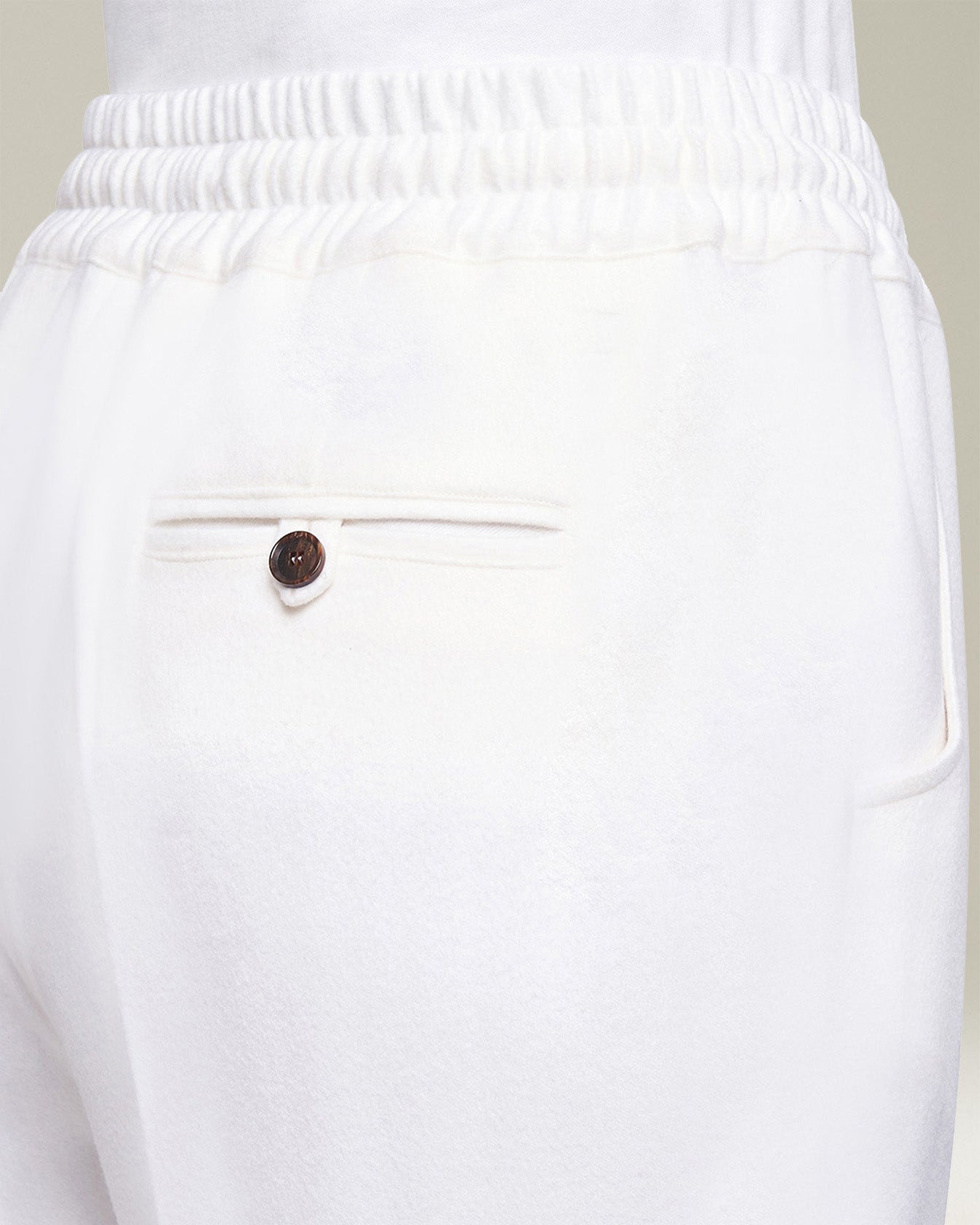 Drawstring trousers made from fine white cashmere. An authentic must-have from the Kiton womenswear collection, drawstring trousers combine comfort and style, a key piece in the promotion of relaxed elegance. Thanks to the adjustable fit of the drawstring waist and the relaxed width of the leg, this trouser style easily adapts to any silhouette. It’s also ideal to wear when travelling. Ankle-length leg; 2 cm turn-up cuff. These Kiton trousers can be worn on any occasion, whether styled with a sporty look or paired with a jacket for a casual-chic ensemble. To maintain the beauty of your Kiton garment, we recommend professional laundering and pressing.
