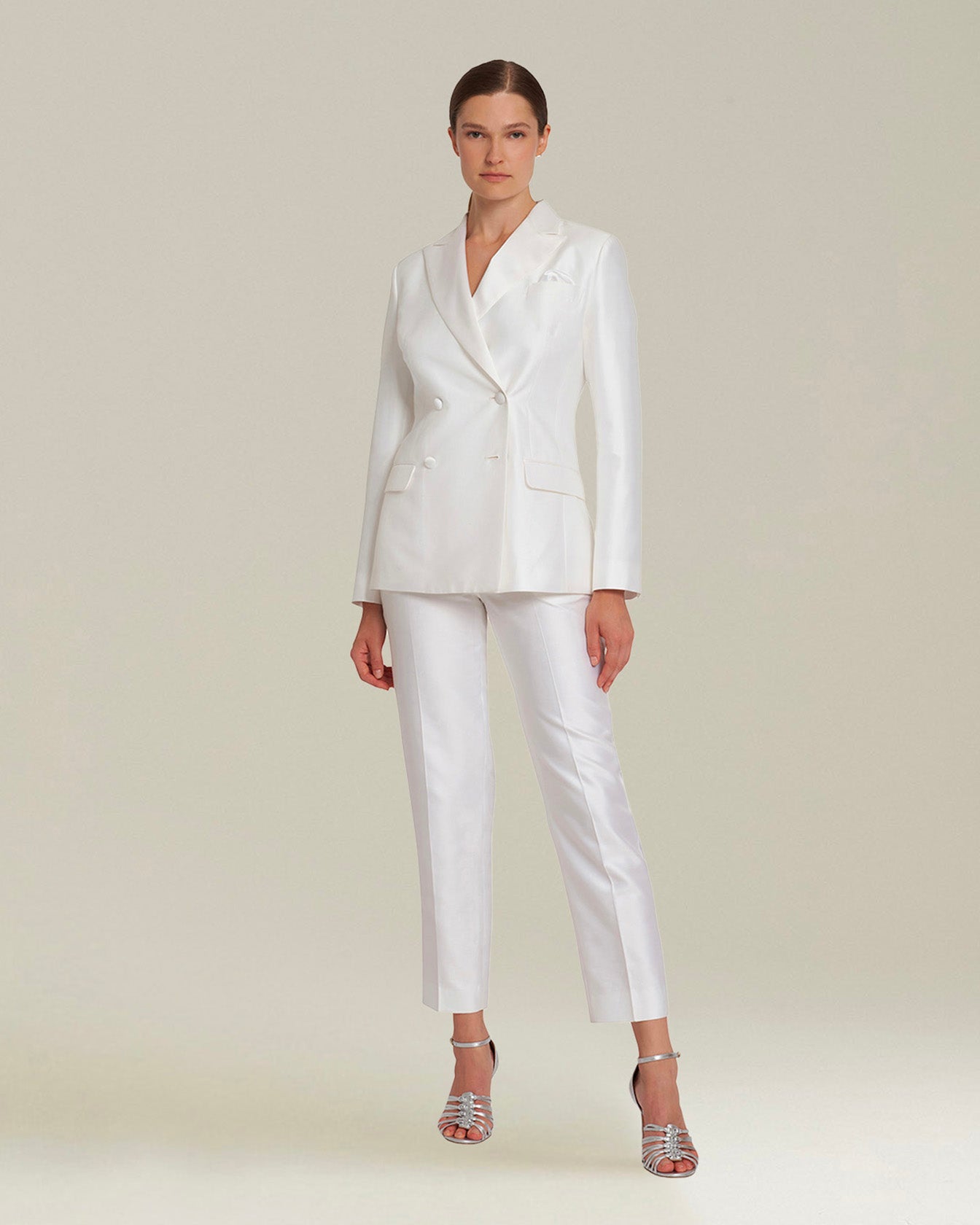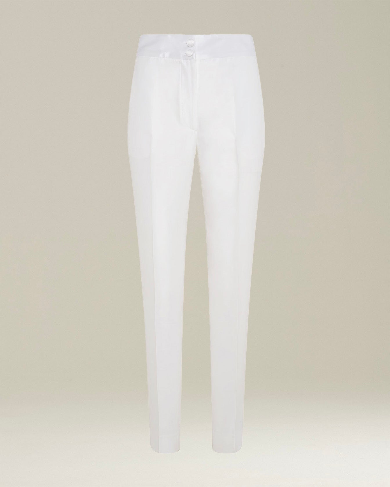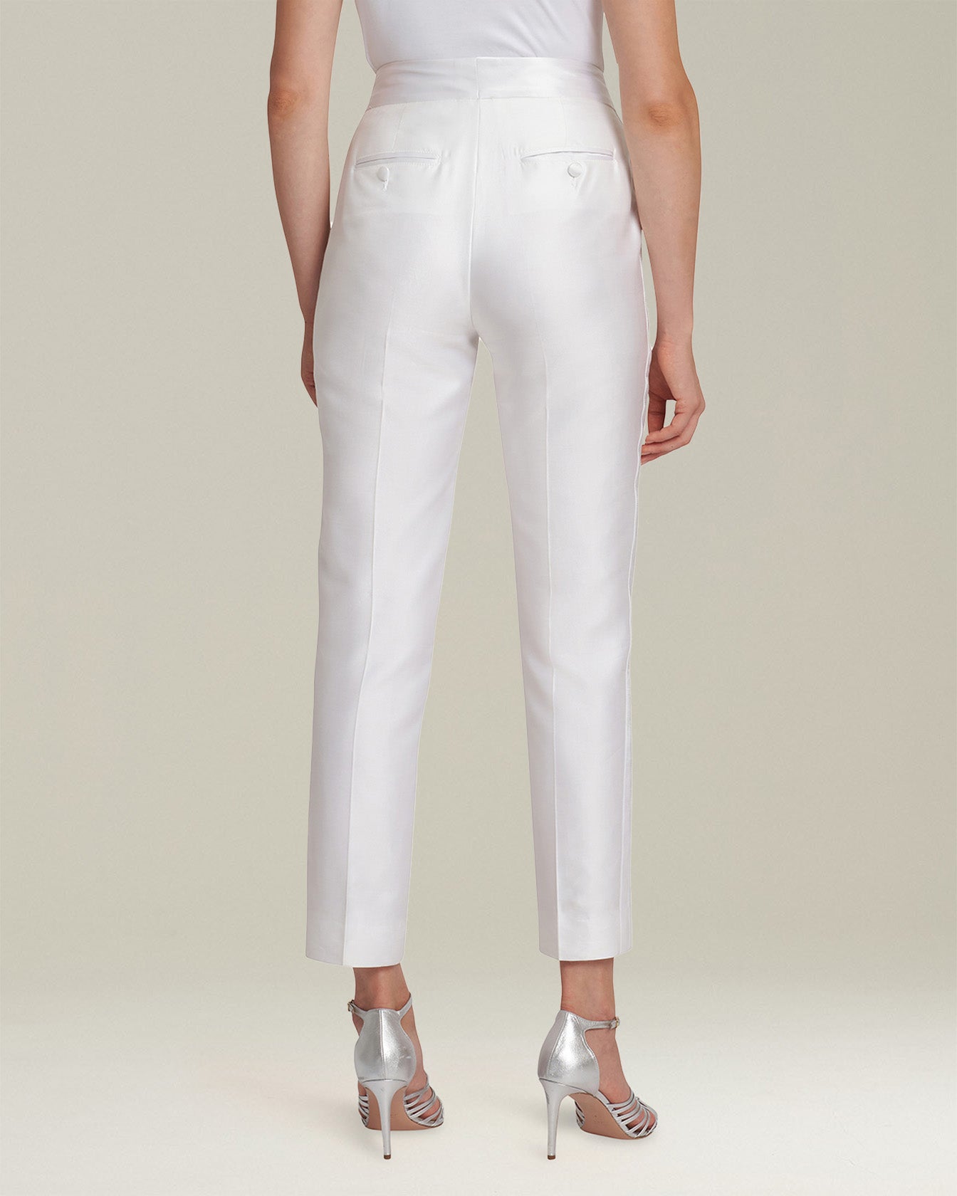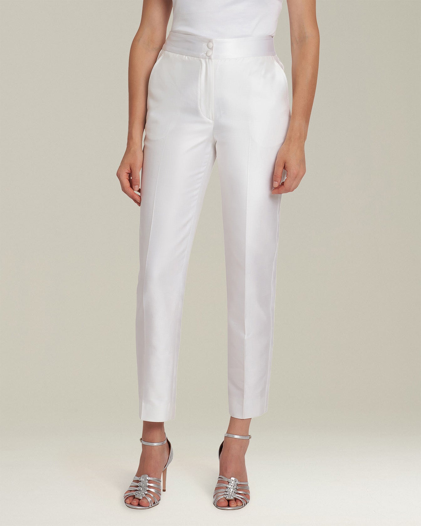 Shiny-effect cigarette trousers made from a light and fluid blend of cotton and silk with satin piping, designed to be paired with the jacket for a modern tuxedo. The garment, entirely cut and sewn by hand in Naples by our master tailors, is characterised by a tailored construction with a straight line that gives the trousers a classic male-inspired flavour. The trousers have double front buttoning, pockets set into the seams and two back pockets with satin-lined buttons. To maintain the beautyof your Kiton garment, we recommend professional laundering and pressing.