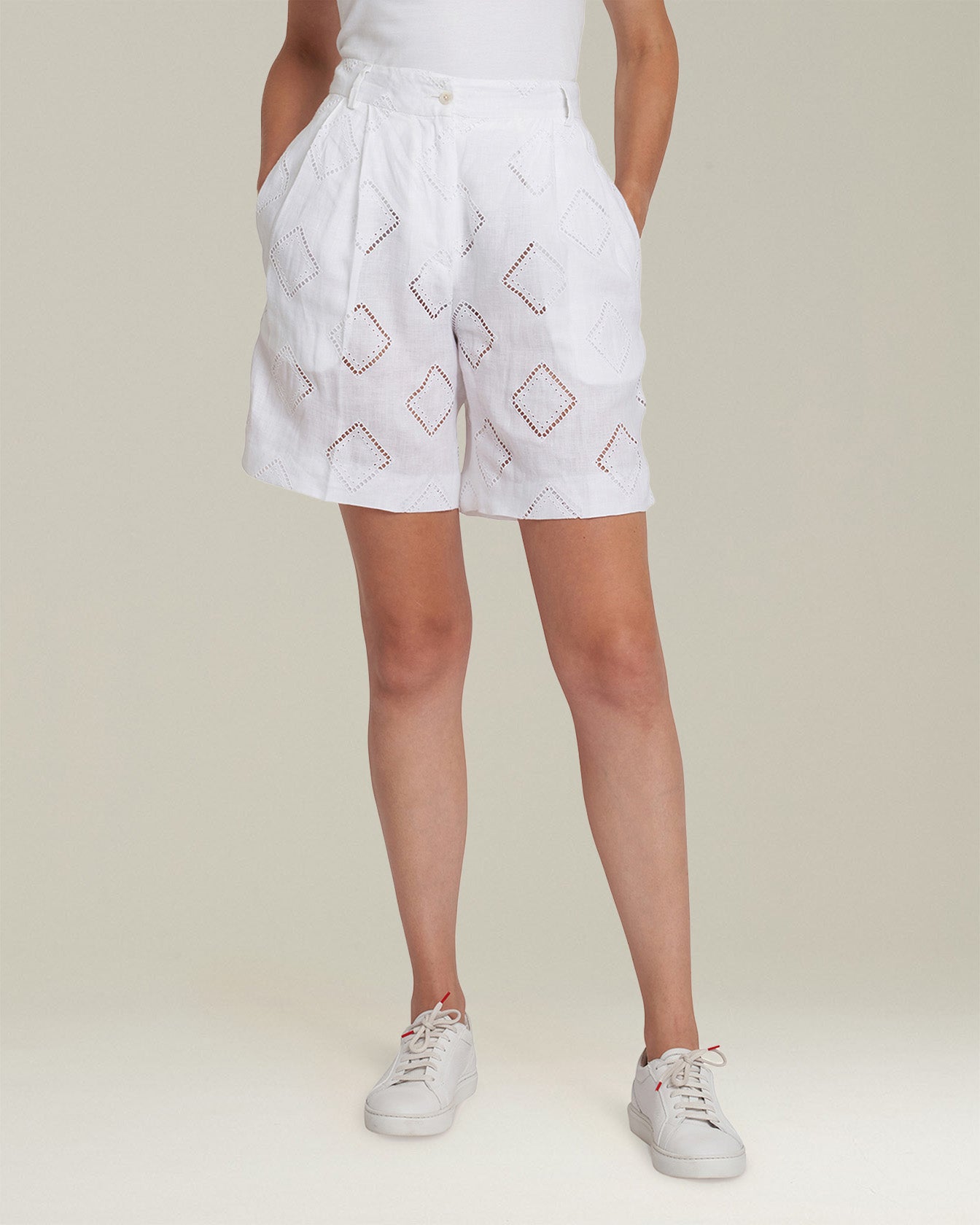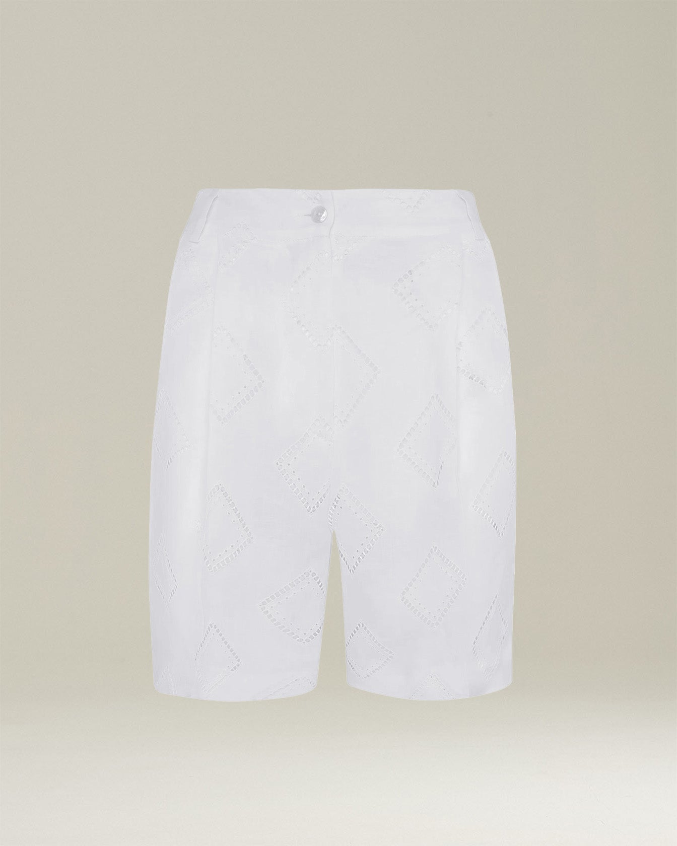White bermuda shorts made from cotton with broderie anglaise detailing. The garment, entirely cut and sewn by the expert hands of our master tailors in Naples, features a dart at the front, two slant pockets at the sides, while the back is characterised by two welt pockets. These Kiton bermuda shorts are perfect for your free time. They speak to a classy woman with a strong and passionate personality, a fine connoisseur of traditional tailoring. It marks the return of the magic of an item of clothing that is worn for the delight of dressing to please yourself, as if it were a second skin. Self pampering in the name of tactile and visual indulgence. To maintain the beauty of your Kiton garment, we recommend professional laundering and pressing.