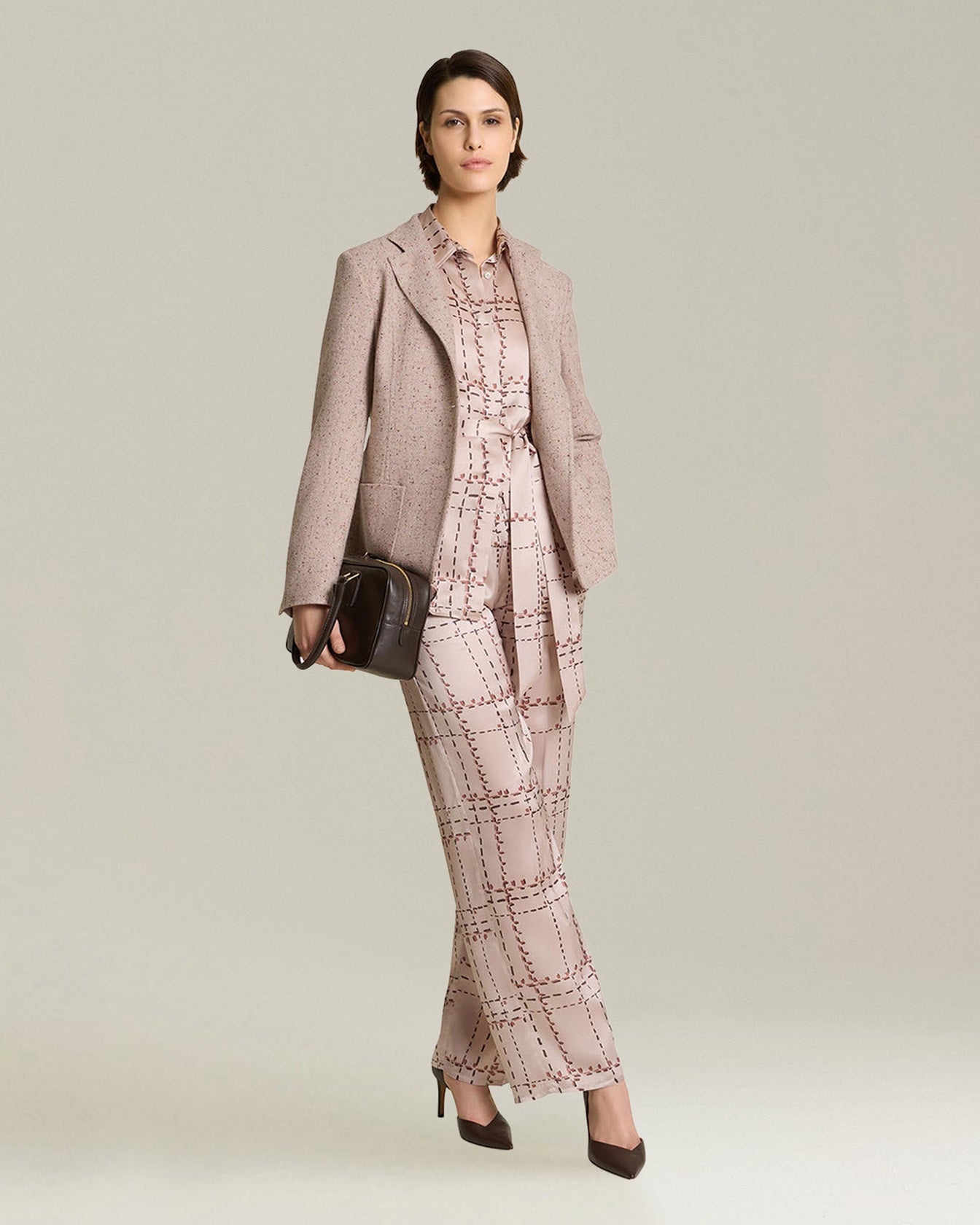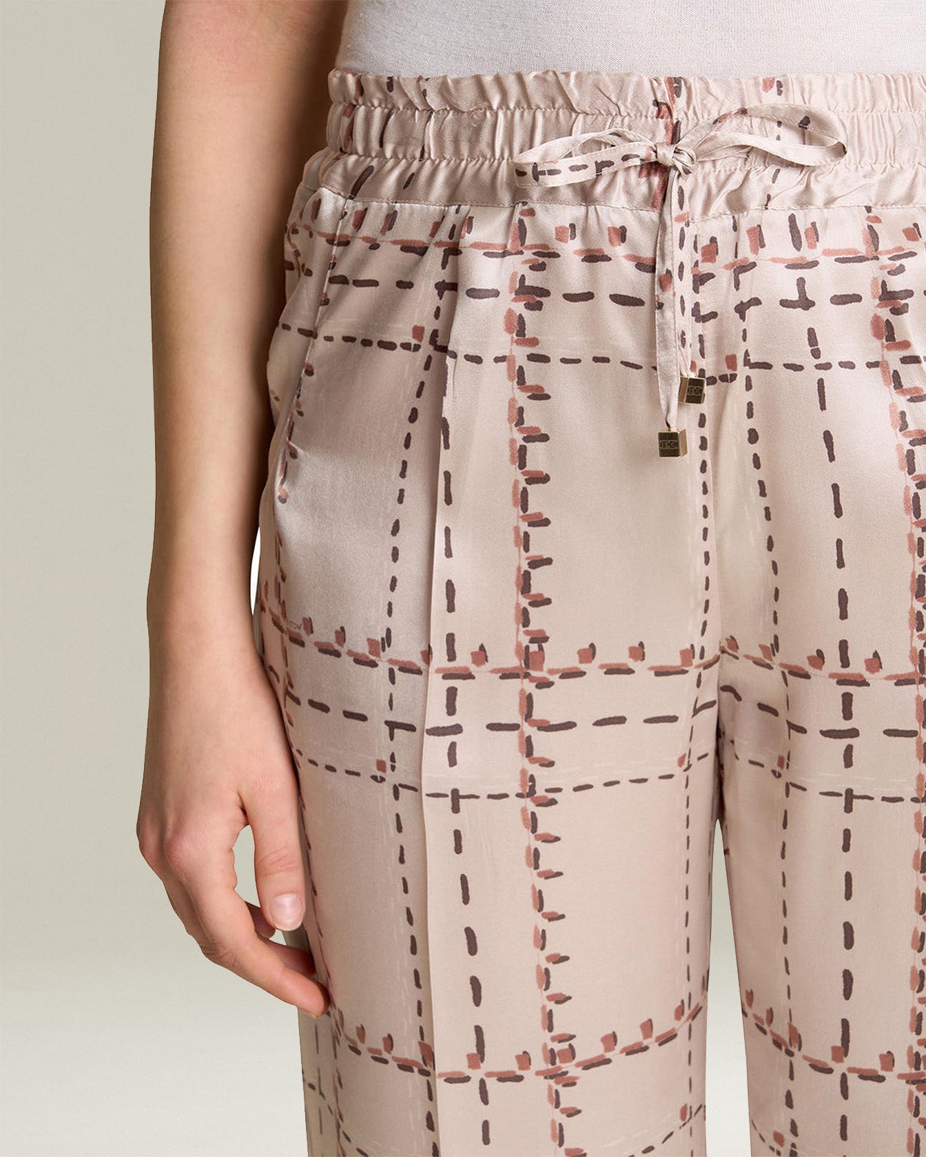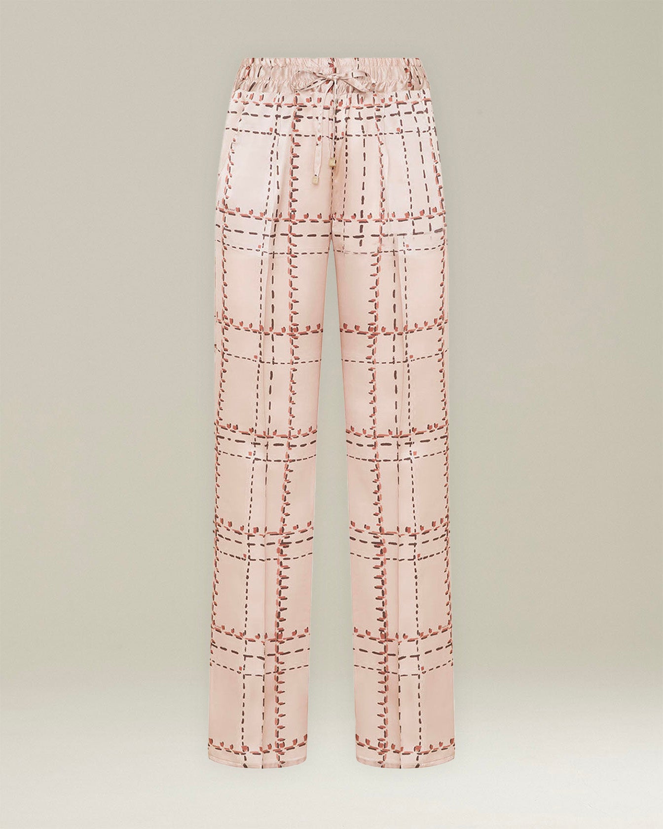 An authentic must-have from the Kiton womenswear collection, the drawstring trousers combine comfort and style, promoting the culture of relaxed elegance. Perfect for travelling in style, these trousers reveal a discerning taste and represent the synthesis of sophistication and practicality. The softness of the silk, complemented by the geometric print, lends a fluidity to the fit. The garment is defined by its high waist, elasticated waistband and wide leg, for a relaxed silhouette that brings a casual feel to the look. These Kiton trousers can be worn on any occasion, whether styled with a sporty look or paired with a jacket for a casual-chic ensemble.