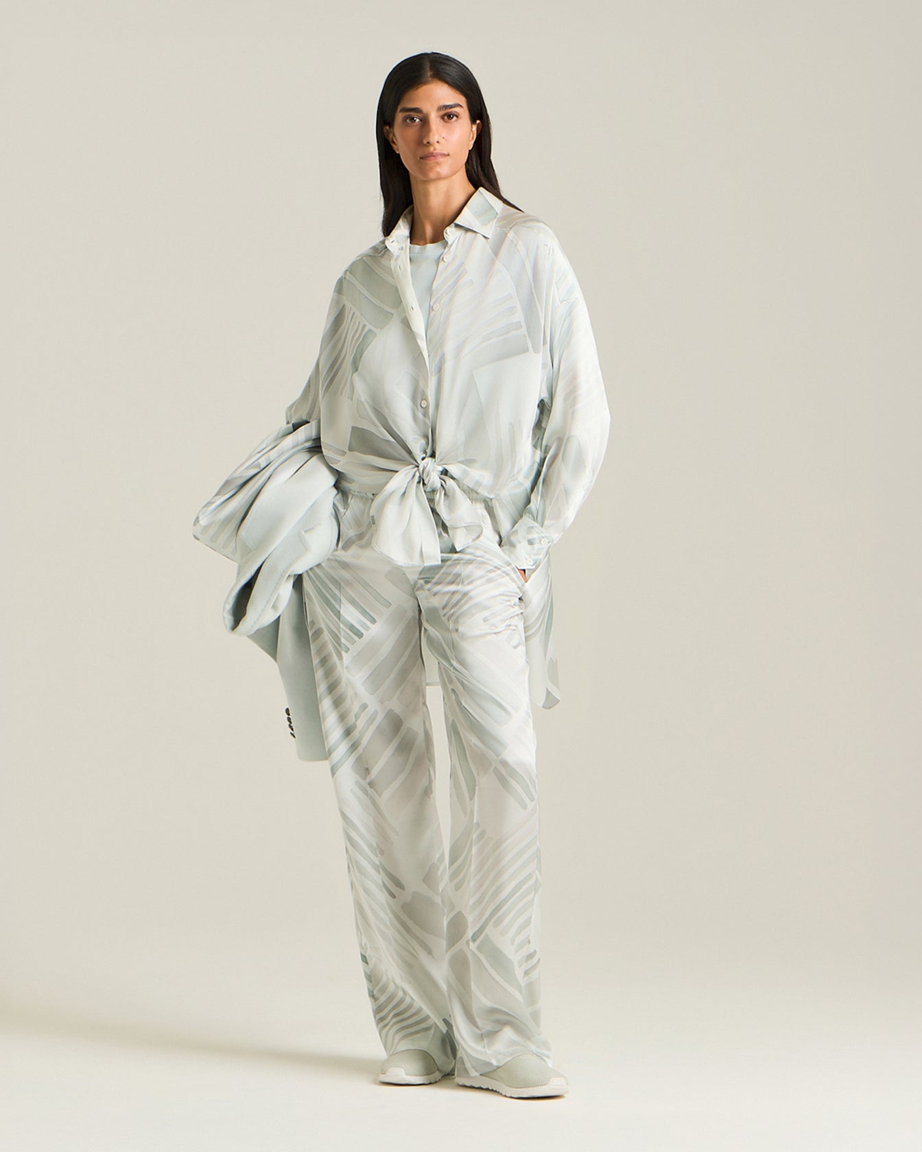 These trousers blend comfort and style to embody relaxed, contemporary elegance. The soft silk, enhanced by the Ethnic Brush print, adds a light fluidity to the silhouette. With a high elastic waist, wide leg, and oversized design, these Kiton trousers offer an effortlessly chic look, perfect for a sporty outfit or a casual-chic pairing with a jacket.