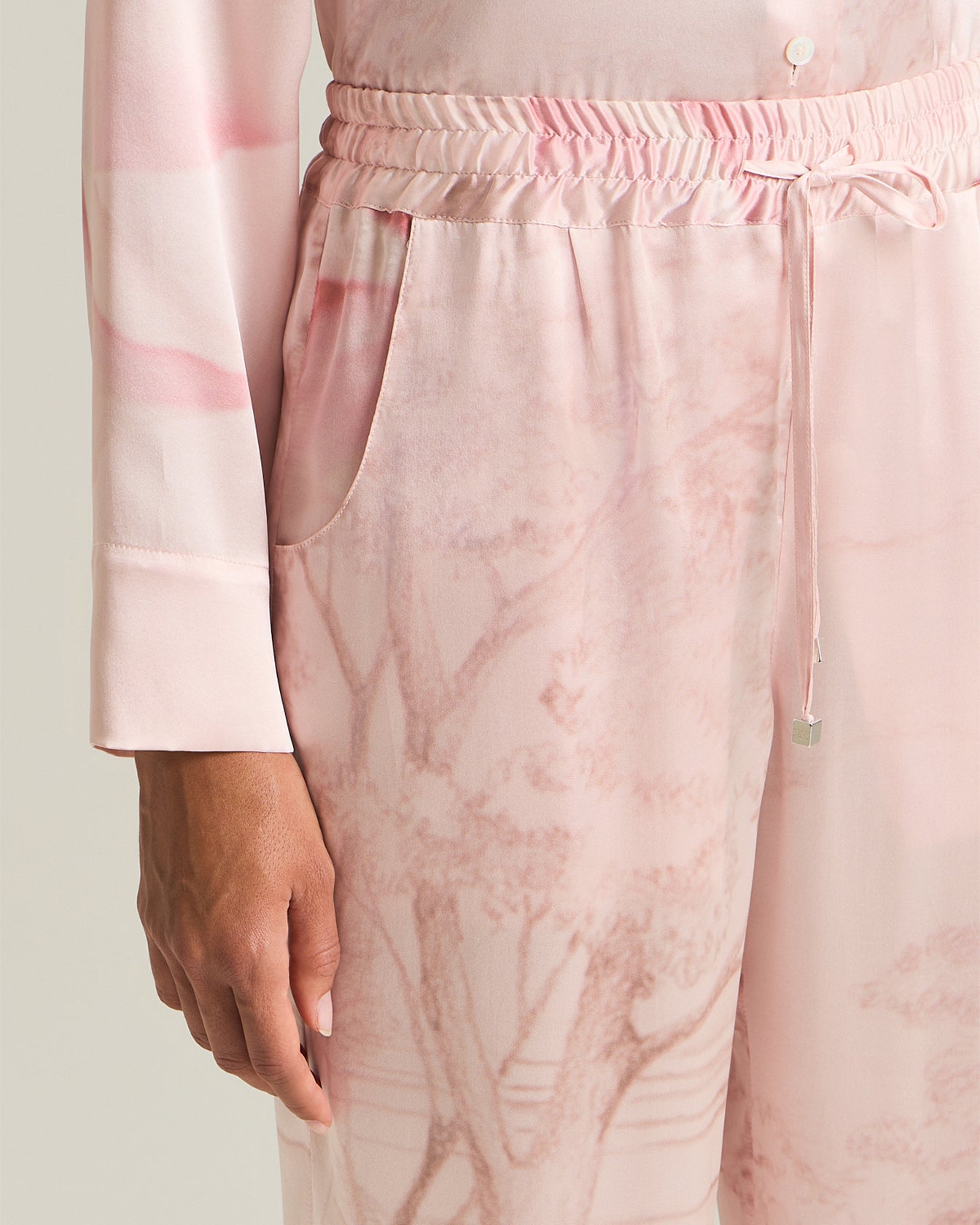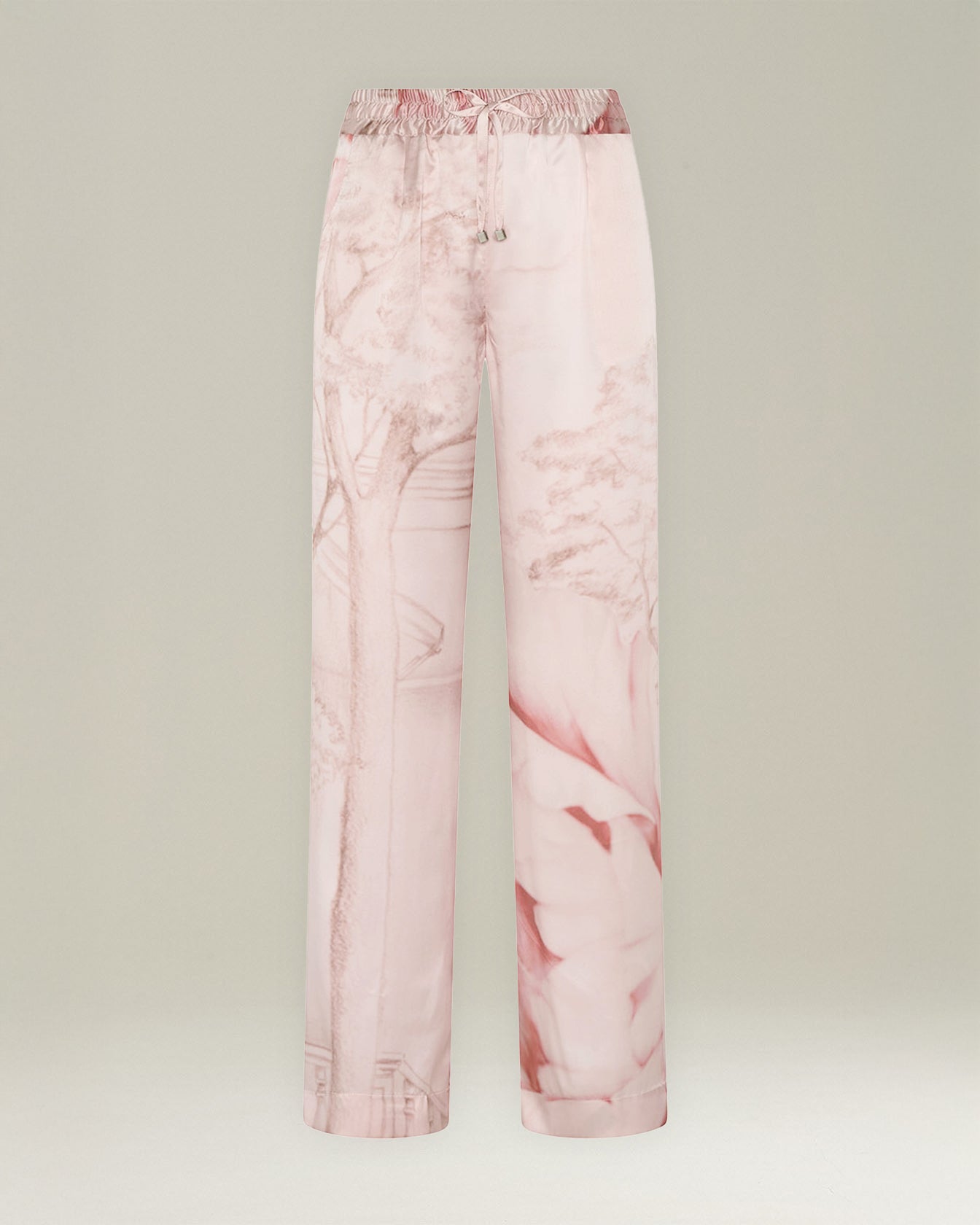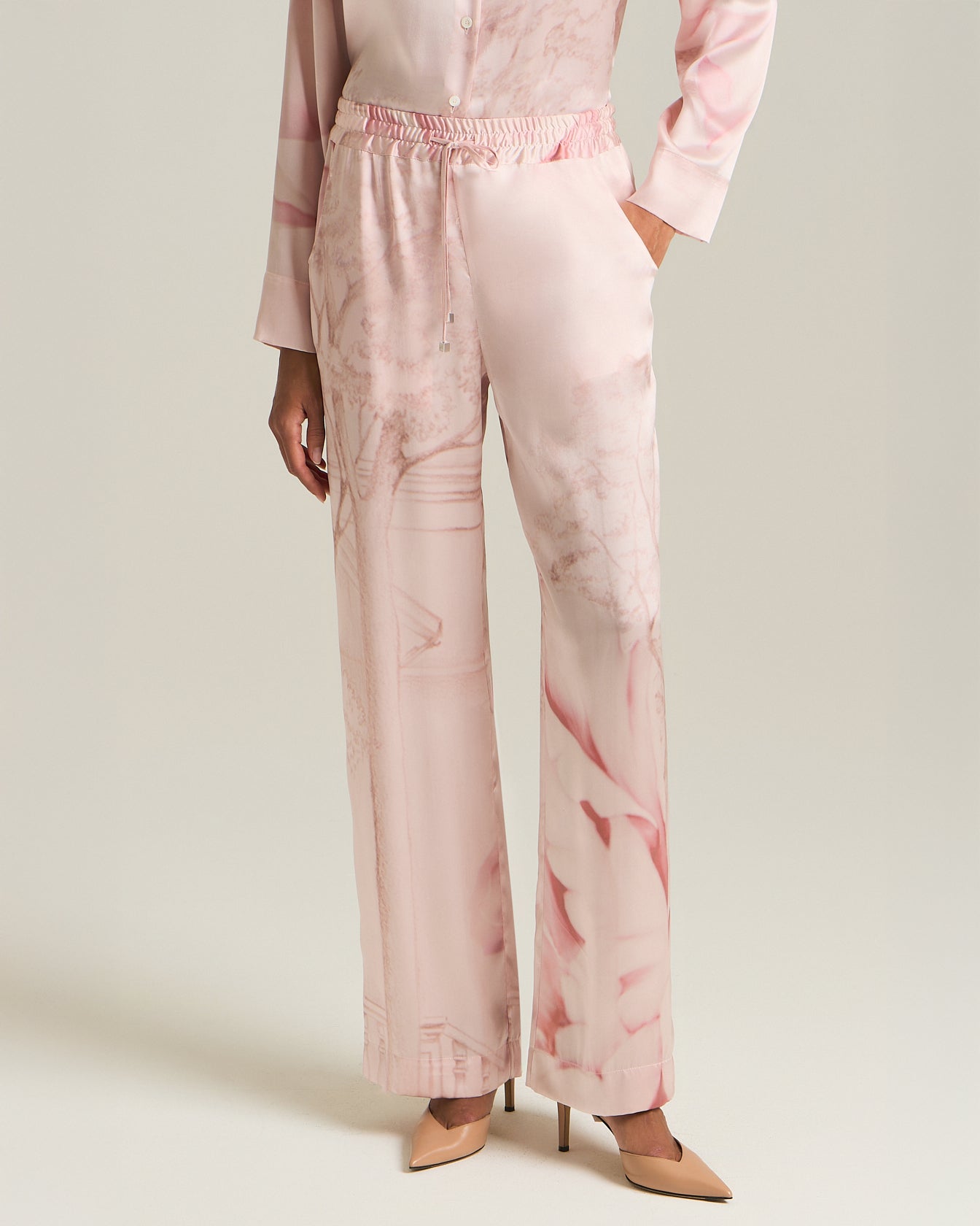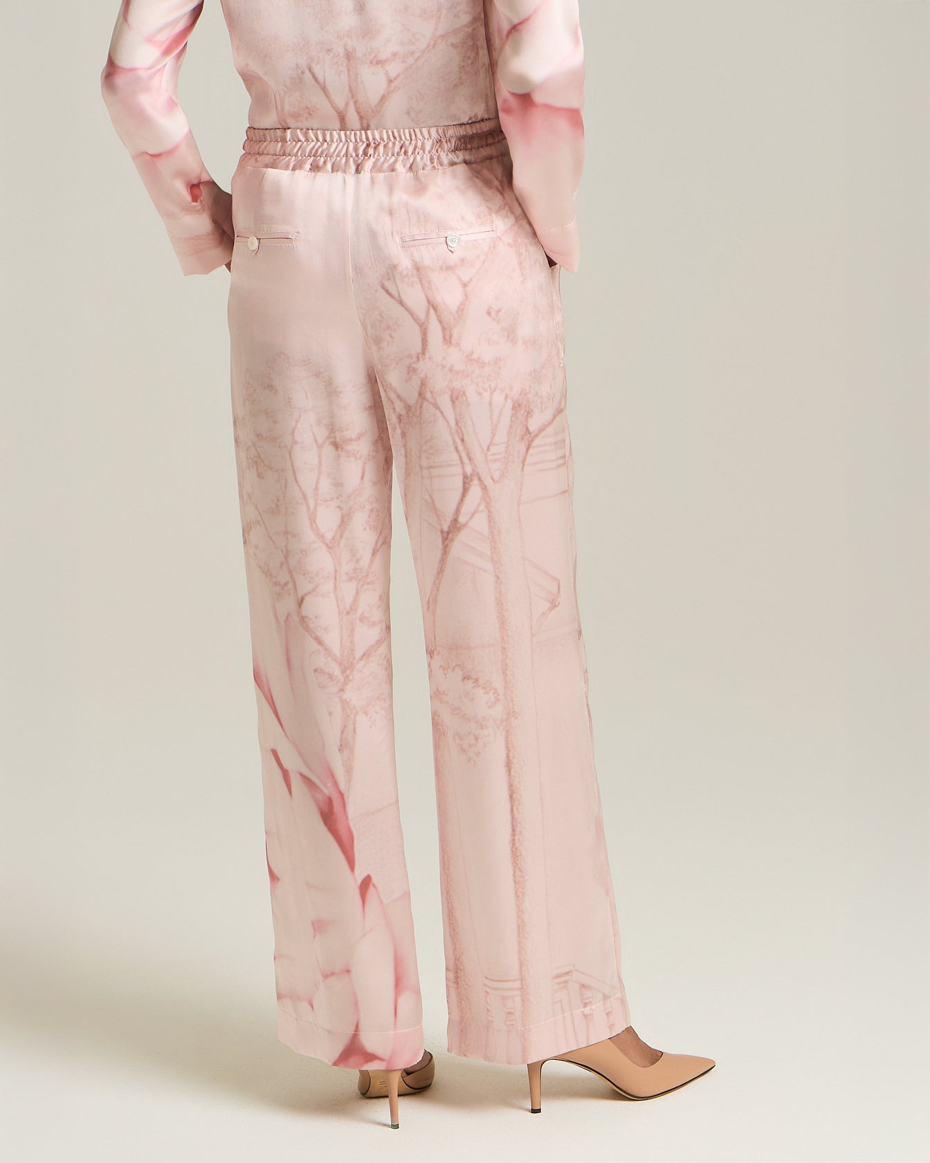 Combining comfort and style, these Kiton trousers promote a culture of relaxed elegance. Perfect for travelling in style, these trousers reveal a discerning taste and represent the synthesis of sophistication and practicality. The softness of the silk, enhanced by the print evoking the enchanting architecture of the gardens of Naples, gives the fit great fluidity. A high-waist cut defines them, paired with an elasticated waistband and a wide leg for an oversized silhouette which lends a casual feel to the look.