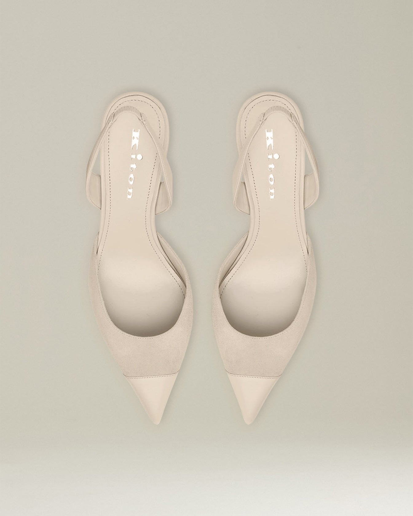 Kiton’s slingback pumps embody the essence of sophistication and contemporary design, making them a must-have in every woman’s wardrobe. Crafted from the finest suede and embellished with premium leather details, these shoes feature a sleek silhouette that combines minimalist aesthetics with sophisticated functionality. The 7 cm heel offers the perfect balance of comfort and style, making these pumps ideal for enhancing any outfit with a touch of elegance. The slingback design not only provides a comfortable and secure fit, but also allows you to take on daily challenges with style and determination.