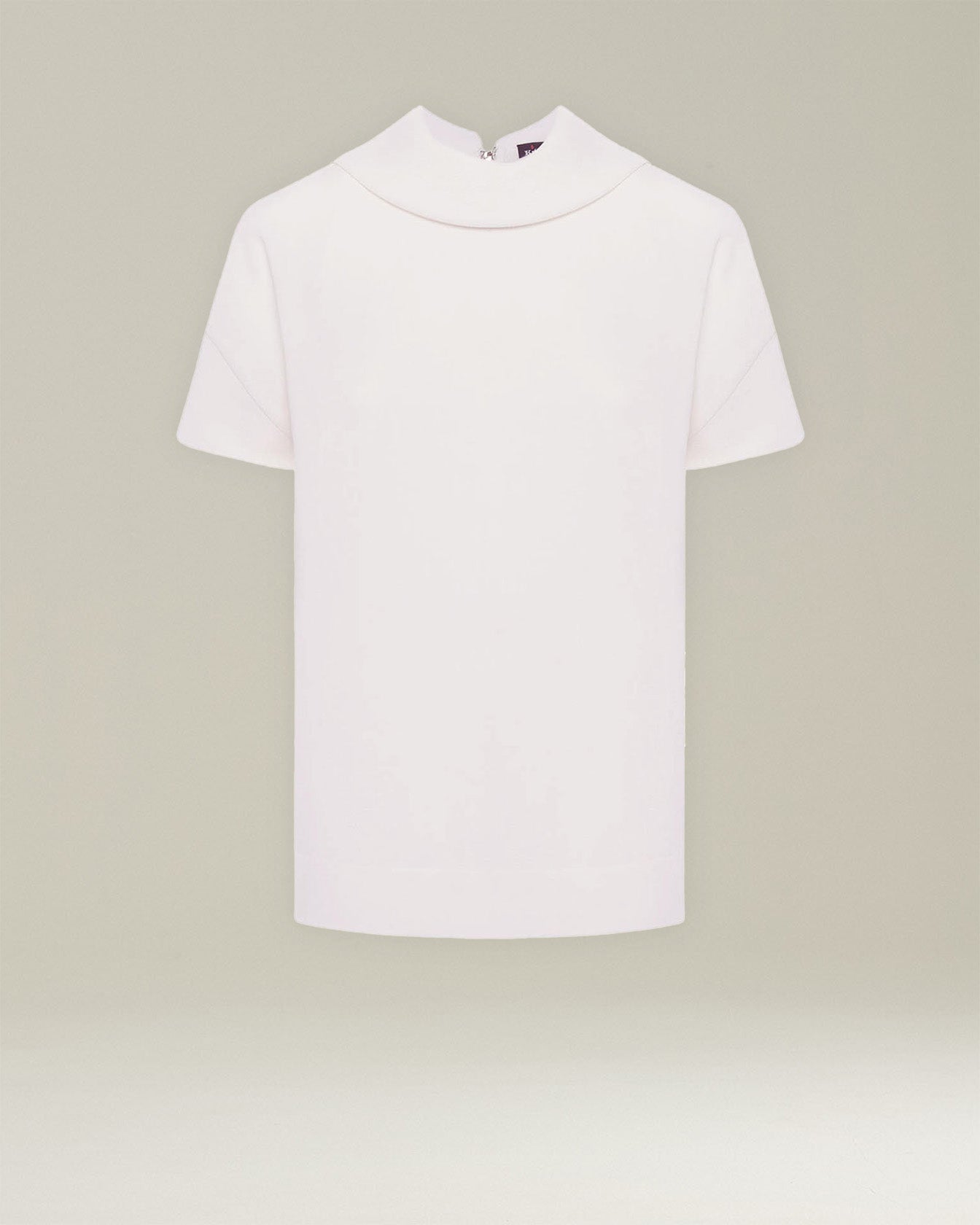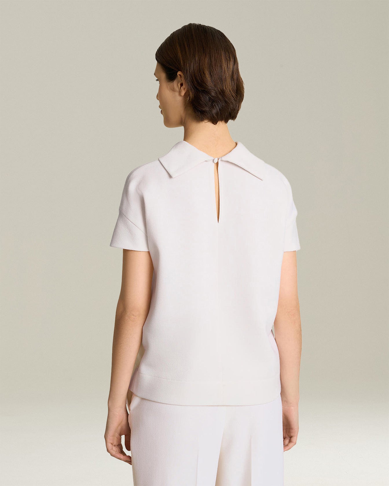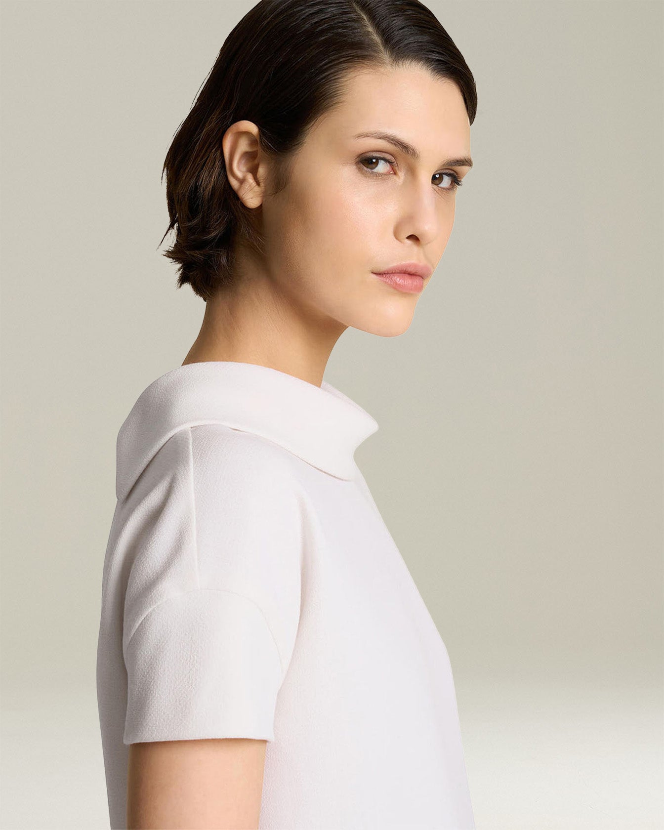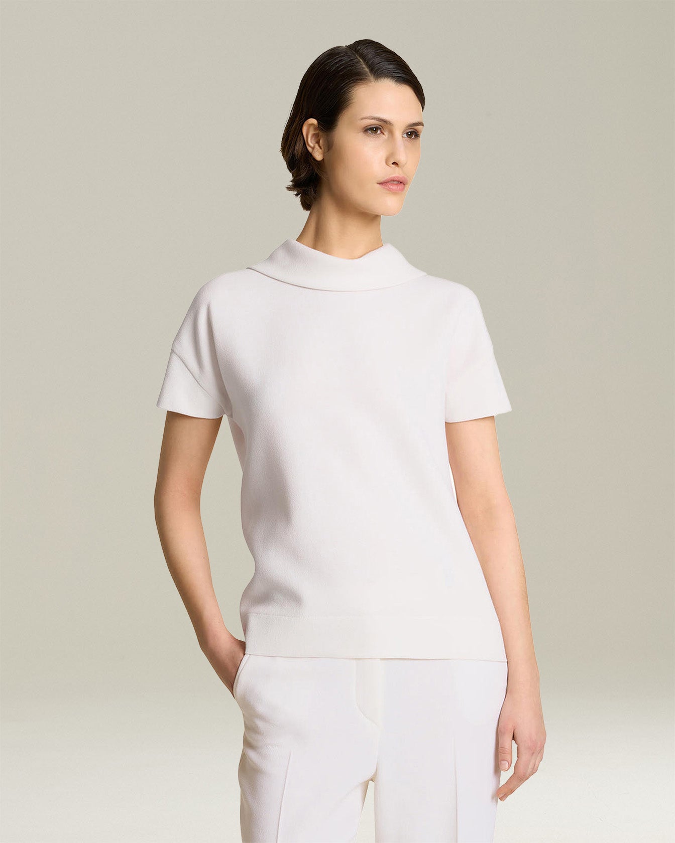 A supreme expression of elegance, the Kiton blouse gracefully blends sophisticated details and impeccable lines to delicately hug the feminine silhouette. This short-sleeved, half-necked blouse in fine wool has a soft, flowing texture that sits gracefully on the body and lends wearers an aura of sophisticated simplicity.