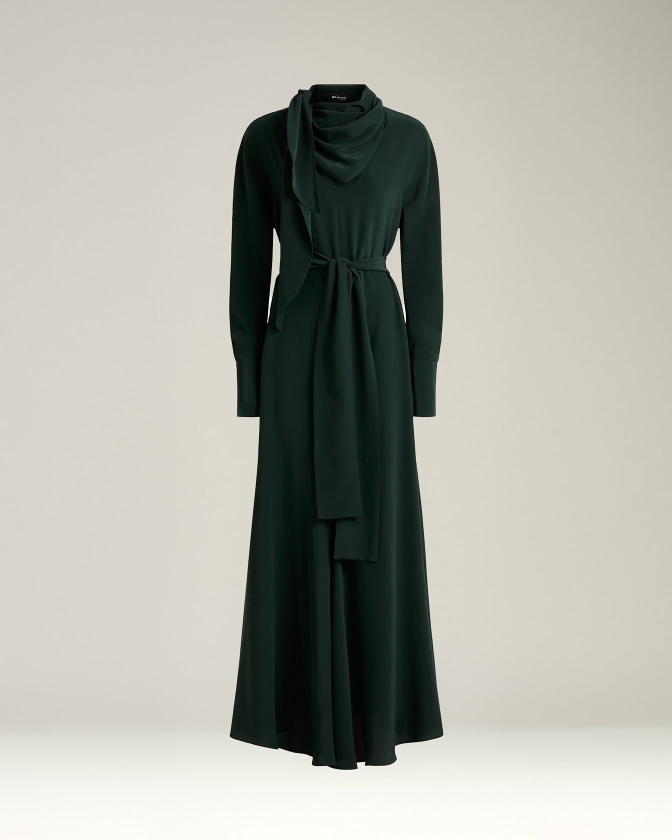 PINE GREEN LONG SILK DRESS WITH DRAPED NECKLINE
