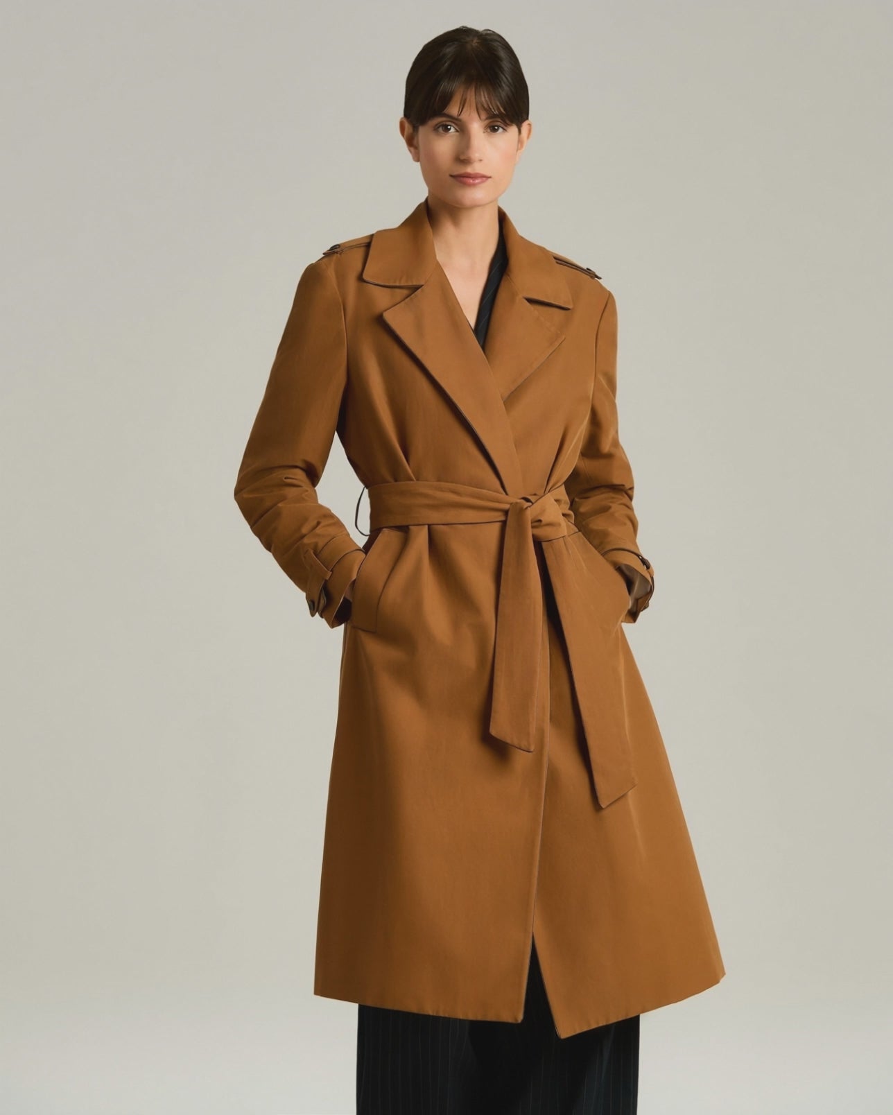 The fabric structure follows the trenchs lines with natural ease, highlighting the garments simple construction The compact handle ensures protection and lightness, while the belt defines the silhouette with balance. Tailored details, such as shoulder flaps and collar finishes, reflect a precise approach to craftsmanship. An overcoat designed to adapt to movement with comfort and visual clarity, ideal for an understated and impeccable style.