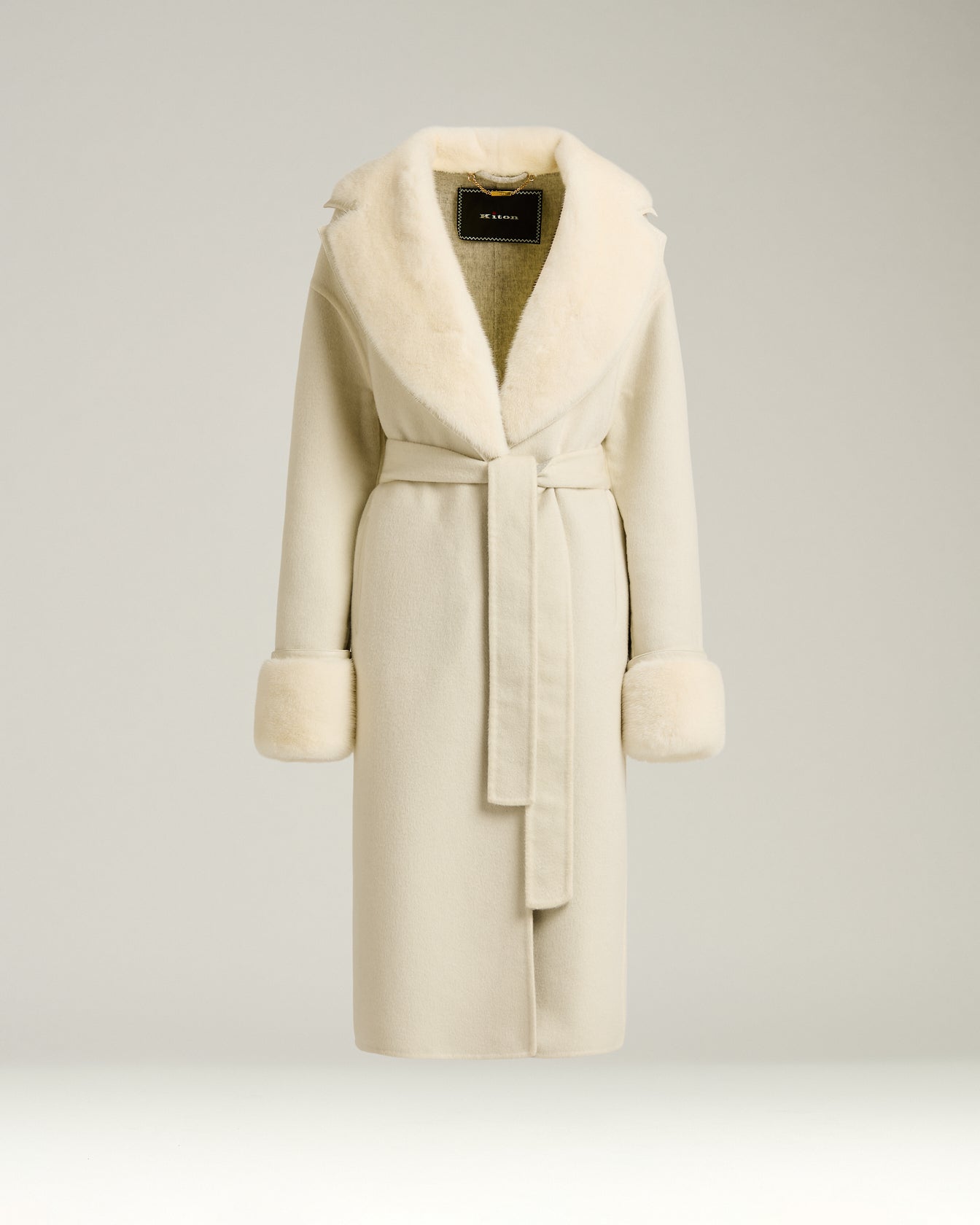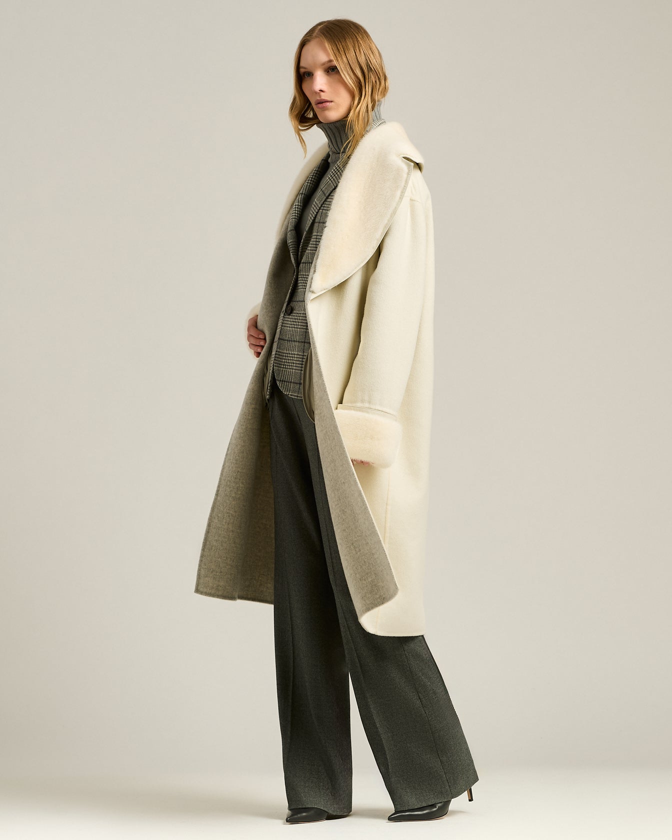 Timeless elegance takes form in this overcoat crafted from pure cashmere, enhanced by precious fur details. The silhouette is long and enveloping, designed to offer protection and style on the coldest days. The shawl collar and cuff turn-backs are lined with soft tone-on-tone fur, which amplifies the sensation of warmth and refinement. The relaxed cut is completed by a fabric belt that allows you to adjust the fit, emphasising the waist. A piece of excellence, expressing superior craftsmanship and sophisticated comfort, ideal for those seeking discrete yet unmistakable beauty.