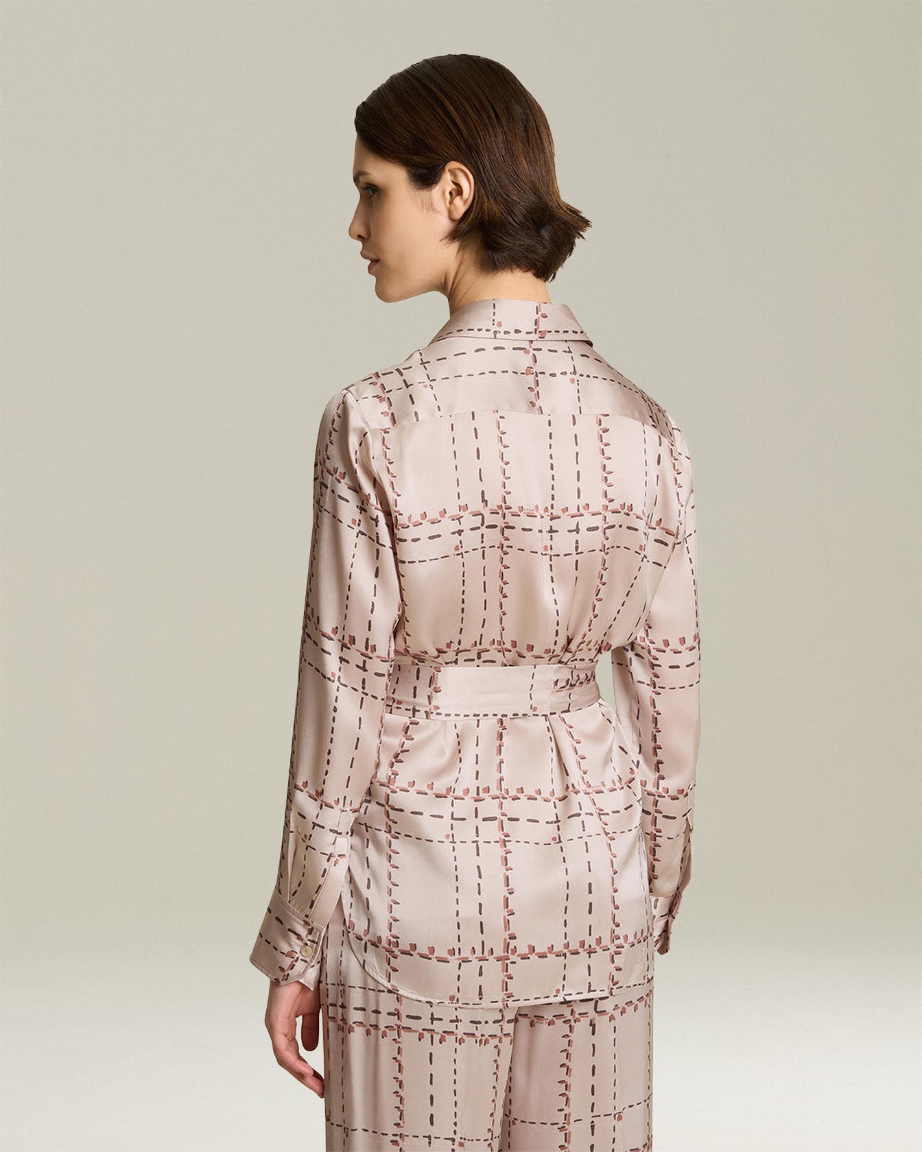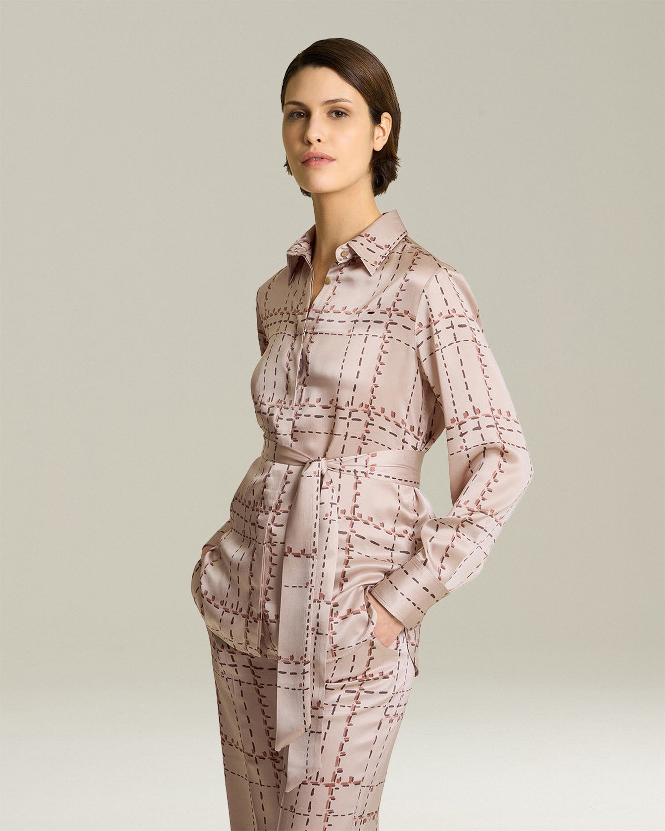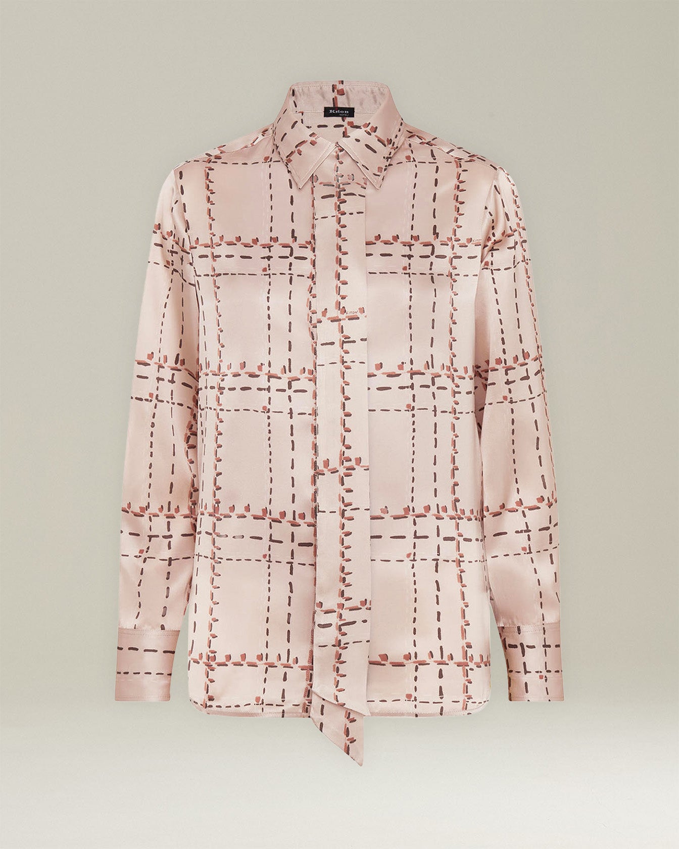 Masculine inspiration meets feminine lines in this classically cut silk shirt with a geometric print. The sophisticated elegance of the garment is enhanced by the concealed buttoning, making it ideal for formal events. The design is complemented by a decorative scarf that can also be worn as a belt for a versatile touch. With 22 steps completed by hand in our Neapolitan atelier, each Kiton shirt reflects unparalleled craftsmanship.