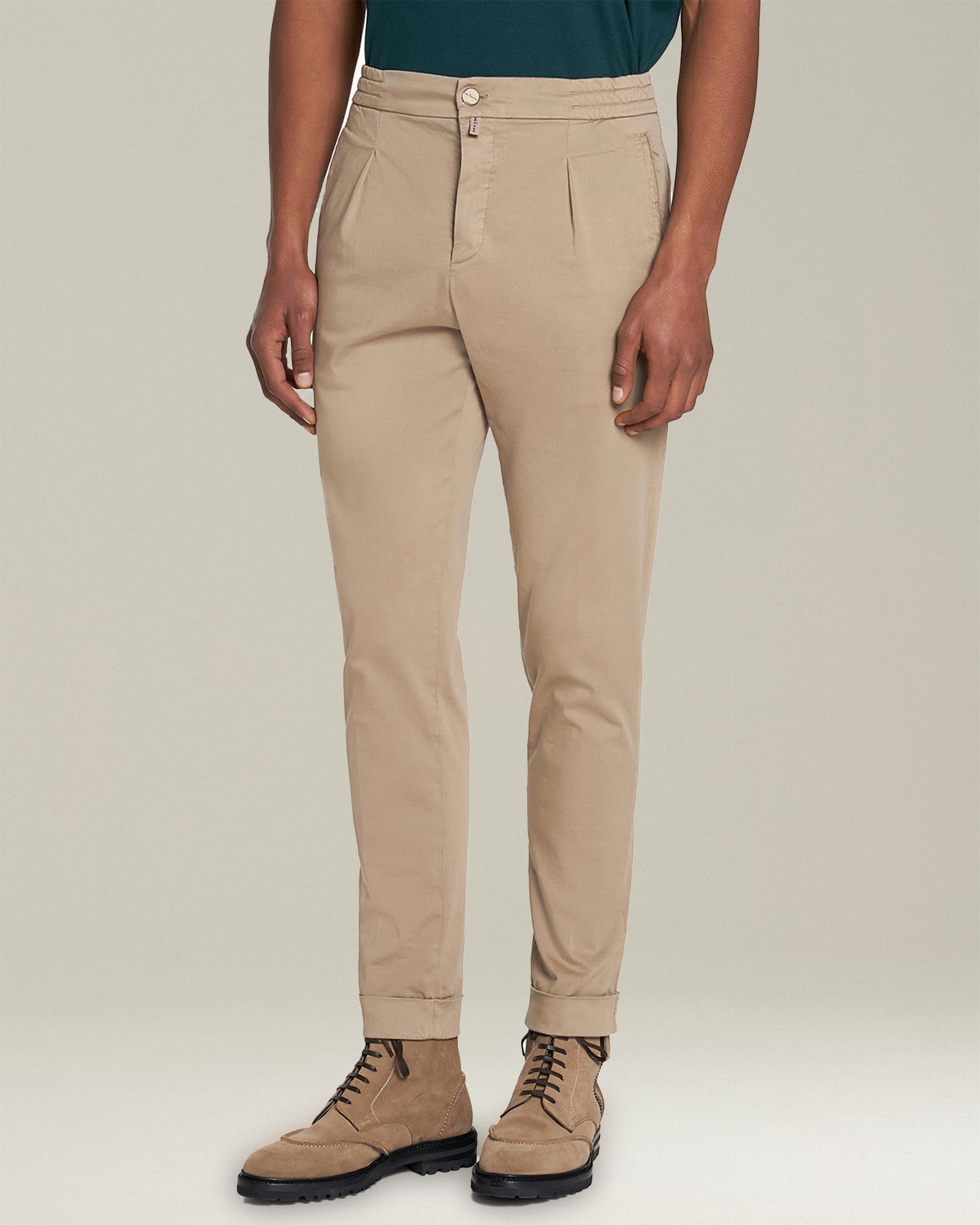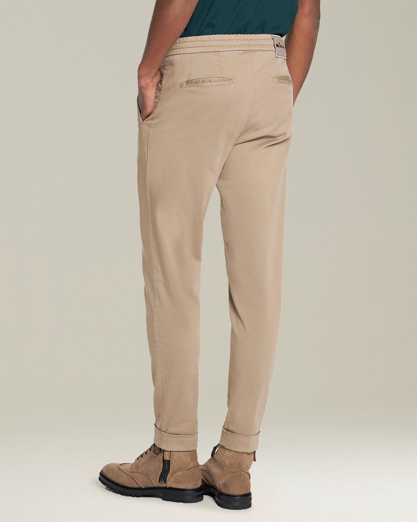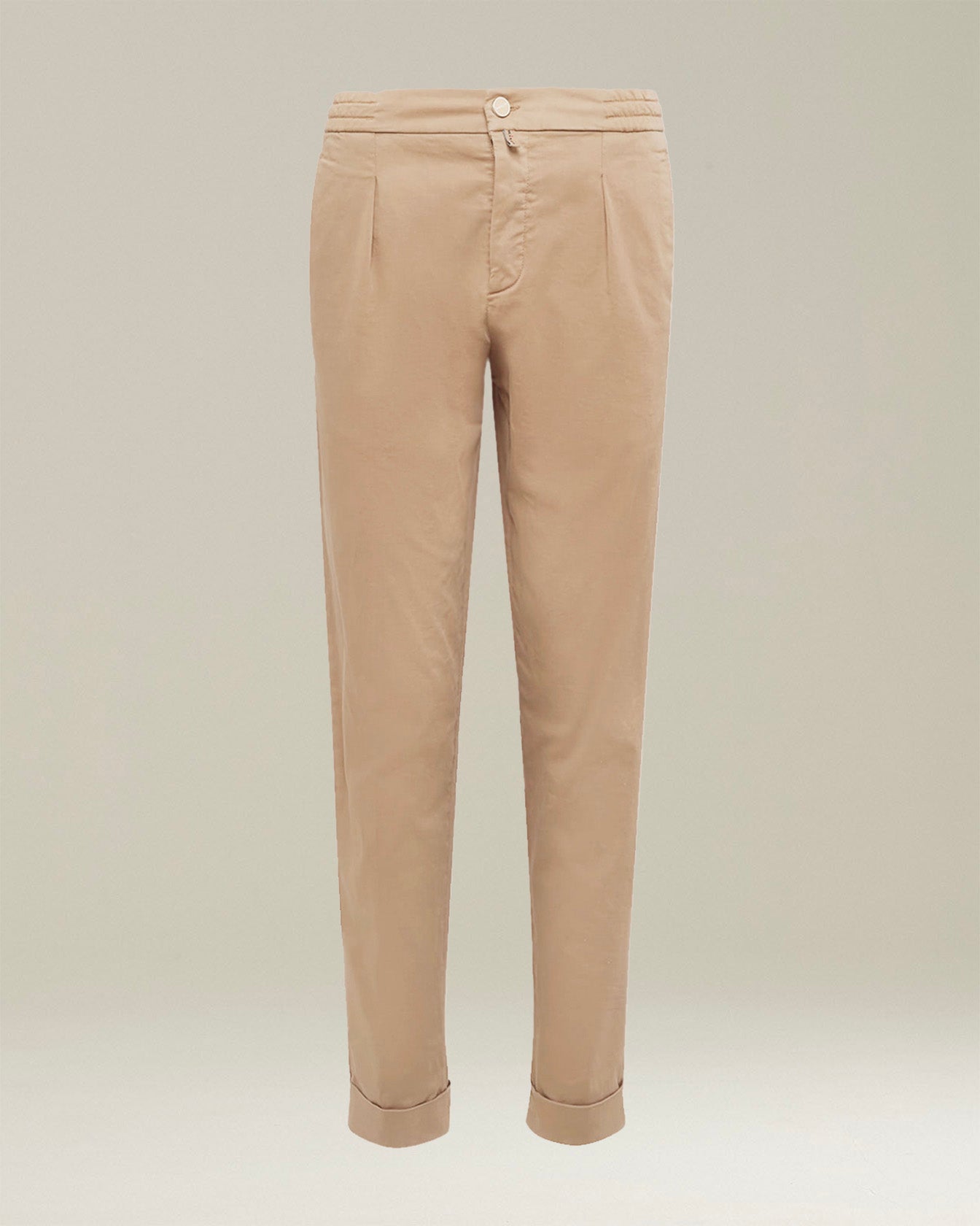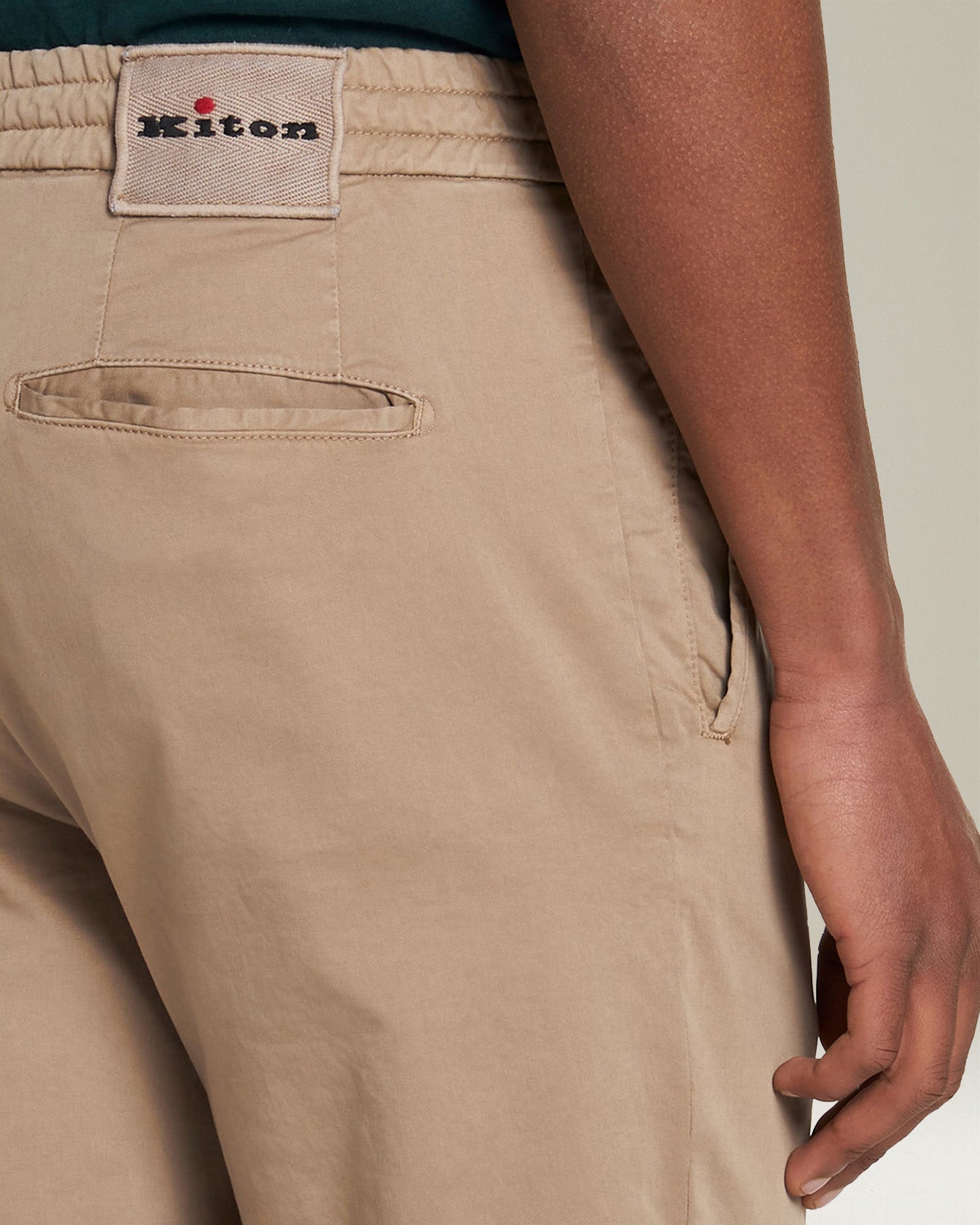 Drawstring pants in beige cotton. An icon of laid-back luxe, the Kiton trousers have been given an even more dégagé spin with a looser and more comfortable fit. It features flat pockets and an inverse pleat. The elasticated adjustable drawstring at the waist has been finished on the tip with a Kiton-lasered toggle. A small quantity of elastane gives these gorgeous jeans just the right amount of ''give'' and the fabric gently swathes the leg, flattering the figure without any sense of restriction. The trouser bottom measures 18 cm for a standard size 50. Enhanced with a light-wash treatment. We recommend washing this garment by hand inside out and at 30° C.