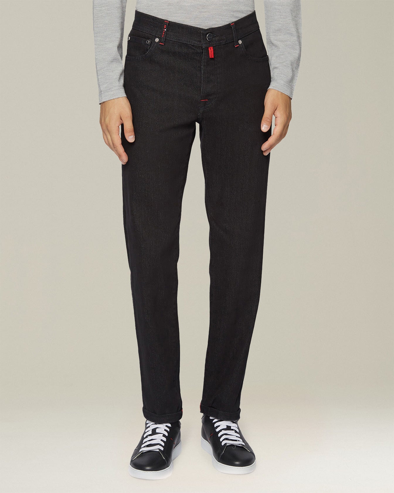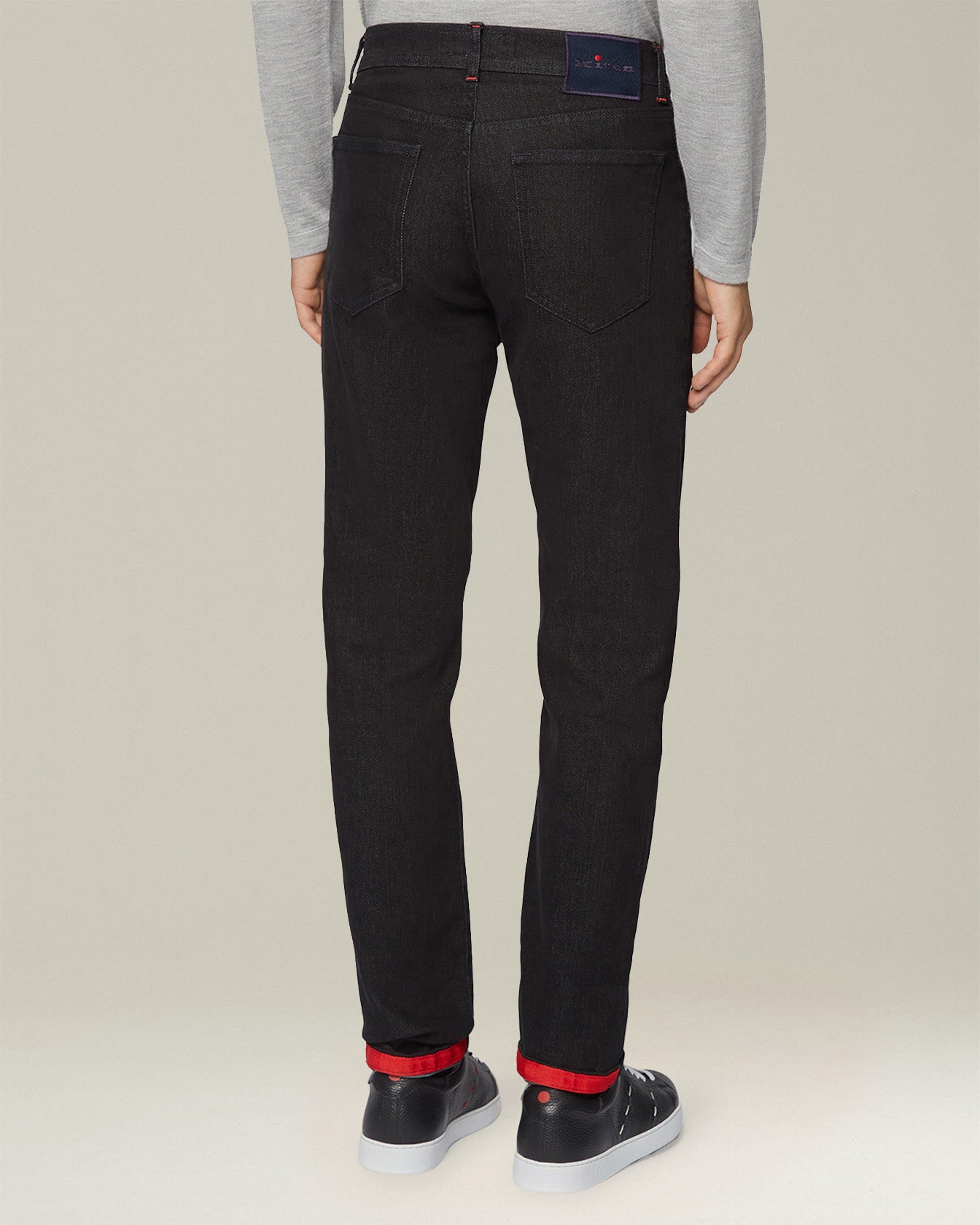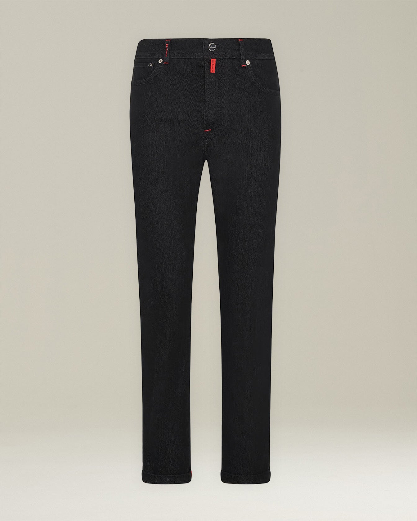 Kiton denim represents the pinnacle of sartorial mastery, where tradition and innovation merge in a timeless dialogue. A symbol of relaxed contemporary elegance, these jeans are made from organic cotton denim that combines lightness with robustness thanks to double stitching that ensures durability. The design enhances the timeless style of five-pocket trousers with a slim fit: no darts, tonal stitching, red bar tacks and contrasting red kick tape to reinforce the hem. A minimal percentage of elastane makes the jeans exceptionally comfortable, gently hugging the leg without compromising the silhouette. Essential lines for a versatile garment designed to elevate both casual chic and sporty style.
